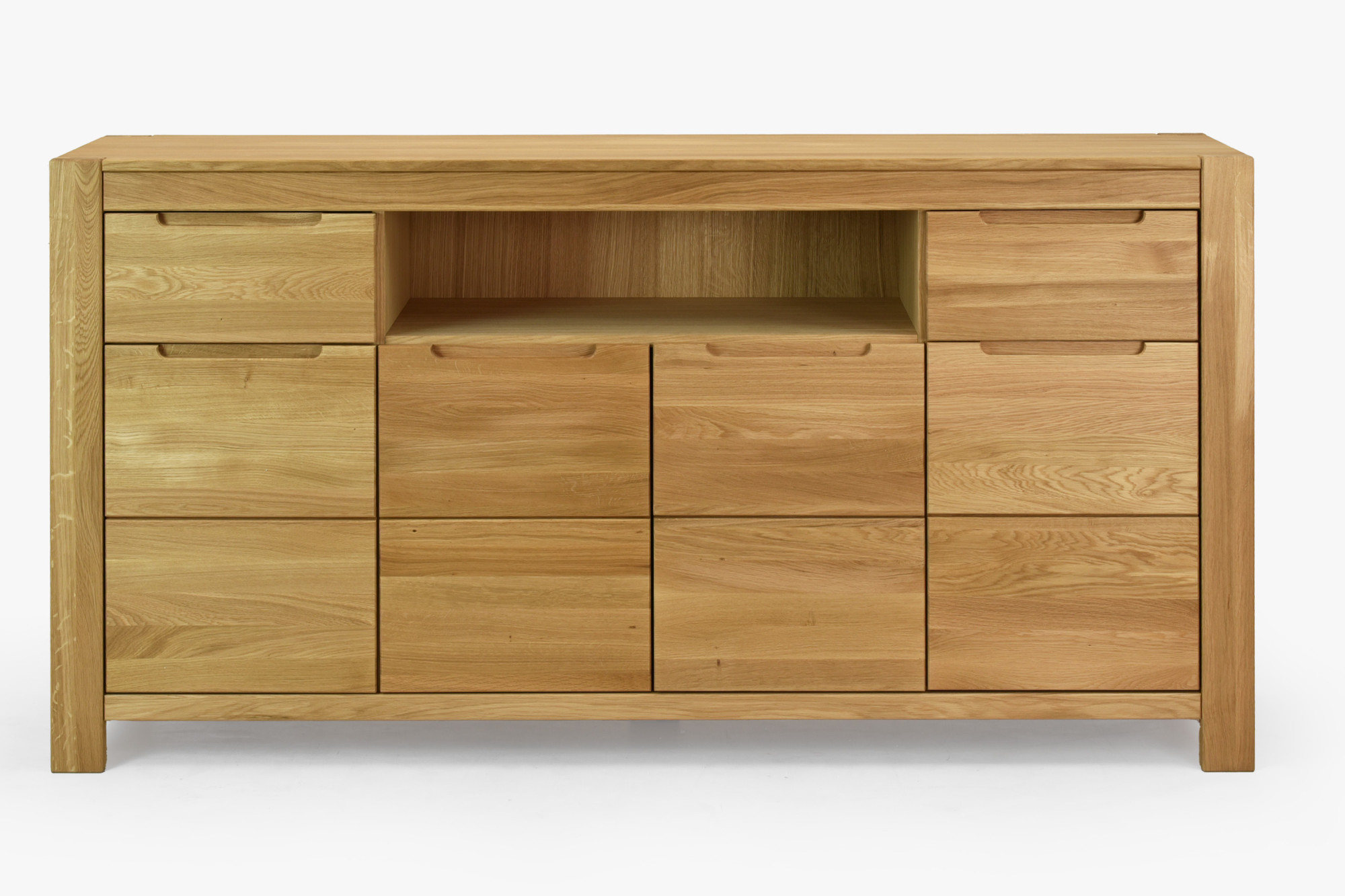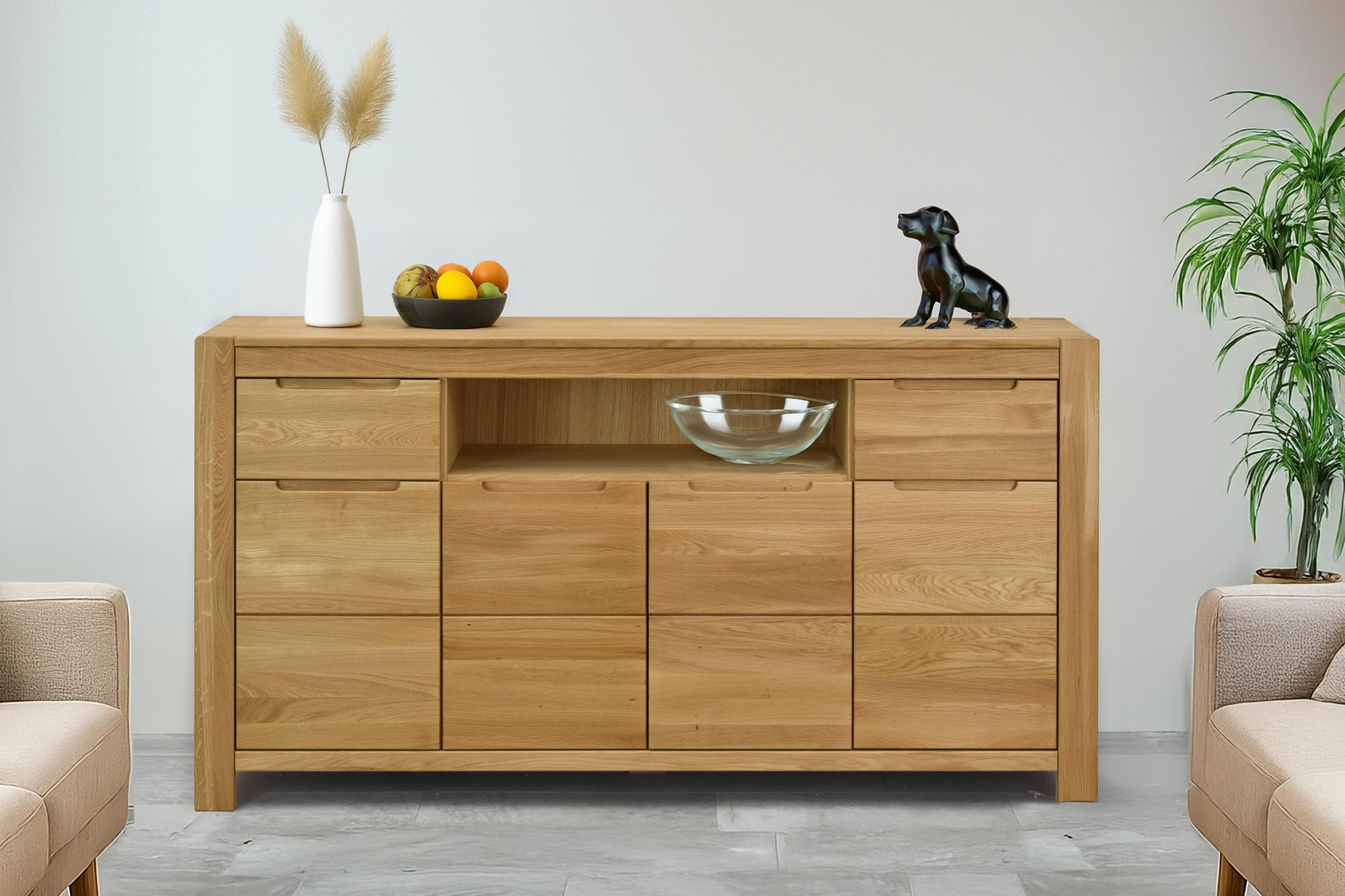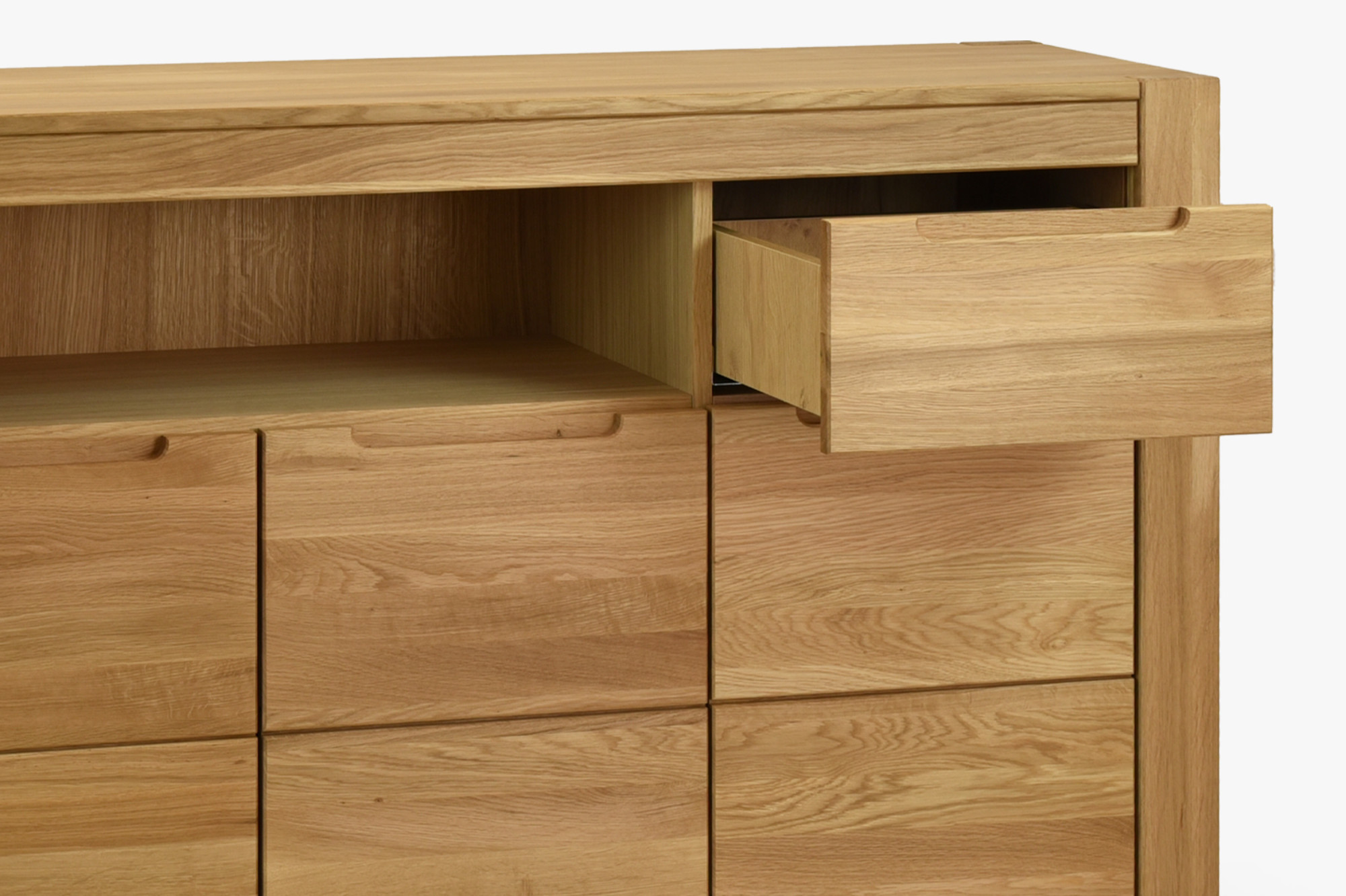 A Napolen kollekcióból származó tölgyfa komód ajtókkal, fiókokkal és nyitott polccal hálószobába, nappaliba és dolgozószobába egyaránt ideális. Négy ajtó, két mély fiók és a praktikus nyitott rekesz tökéletes helyet kínálnak ruháknak, edényeknek és dekorációknak. A beépített fogantyúk nem törik meg a tiszta vonalakat, és a soft‑close mechanika biztosítja a csendes, ütközésmentes záródást.