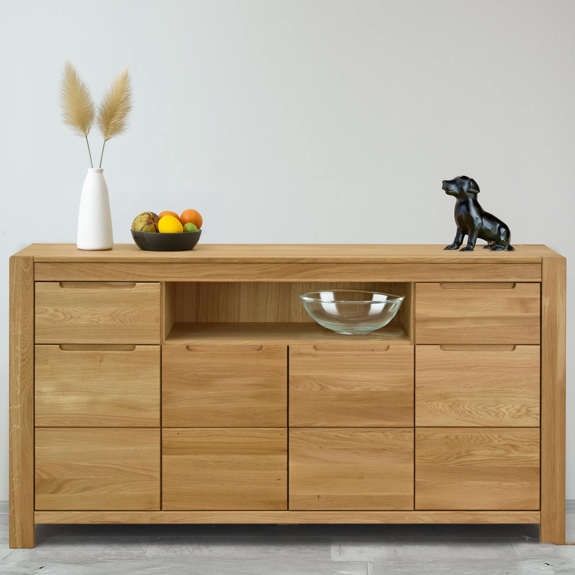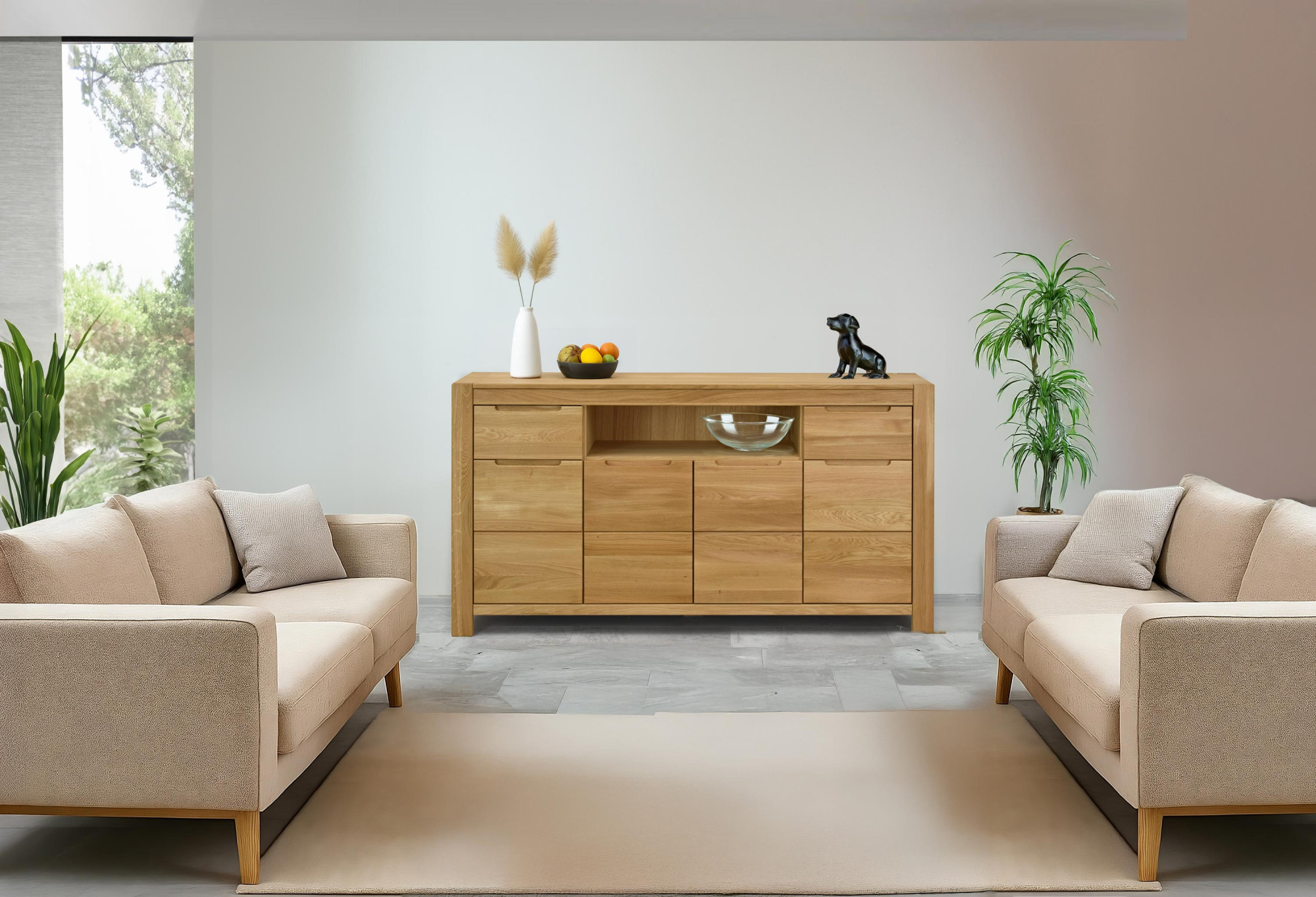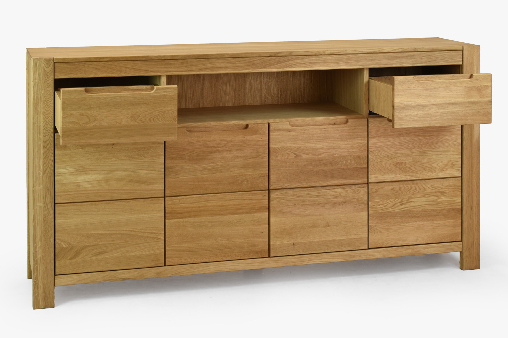 A Napolen kollekcióból származó tölgyfa komód ajtókkal, fiókokkal és nyitott polccal hálószobába, nappaliba és dolgozószobába egyaránt ideális. Négy ajtó, két mély fiók és a praktikus nyitott rekesz tökéletes helyet kínálnak ruháknak, edényeknek és dekorációknak. A beépített fogantyúk nem törik meg a tiszta vonalakat, és a soft‑close mechanika biztosítja a csendes, ütközésmentes záródást.