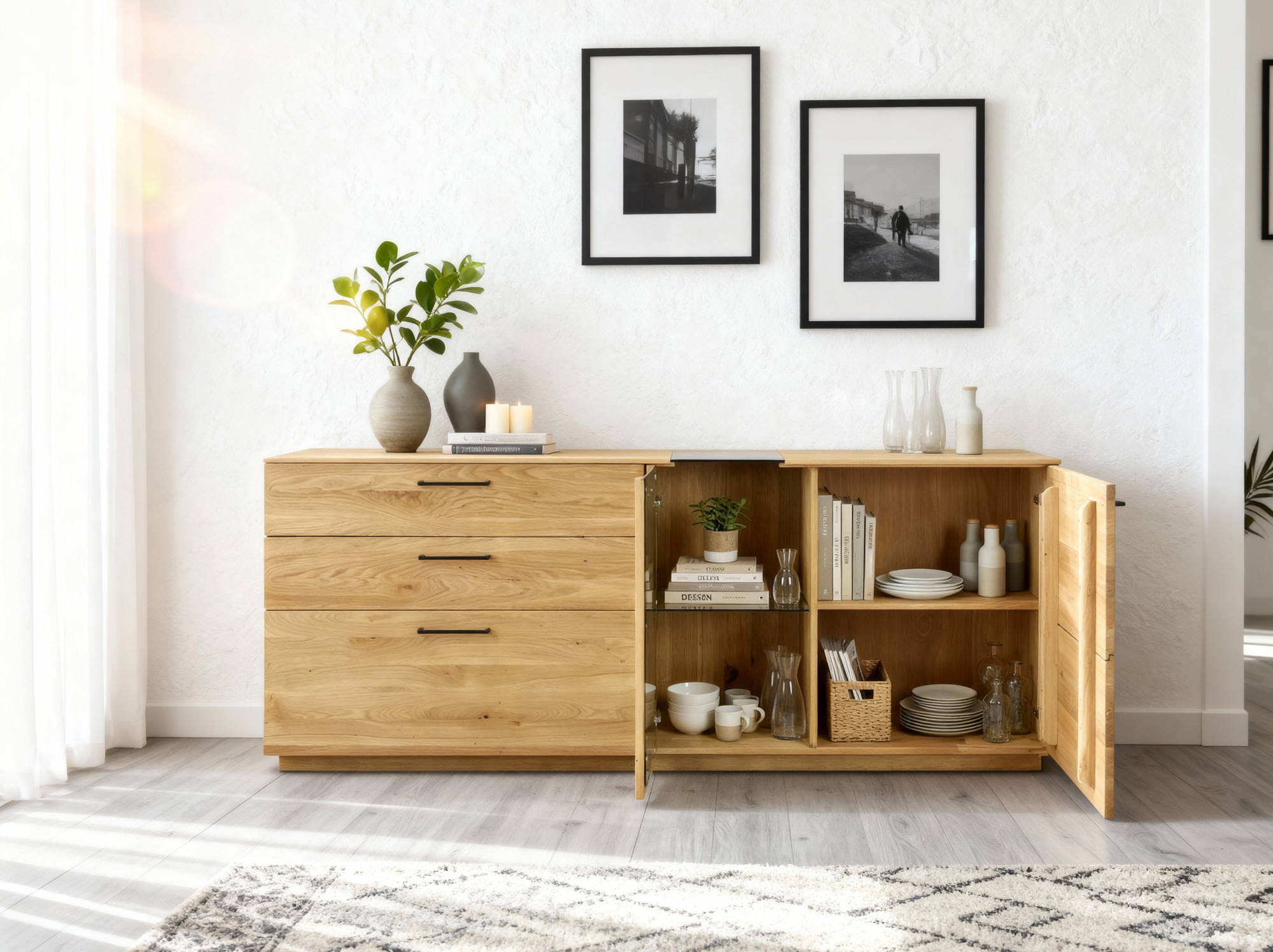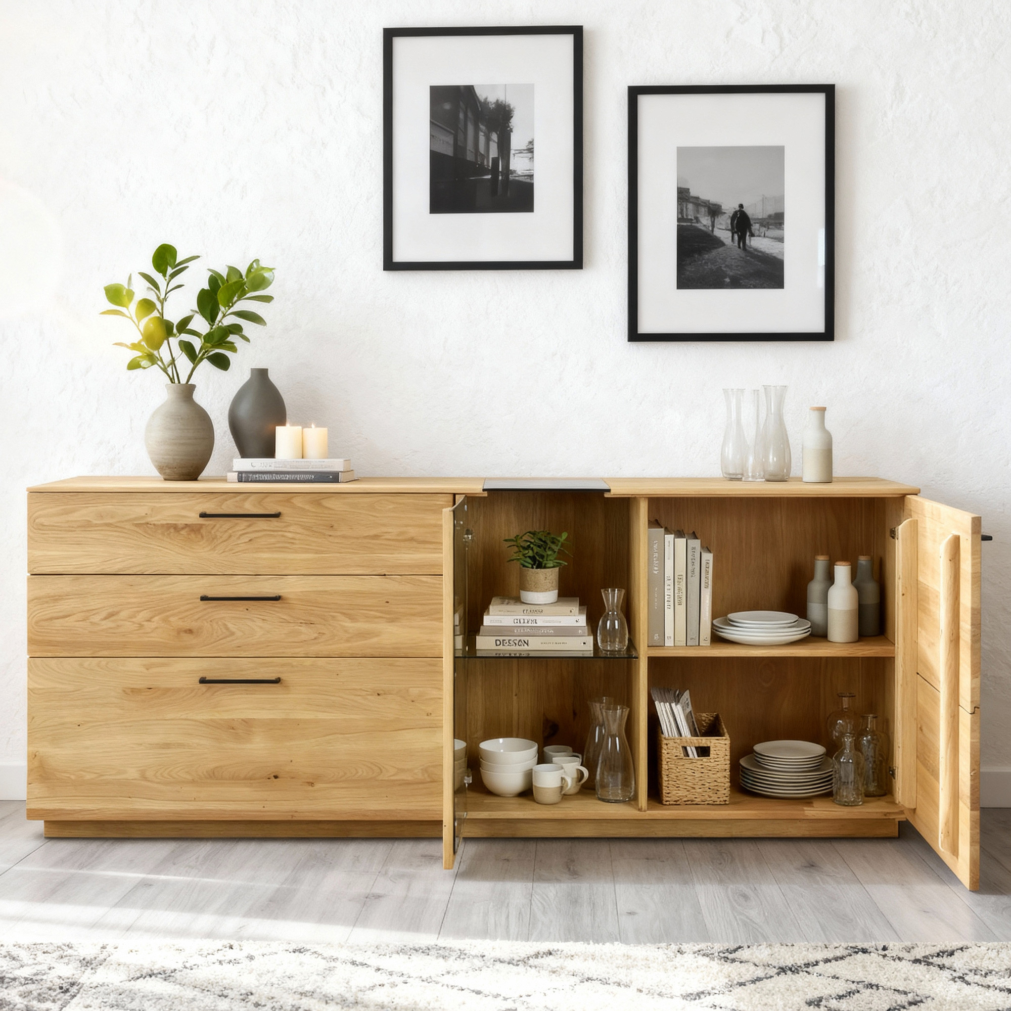 Tölgyfa komód 191 cm üveggel – elegáns tárolóhely a nappaliba