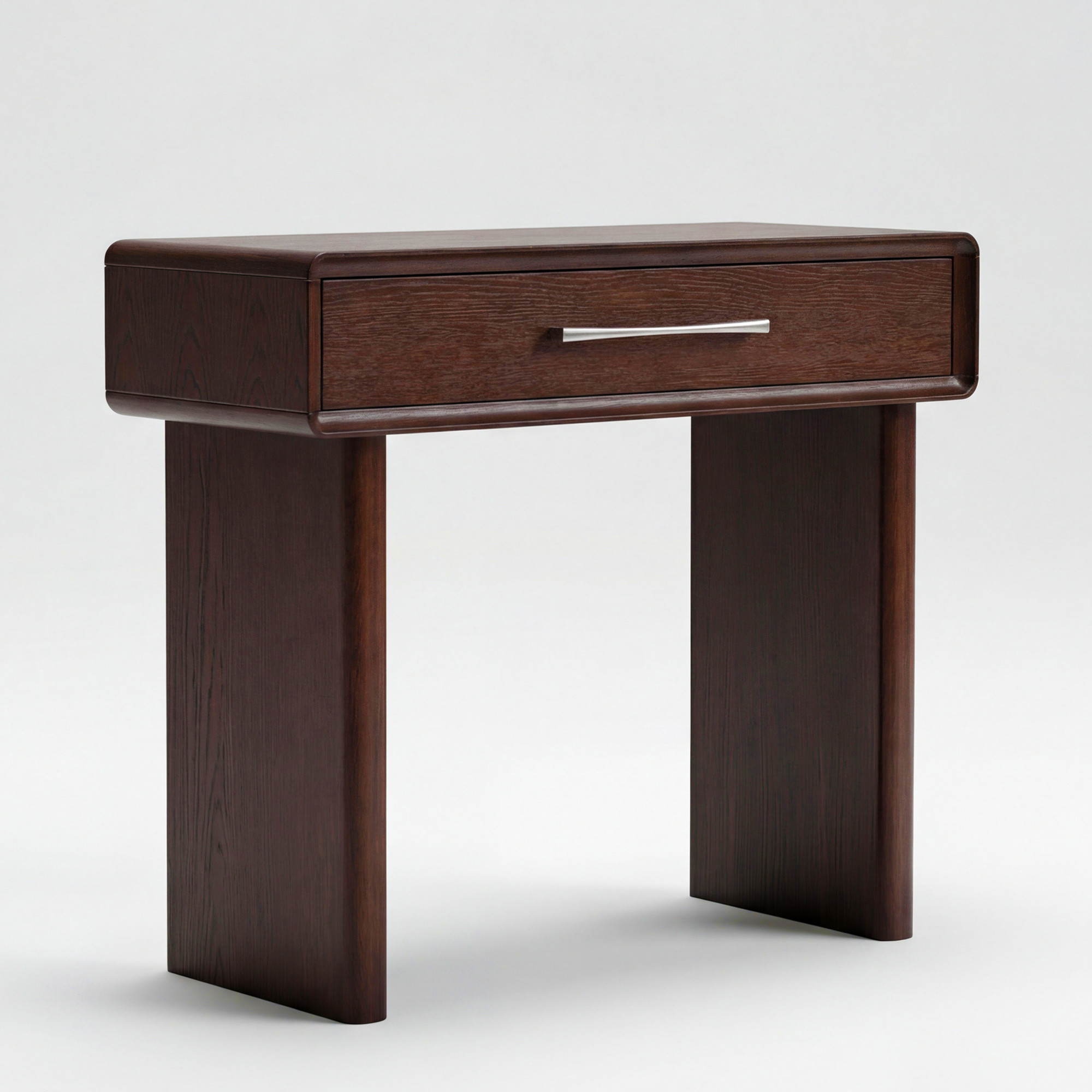 A konzolasztal tömör fa lábakon áll, amelyek stabilitást és robusztus megjelenést kölcsönöznek a bútornak. A tágas fiók ideális kulcsok, apróságok vagy egyéb, gyakran használt tárgyak tárolására. A fiók soft-close rendszerrel van ellátva a csendes, sima záródás érdekében. A fém fogantyú modern kivitelezése kiemeli az egész darab exkluzív dizájnját. A felületet matt lakk védi, amely hatékonyan óvja a fát és szépen kiemeli annak természetes struktúráját.