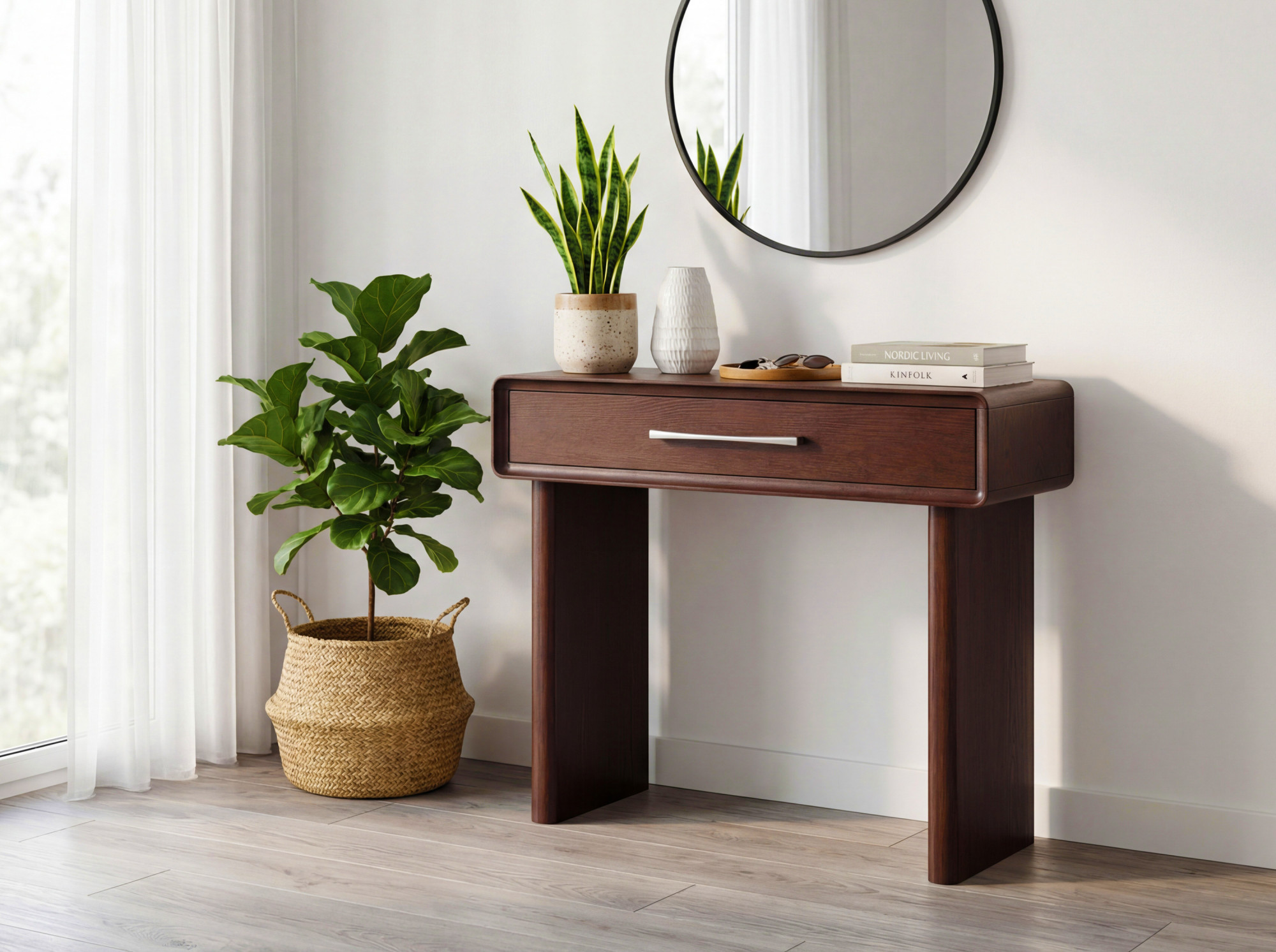 Bemutatjuk Önnek design konzolasztalt Koper fiókkal, amely az elegáns minimalizmust a praktikus funkcionalitással ötvözi. Ez a stílusos konzolasztal meleg diószínben ideális előszobába, folyosóra, nappaliba vagy hálószobába. Kompakt méreteinek köszönhetően kisebb helyekre is befér, miközben helyet biztosít a tárgyak elhelyezésére és további tárolást a fiókban. A teljes bútor prémium tölgy furnérból készült tömör tölgy élekkel, ami rendkívüli szilárdságot és hosszú élettartamot garantál. A lekerekített élek modern jelleget kölcsönöznek az asztalnak, és növelik a biztonságot a lakásban.
