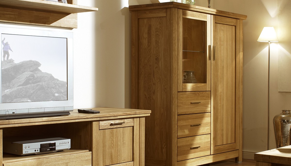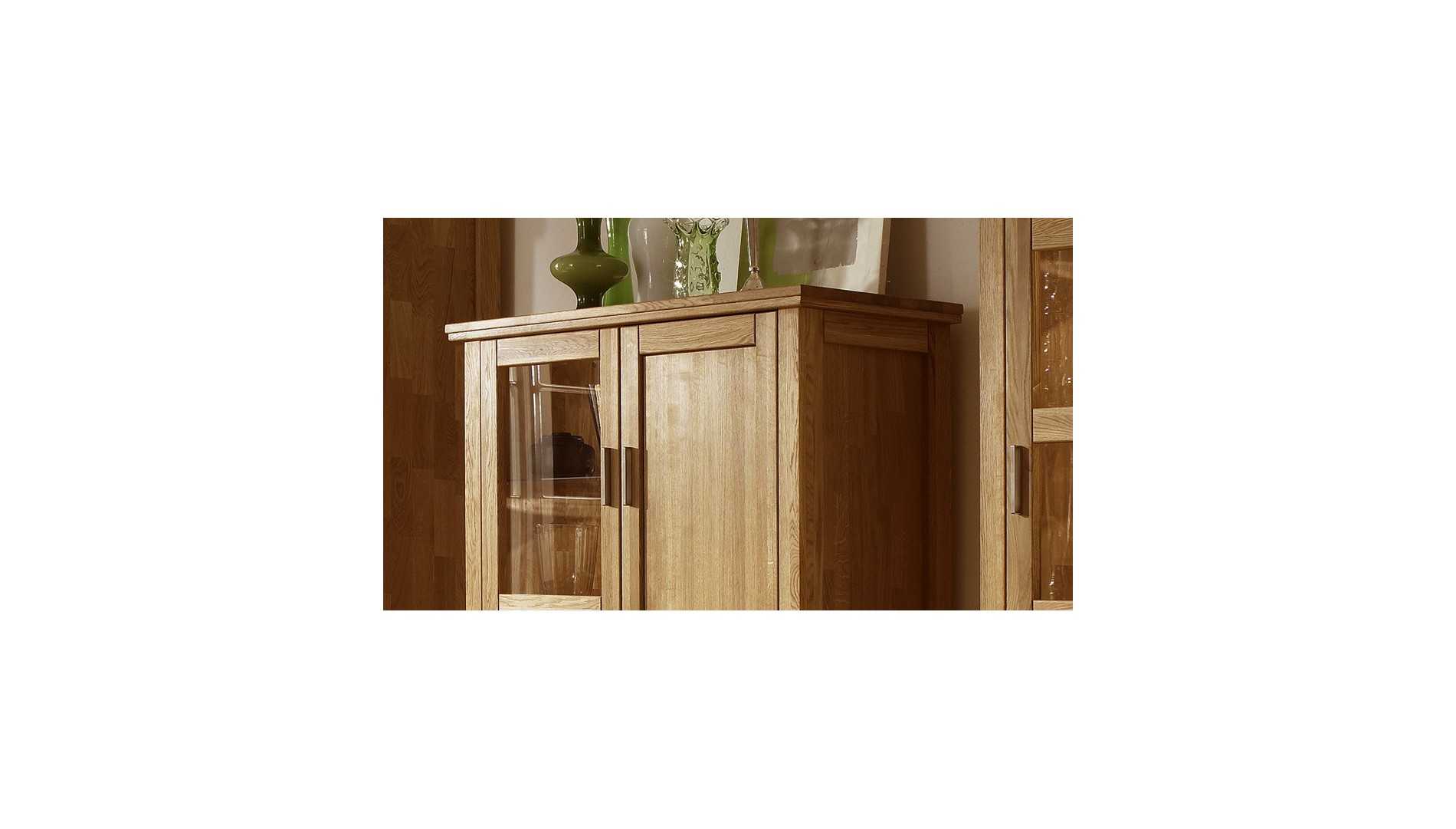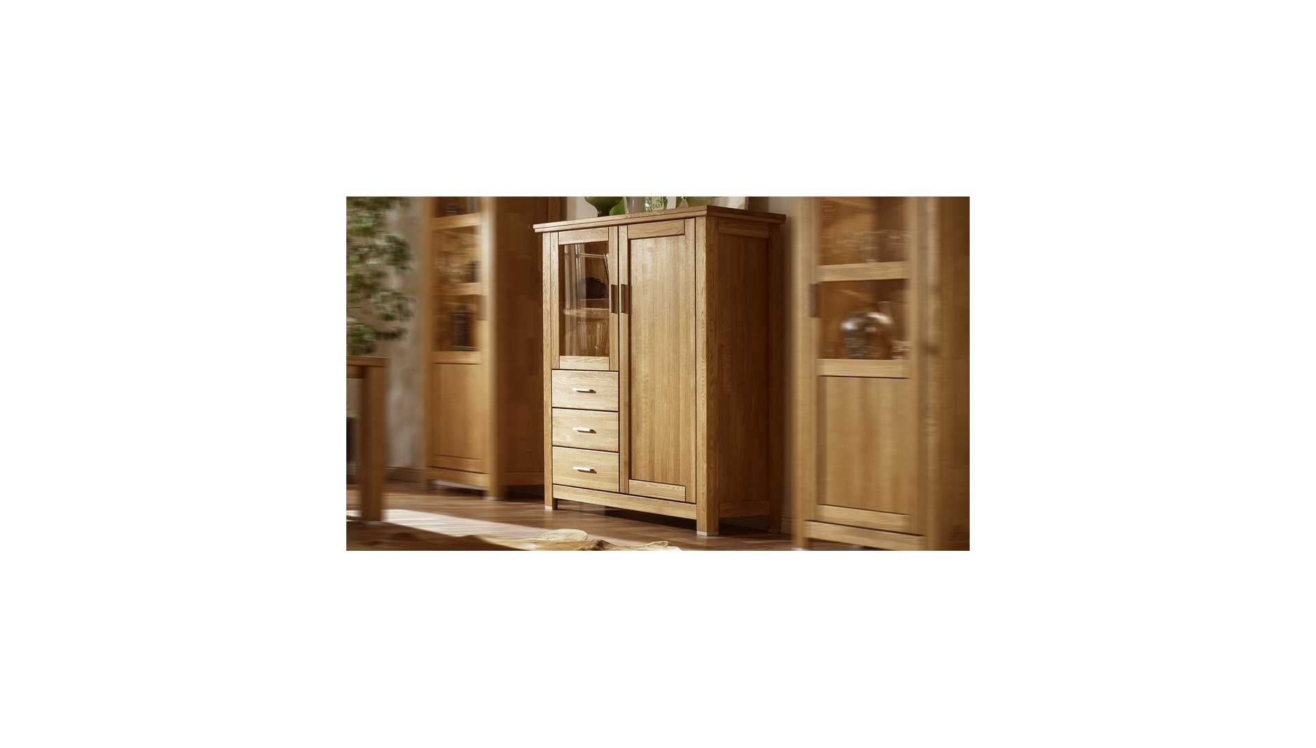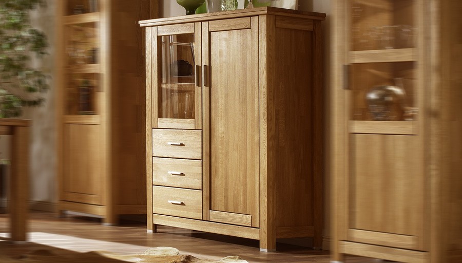 Tömör tölgyfa komód üvegajtóval és fiókokkal nappaliba, tölgy színű
