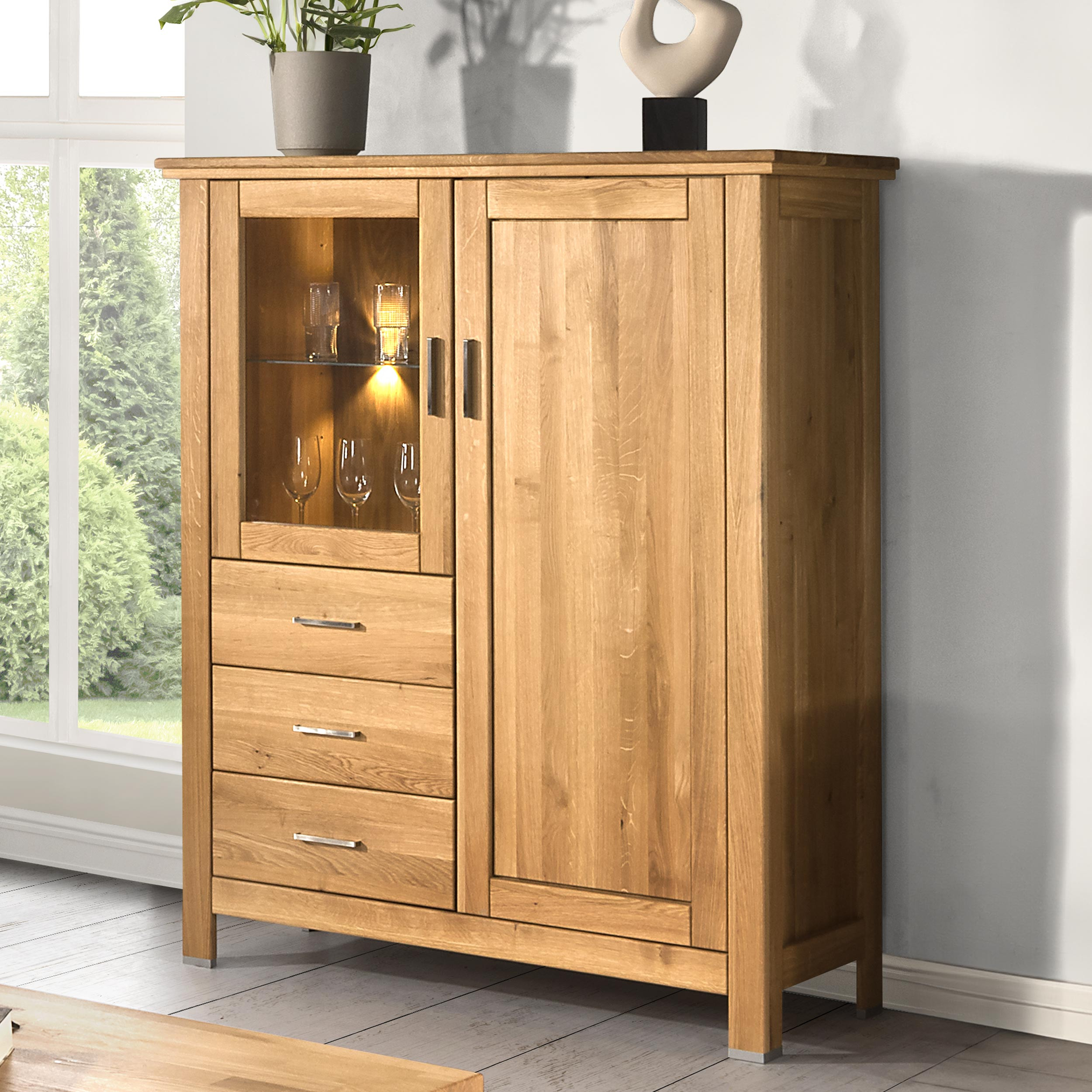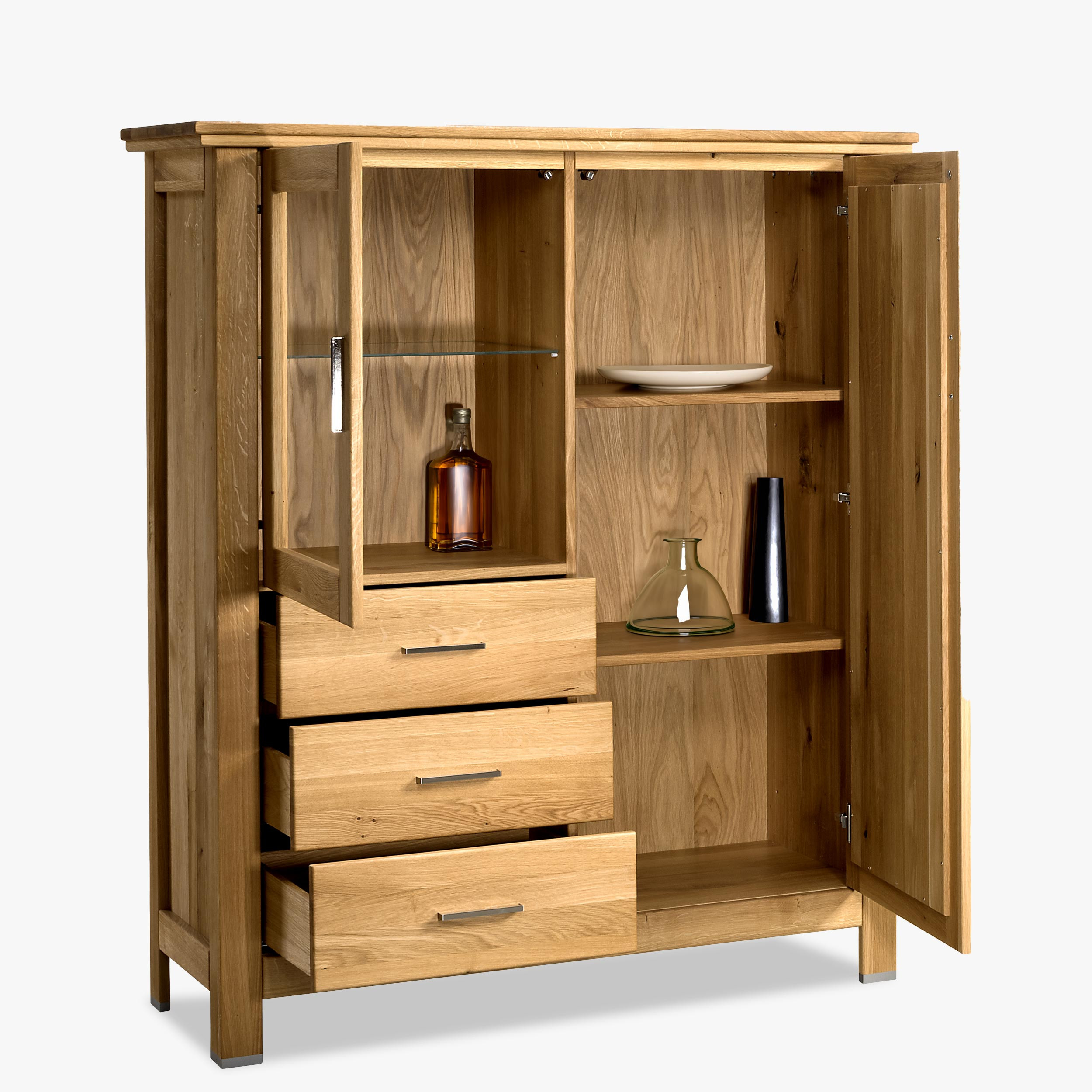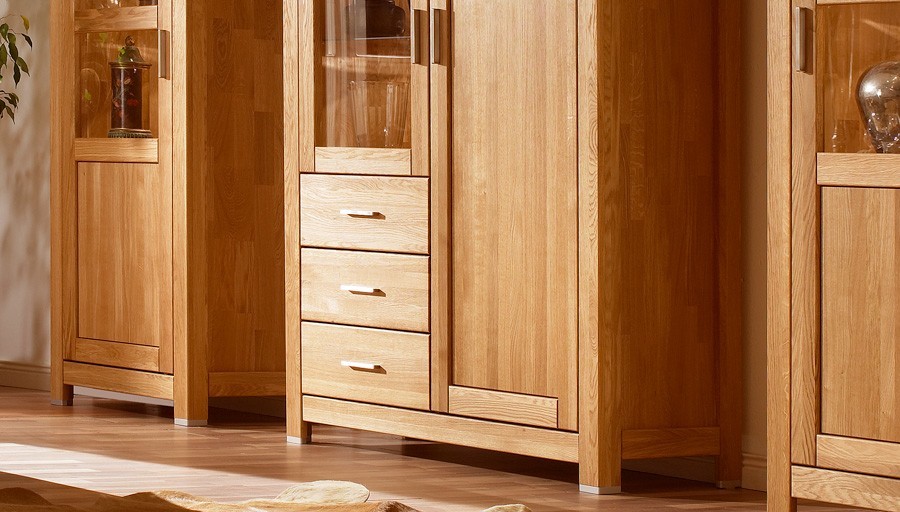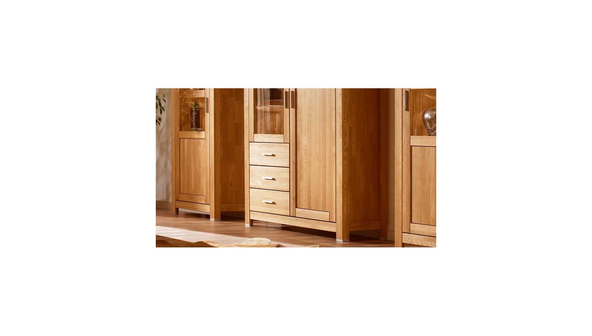Tömör tölgyfa komód üvegajtóval és fiókokkal nappaliba, tölgy színű