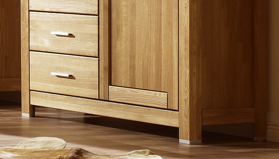 Teljesen tömör komód két részre oszlik. Jobb oldalon egy tágas szekrény két fa polccal található. Bal oldalon egy rész üveges ajtókkal és üvegpolccal, alatta pedig 3 fiók van. A szekrényajtók és a fiókok hosszúkás fém fogantyúkkal és soft-close csendes záródási rendszerrel vannak ellátva, amely a kényelmes bezárást és a zavartalan működést garantálja még évek múltán is. A fogantyúk formája szépen illeszkedik a bútor egyenes vonalaihoz.