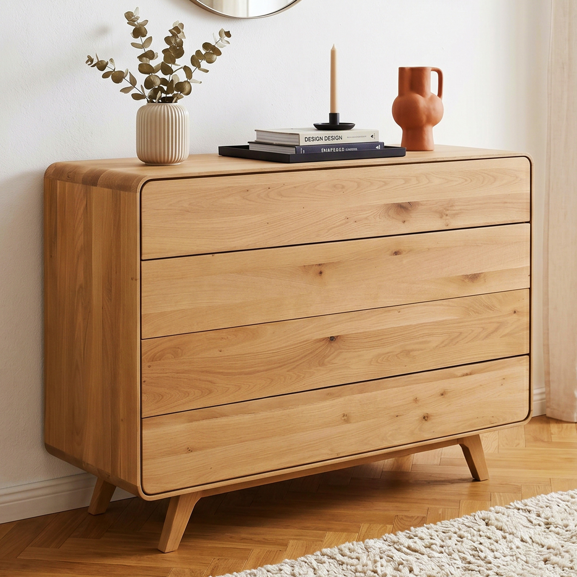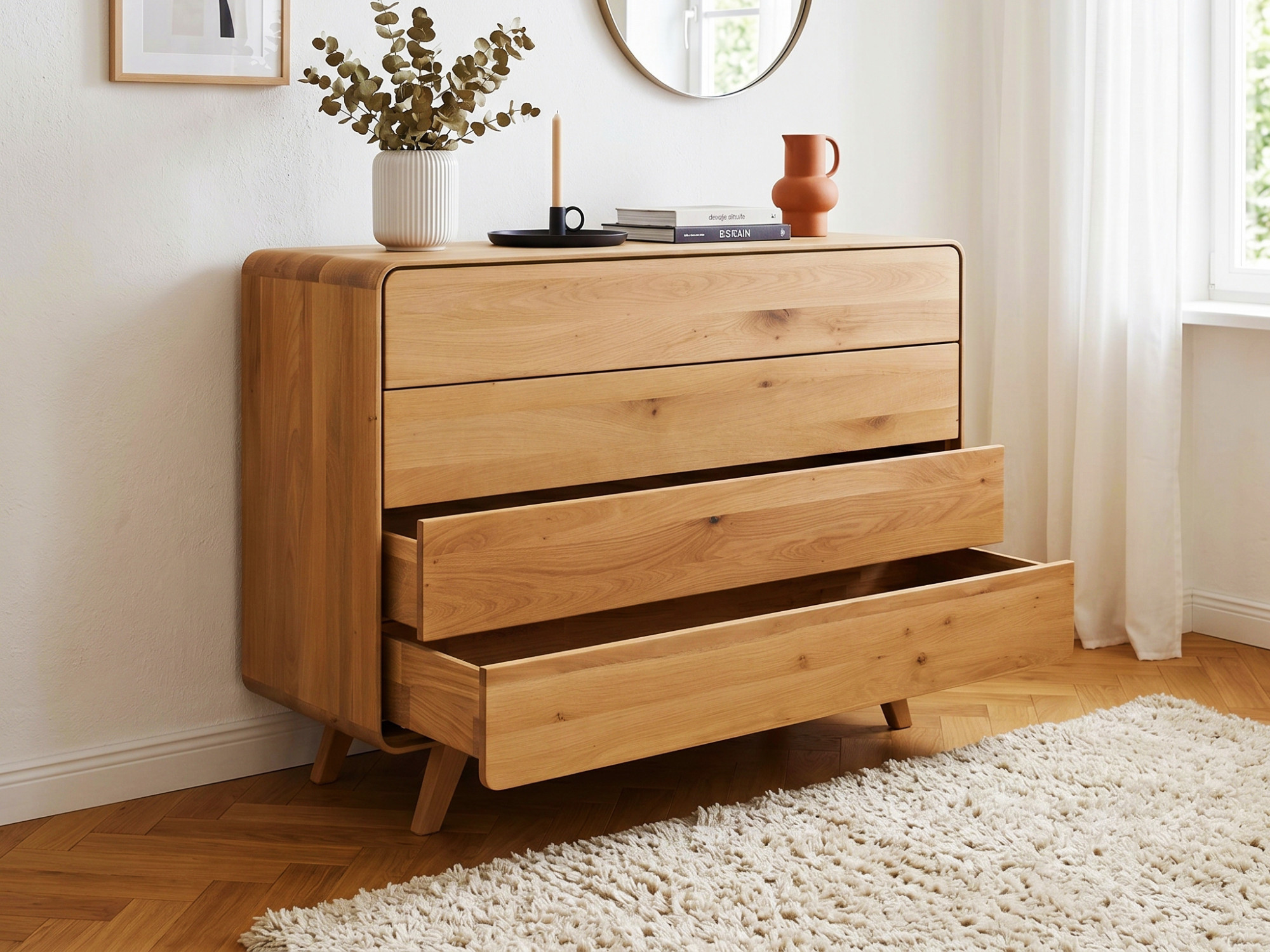 A komód 4 tágas fiókot kínál, soft-close rendszerrel felszerelve, amely csendes és sima záródást biztosít. A fiókok belső szélessége 117 cm, magasságuk pedig 18 cm, így kényelmesen elfér bennük ruha, textilek és egyéb hasznos dolgok. A felületet természetes olajjal kezelték, amely kiemeli a tömör tölgy egyedi erezetét, és megbízható védelmet nyújt a mindennapi használat során. Az olajozott felület lehetővé teszi, hogy a fa "lélegezzen", és szükség esetén könnyen felújítható. A komódot már összeszerelve szállítjuk – a vásárlónak csak a 13 cm magas lábakat kell a helyszínen felszerelni. Tökéletesen kombinálható az Avalon kollekció további darabjaival, amivel harmonikusan összehangolt nappali vagy hálószoba alakítható ki.