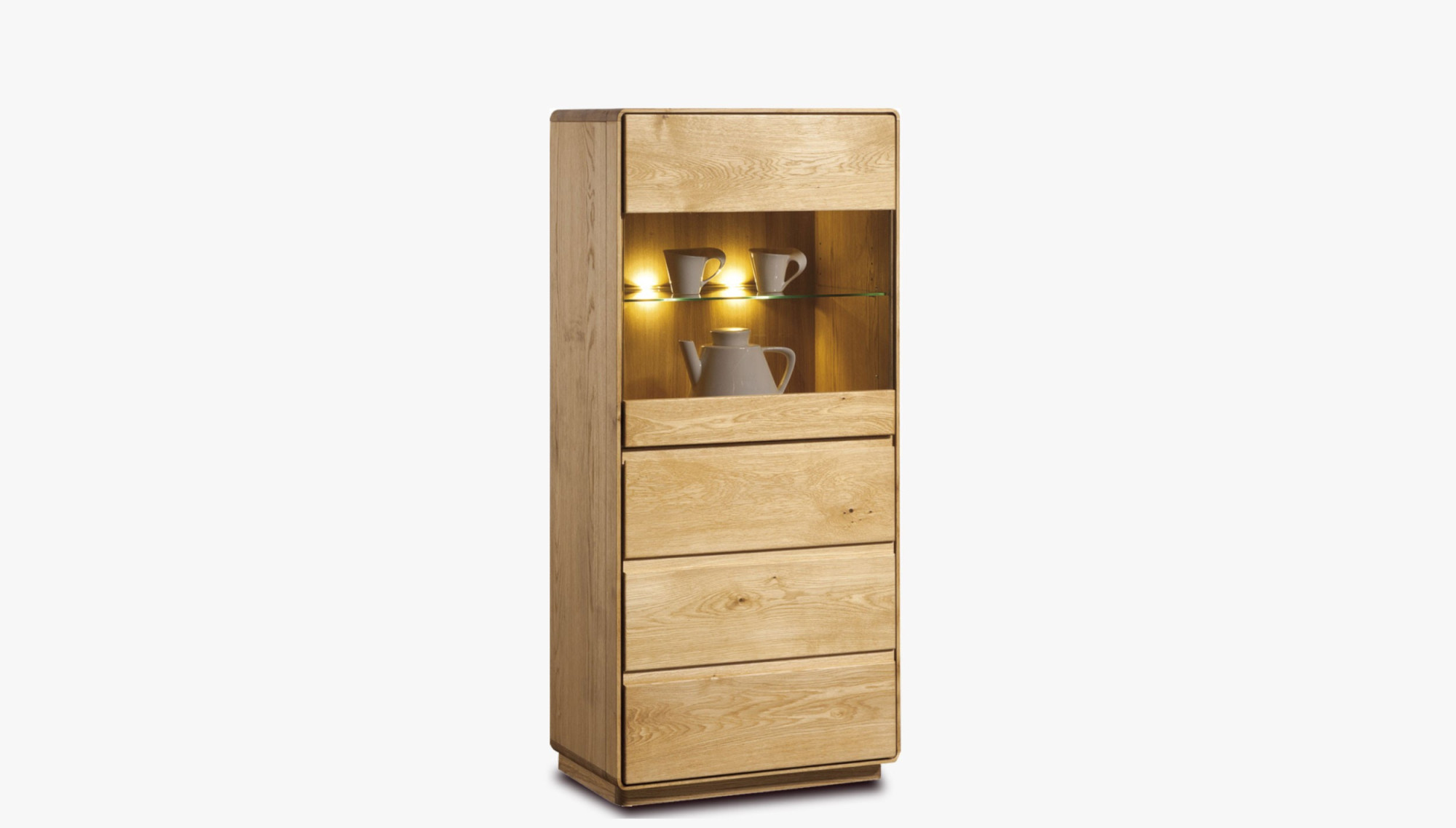 A jellegzetes vad tölgy erezetének, a kiváló kézműves kidolgozásnak és a kellemes illatnak köszönhetően, amely betölti az egész helyiséget, szó szerint beleszeret a vitrinnel! A neves külföldi formatervező koncepciója levegős stílust adott a vitrineknek: minimalista megközelítést, sima felületeket és finoman lekerekített éleket. A légies hatást tökéletesen fokozza a fogantyú nélküli nyitási rendszer ajtók.