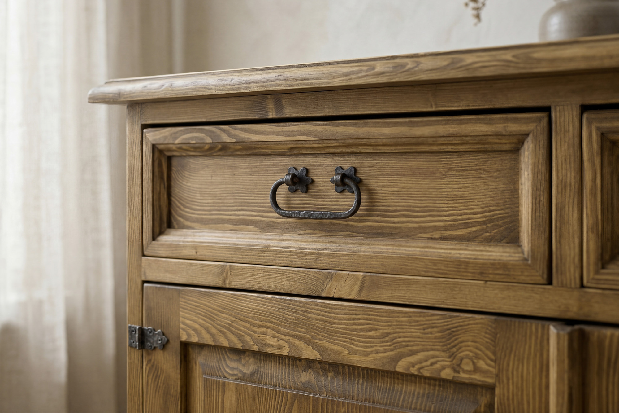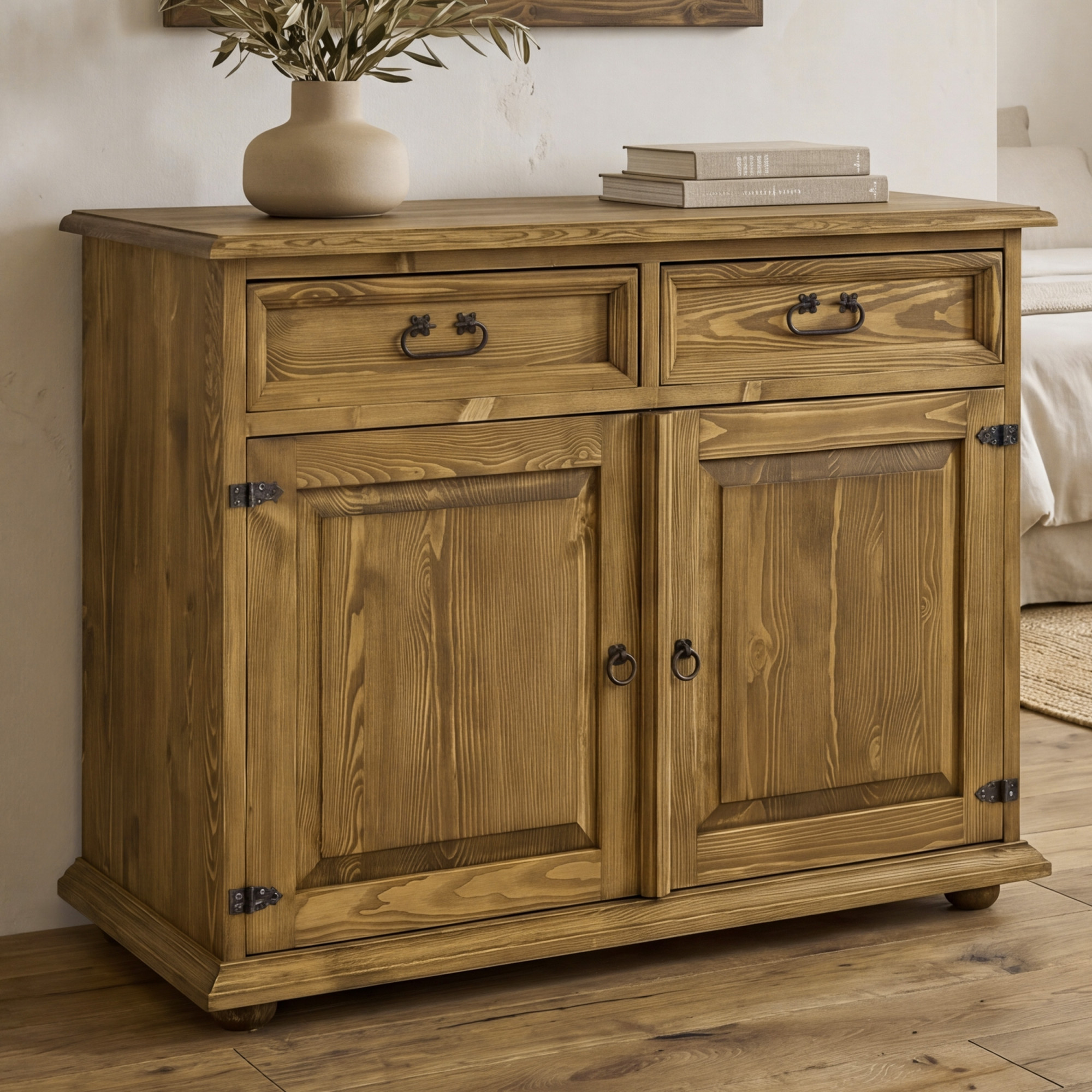 A komód tömör fenyőfából készül, amely erős, tartós, és ideális a rusztikus bútorok gyártásához.