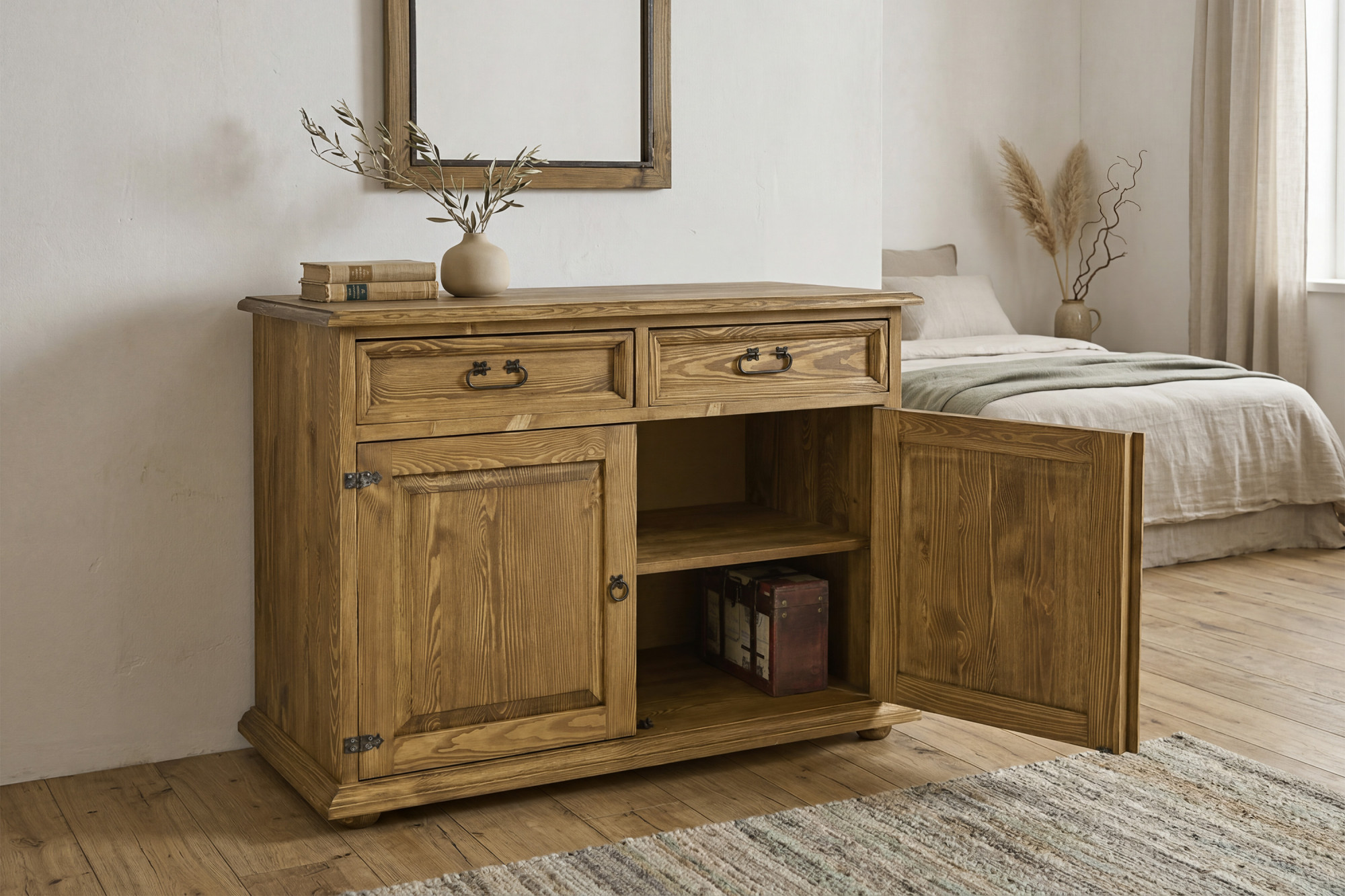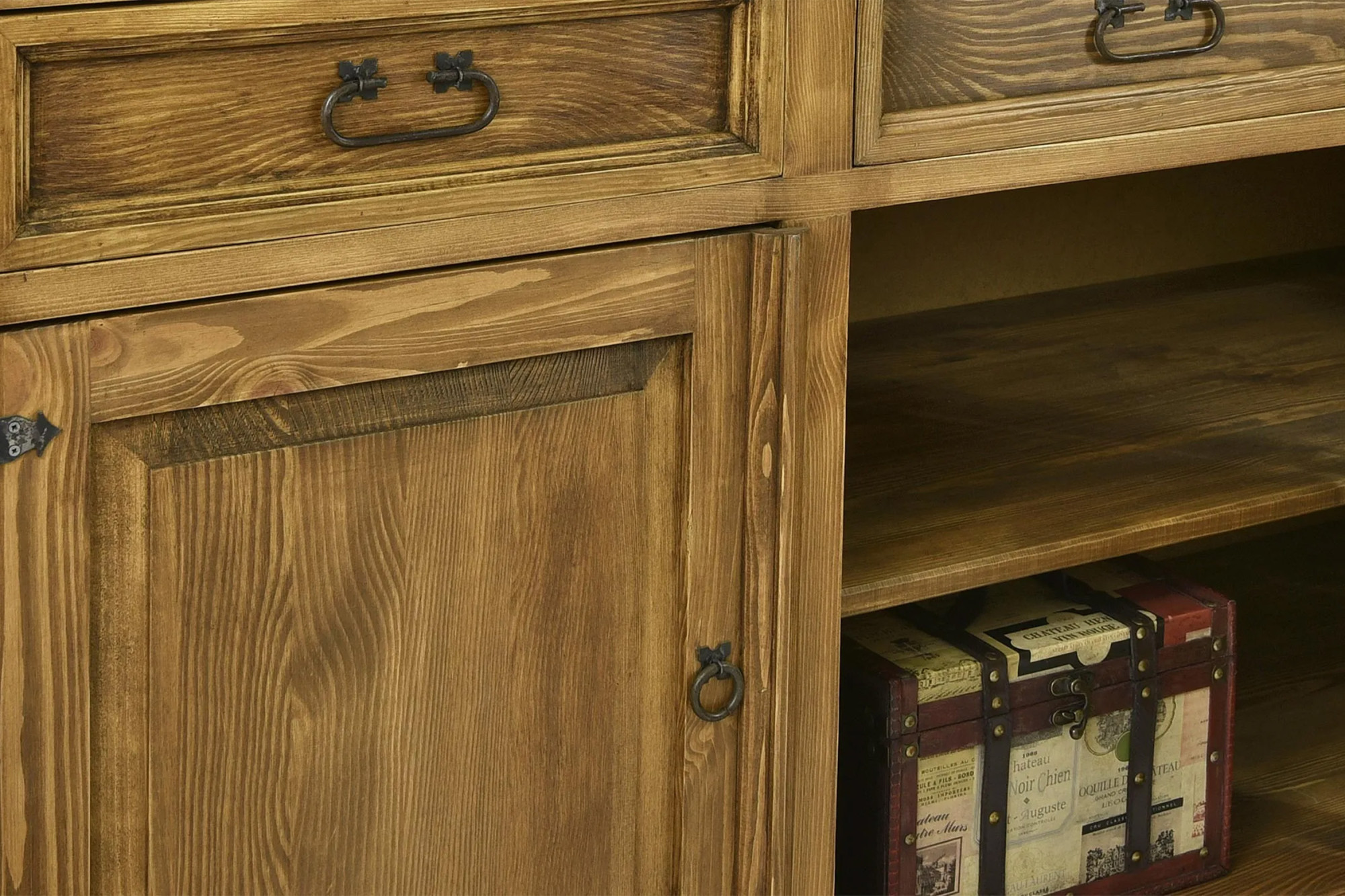 Ez a tömörfából készült komód ideális választás azoknak, akik karakteres, minőségi bútort keresnek. Ötvözi a praktikus belső elrendezést, a tartós fenyőfát, a hagyományos megjelenést és az összeszerelt kivitel előnyeit. Kiváló szolgálatot tesz hálószobai komódként, étkezői komódként vagy otthona bármely részének elegáns bútordarabjaként.