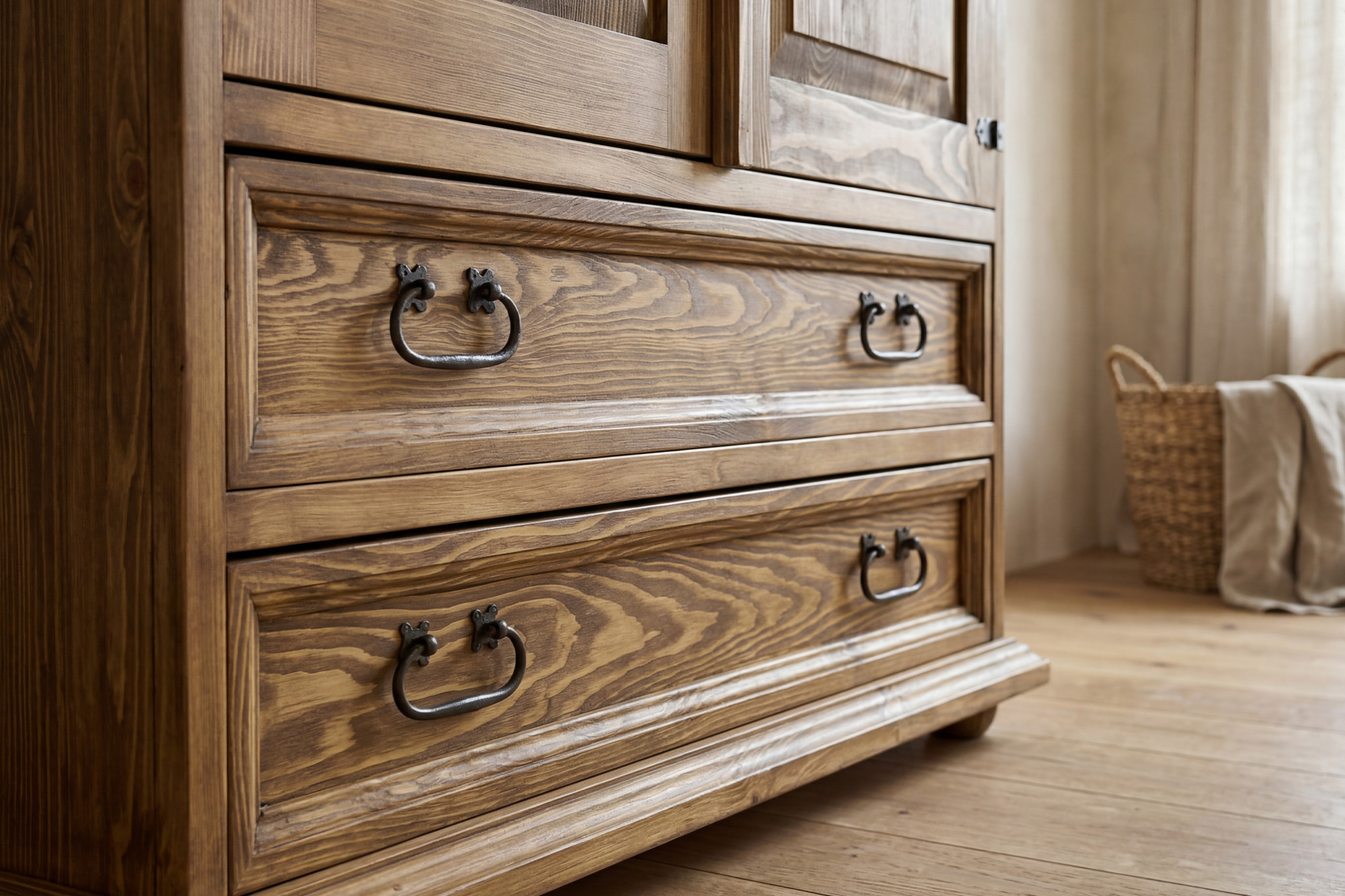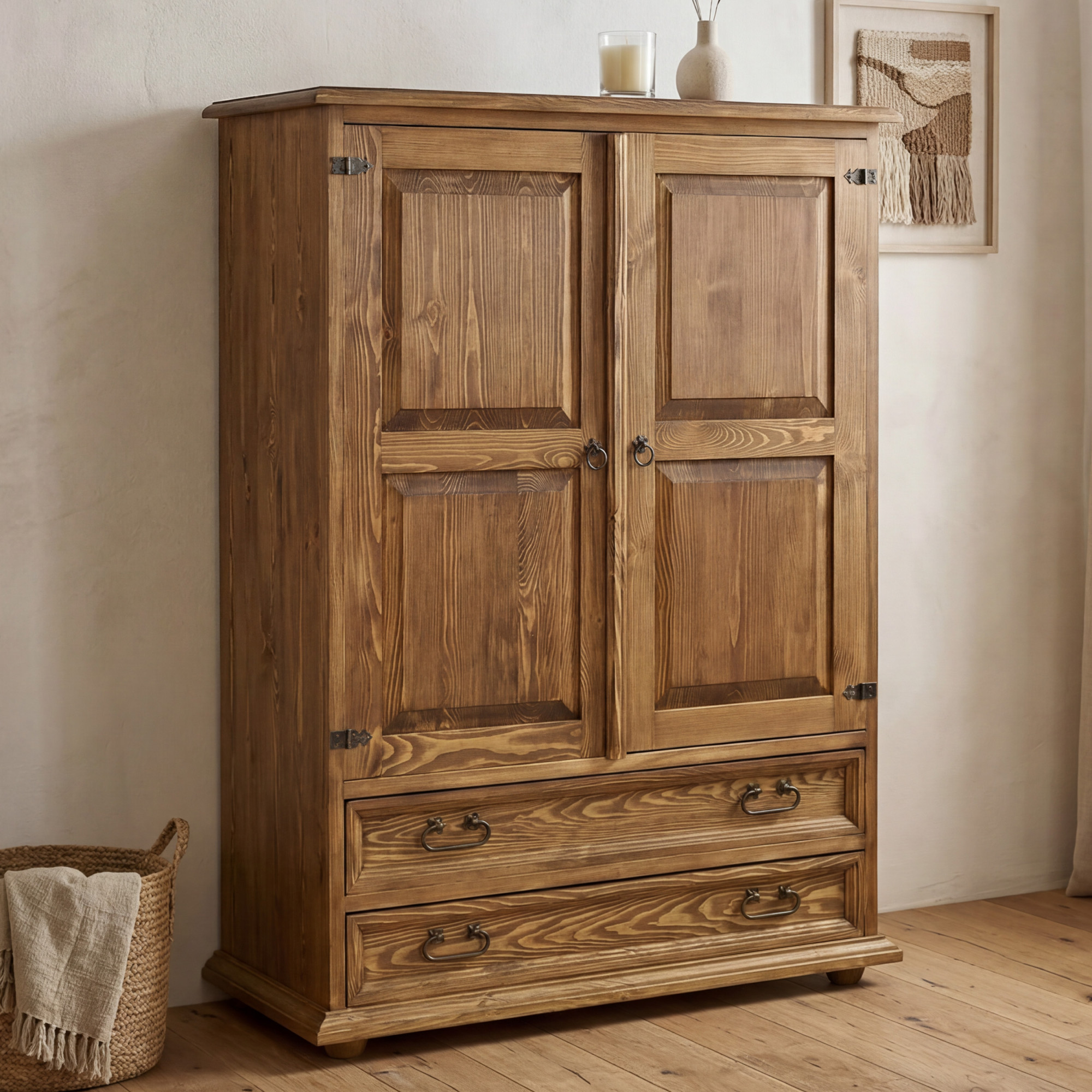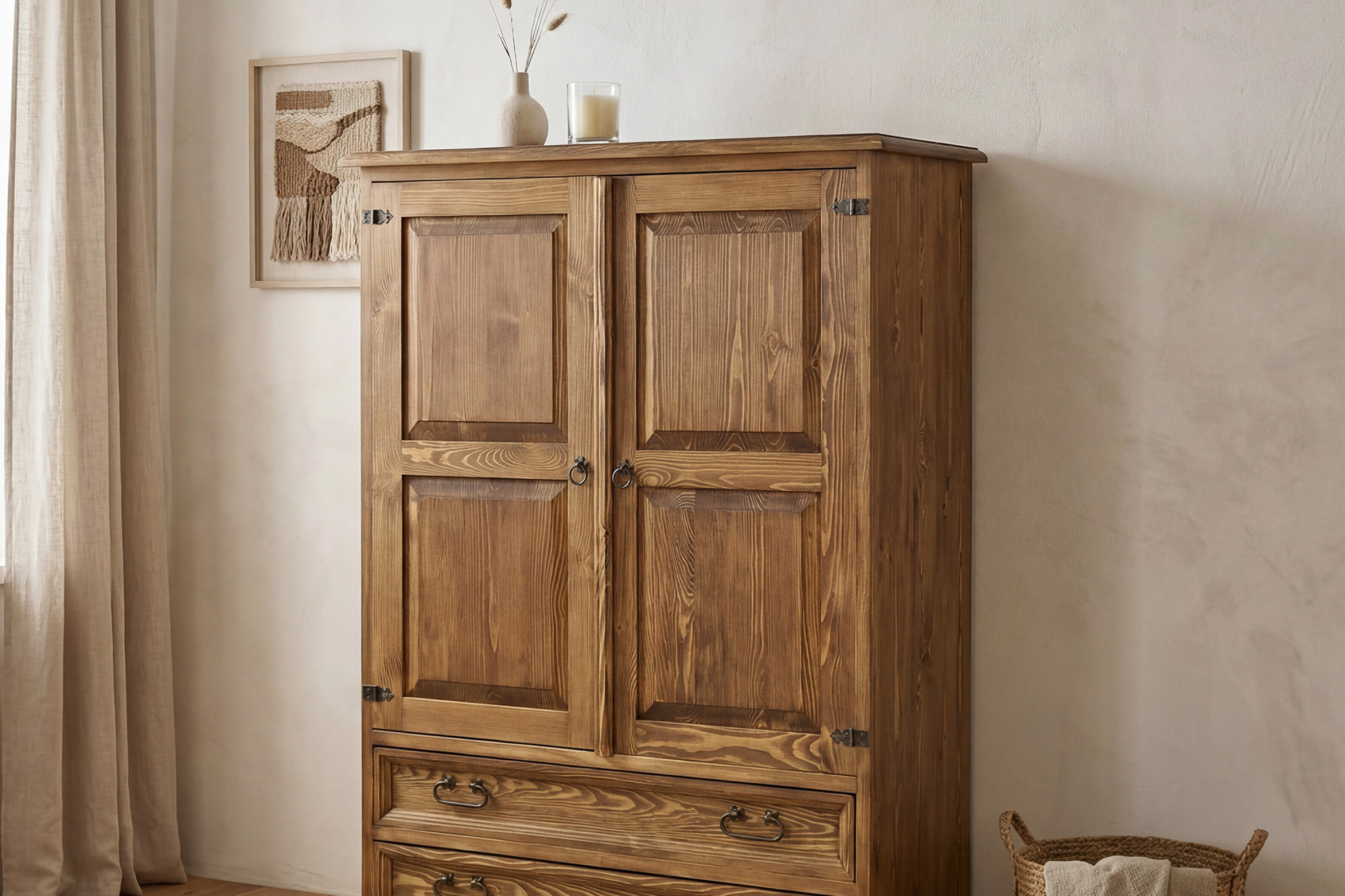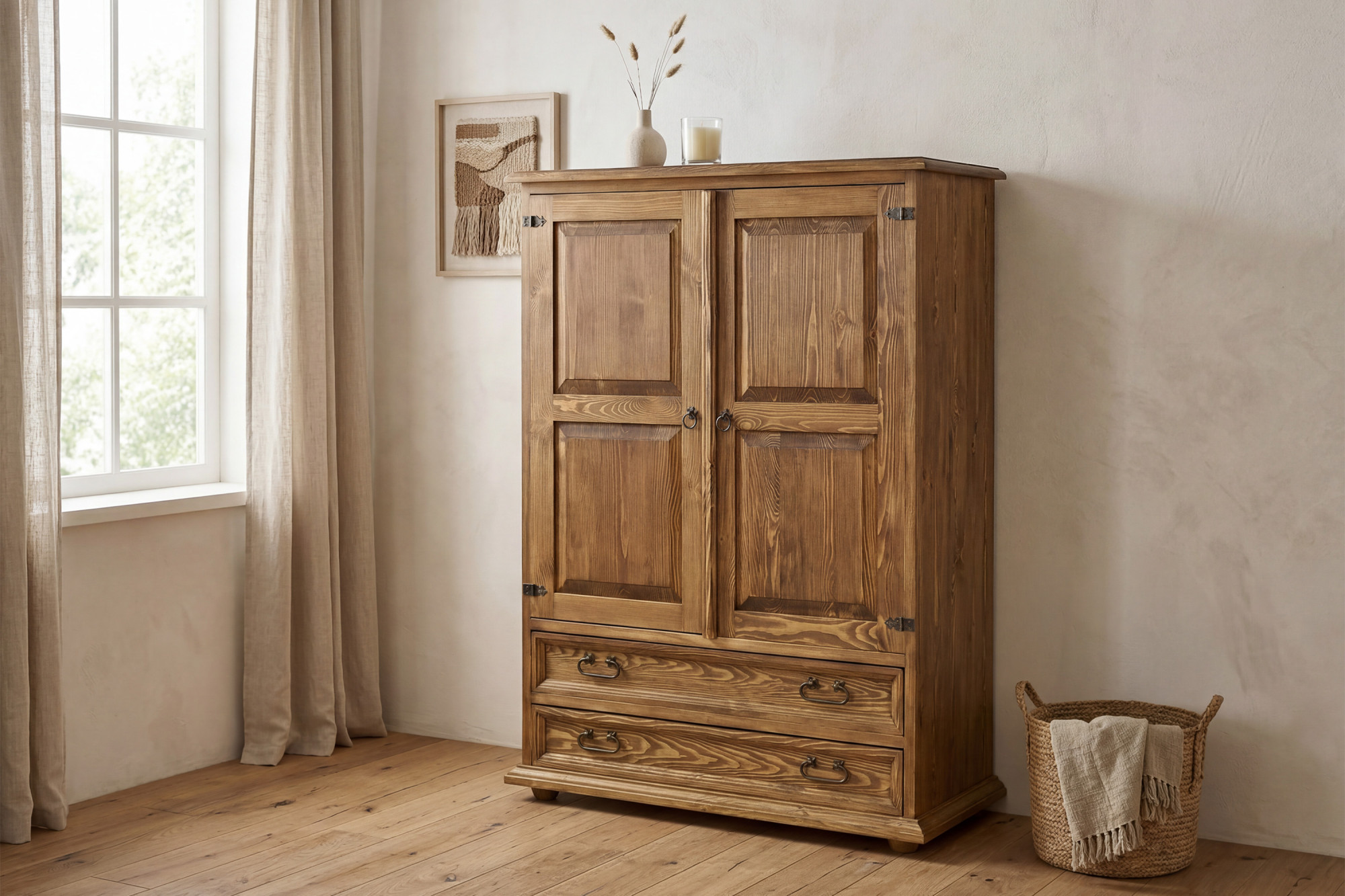 A komód kiváló minőségű fenyőfából készül, amely természetes megjelenése és hosszú élettartama miatt népszerű.