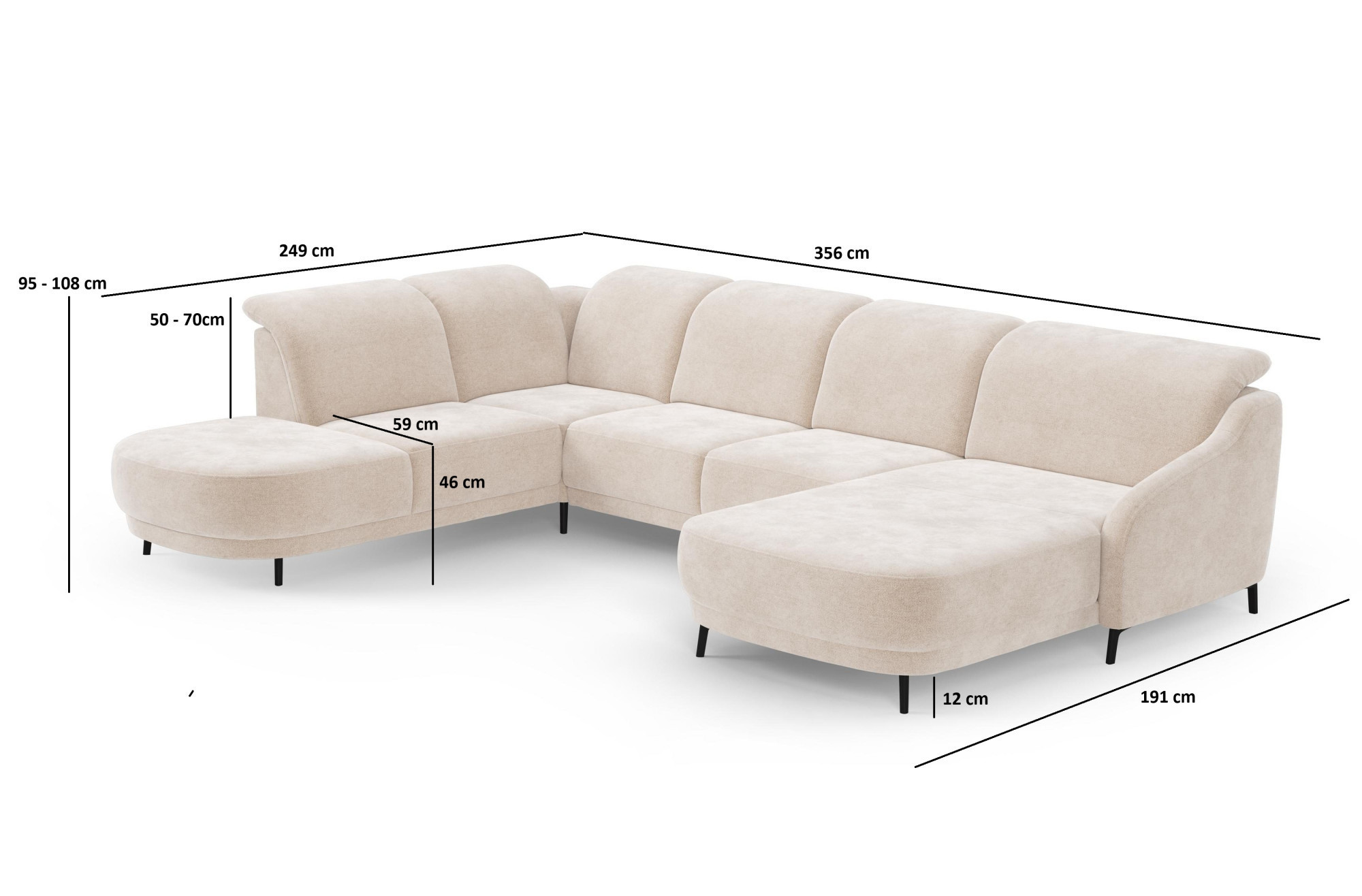 Az ülőgarnitúra teljes mérete 249 × 356 × 191 cm. A modern U alakú Blues ülőgarnitúra az elegancia, komfort és praktikum tökéletes ötvözete. Stílusos dizájnjának és minőségi kidolgozásának köszönhetően kiválóan illik mind a modern, mind a klasszikus enteriőrökbe. A masszív masszívfa keret és a minőségi forgácslap biztosítják a stabilitást és a hosszú élettartamot. Az ülőfelület PUR habból és hullámos rugókból áll, amely maximális kényelmet nyújt a mindennapi használat során. A háttámlák rugalmas hevederek, PUR hab és szálas töltet kombinációjával vannak kitöltve, ami puha, de stabil háttámaszt garantál.
