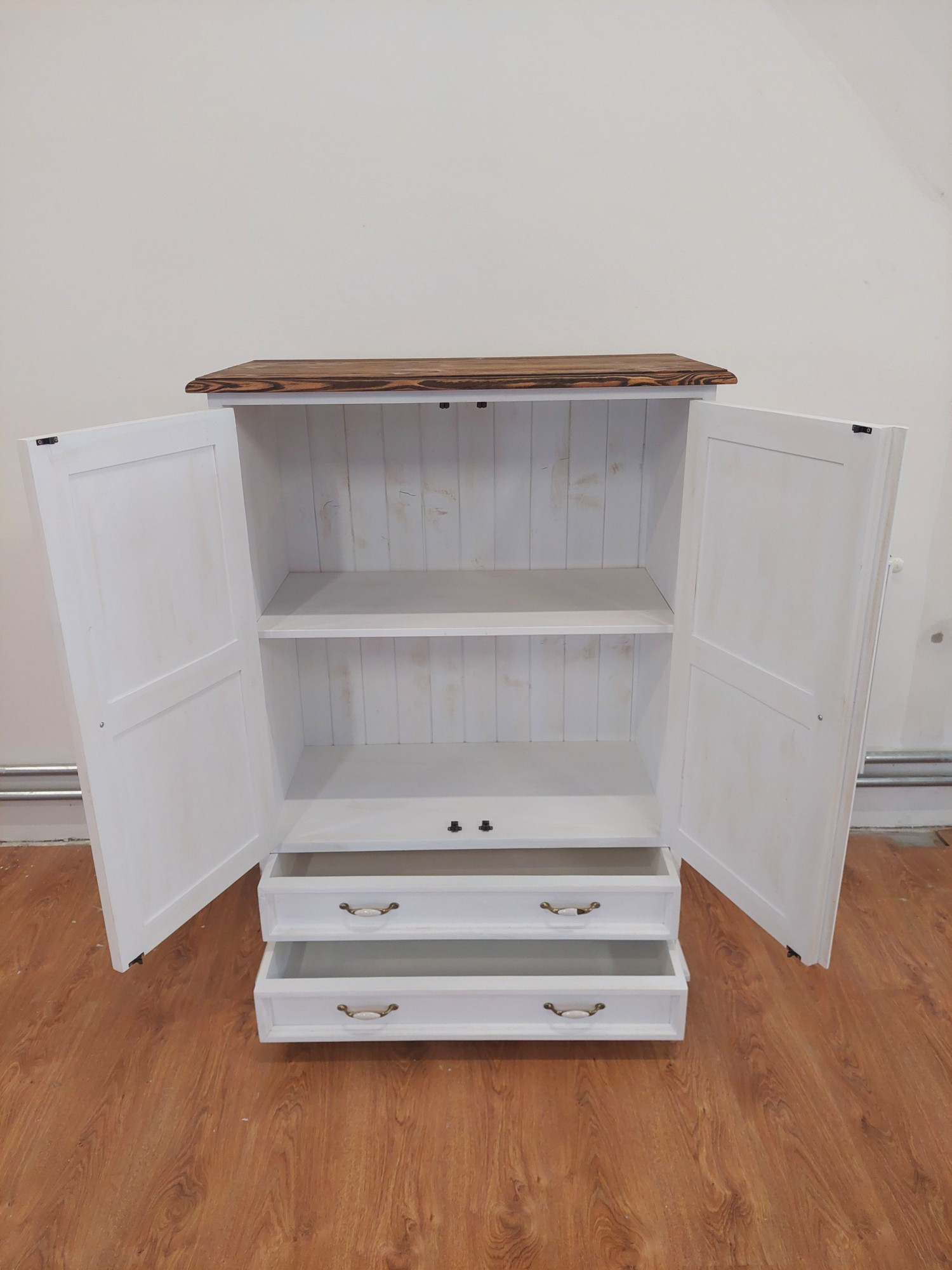 A komód praktikus tárolóhelyet kínál – a kétajtós rész mögött hely van tányérok, textilek vagy dísztárgyak elhelyezésére. Az alsó részt két fiók egészíti ki fém fogantyúkkal, amelyek ideálisak apróbb tárgyaknak.