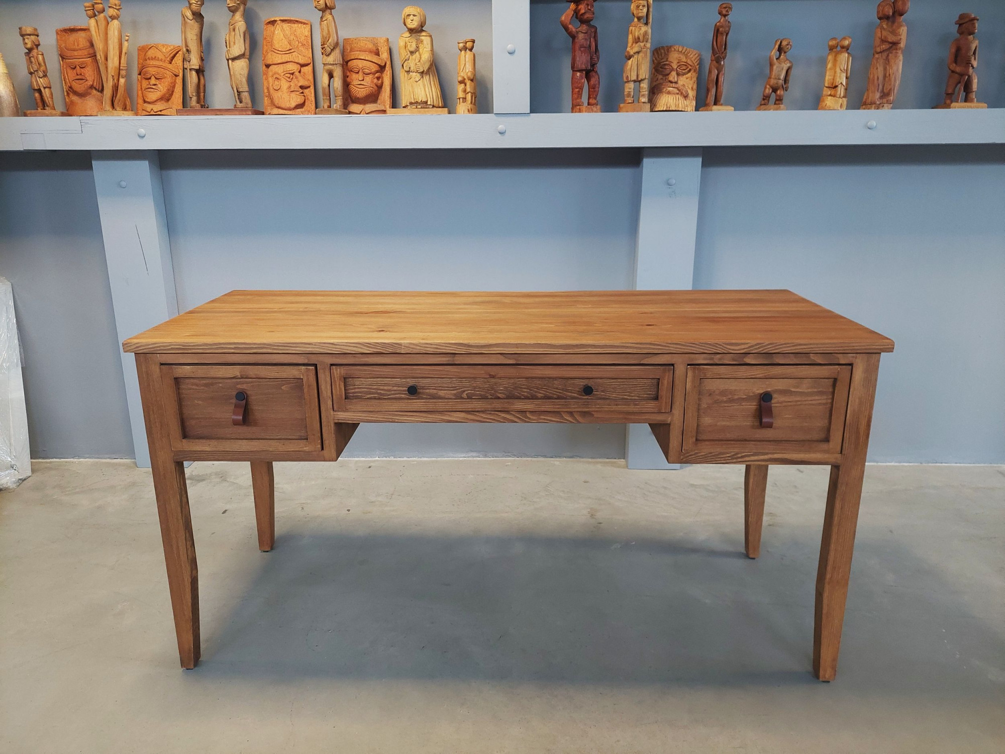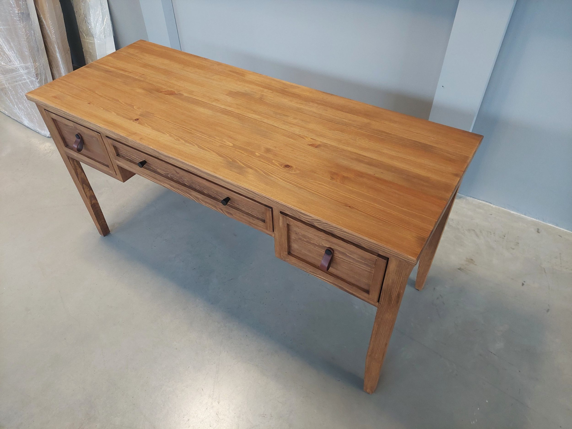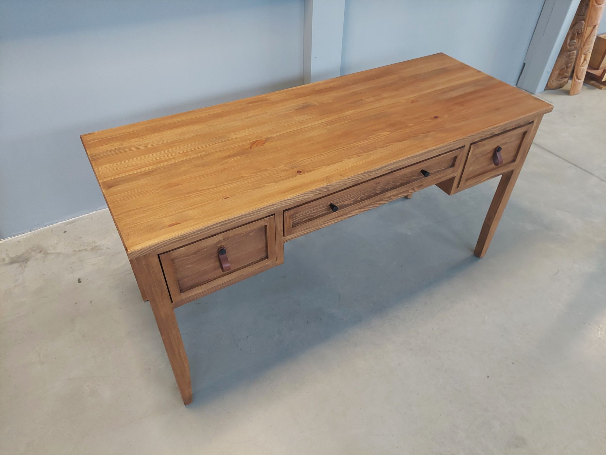 Az asztal praktikusan megoldott tárolóhellyel rendelkezik – két oldalsó fiókkal és egy szélesebb középső fiókkal, amelyek ideálisak dokumentumok vagy munkafelszerelések számára. A fiókokat egyszerű fogantyúk egészítik ki, amelyek hangsúlyozzák természetes és időtálló megjelenését. A stabilitást masszív, enyhén keskenyedő lábak biztosítják.