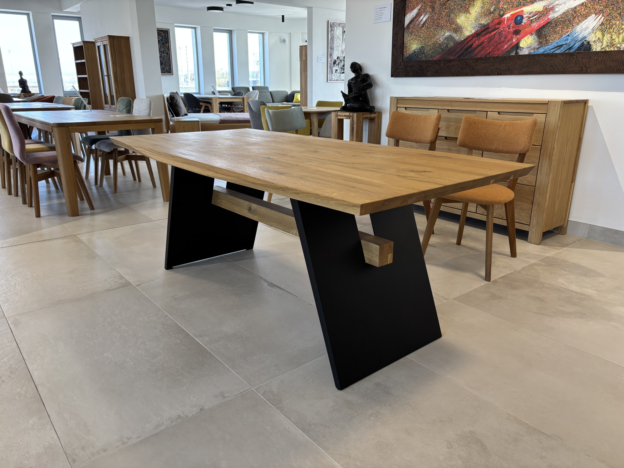 Remekművünk - egy asztal, amelynek felső lapját enyhén lekerekített forma teszi élővé, ami finomságot és eleganciát kölcsönöz. Az asztal élei nem csak egyszerűek, hanem letörtek, ami rendkívül vonzó és időtlen, luxus megjelenést. Ez a modern fa étkezőasztal gyönyörű természetes tölgyfából készült, amely meleg és barátságos érzetet ad. És akkor ott vannak a modern fekete fém lábak! Nemcsak karaktert kölcsönöznek az asztalnak, hanem biztosítják a szilárdságát és stabilitását.