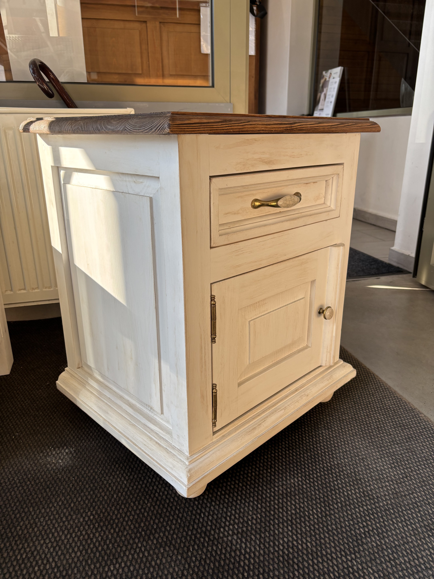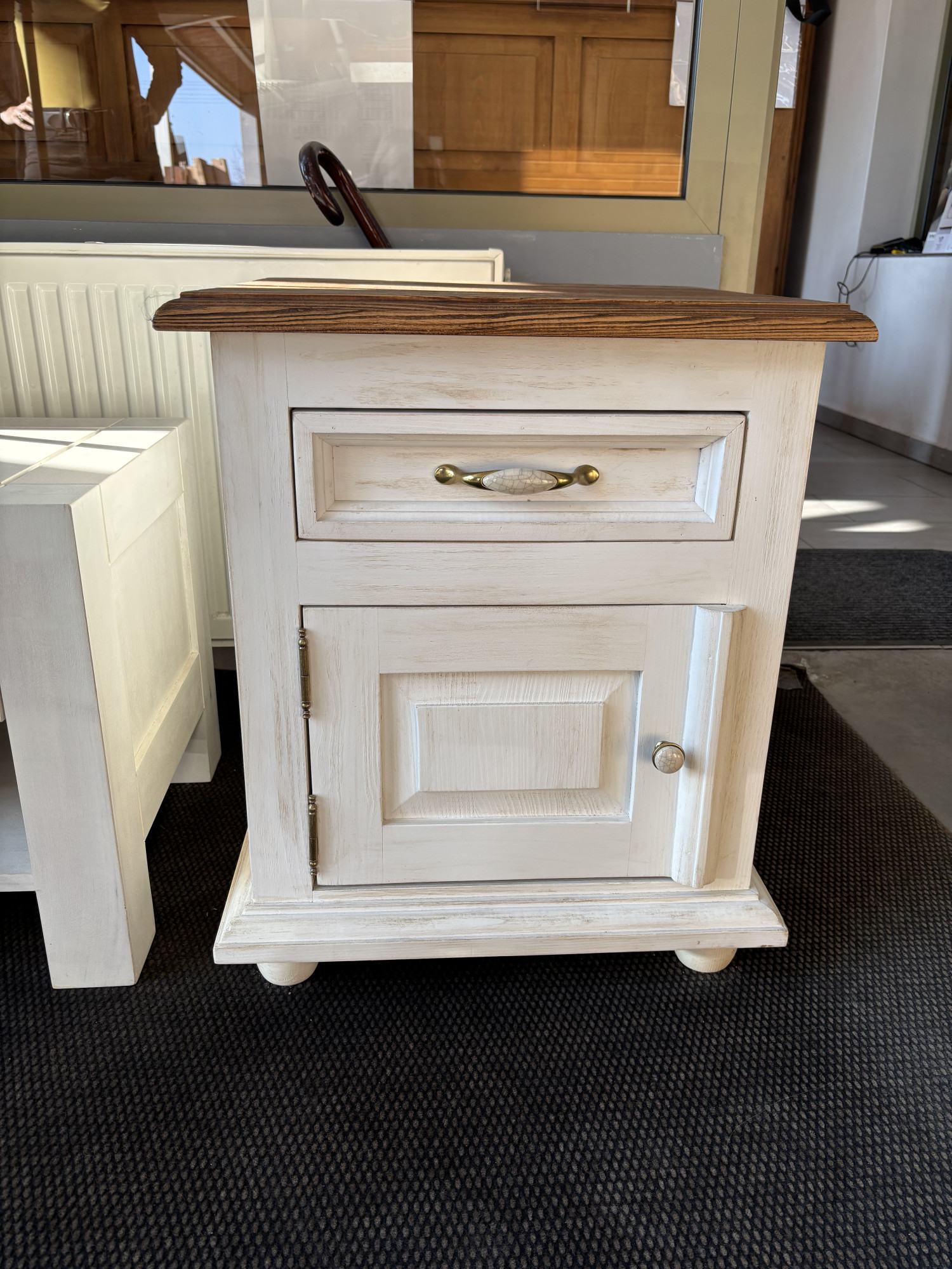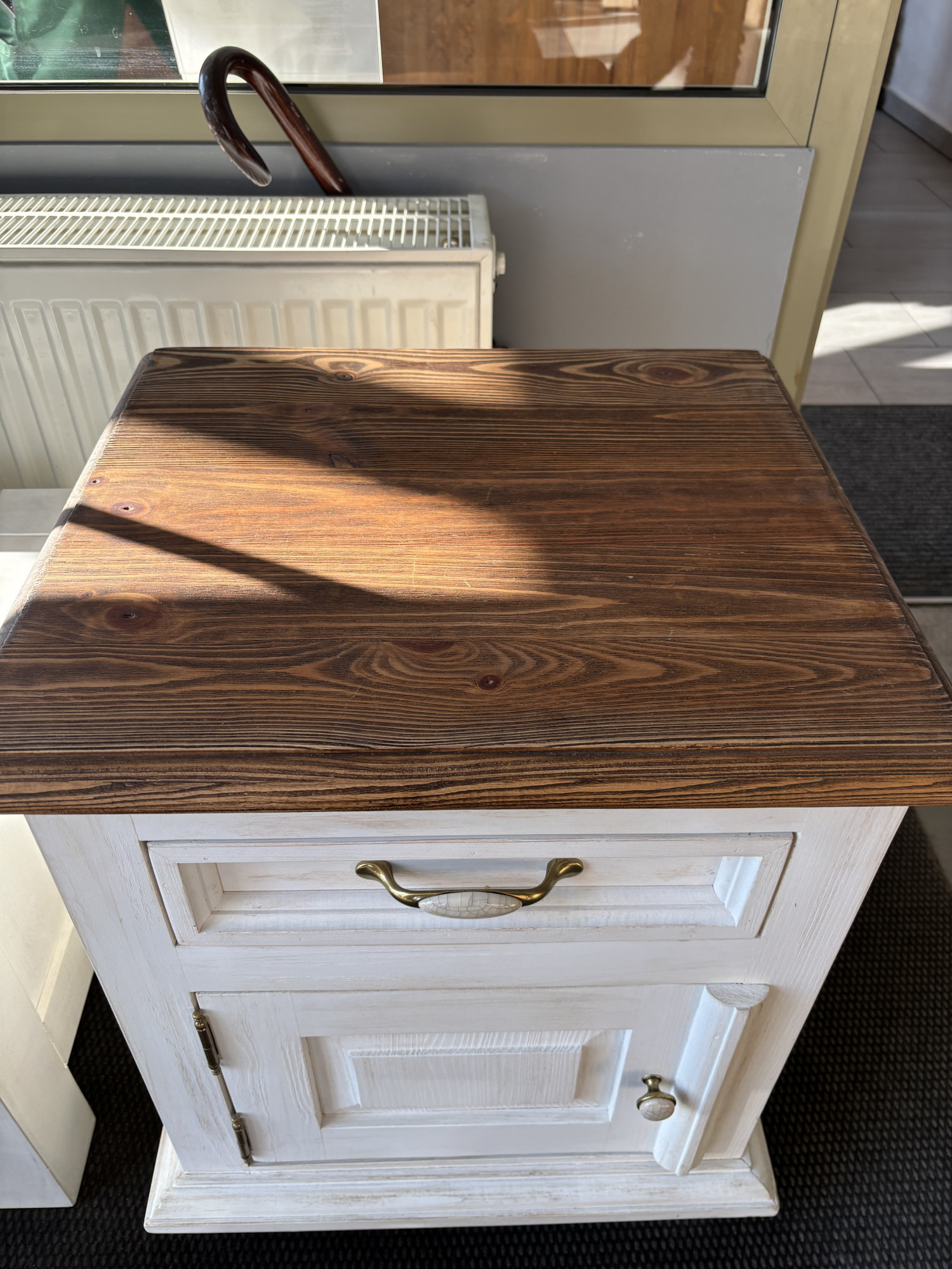 Az éjjeliszekrény kiállítási darab, és valamivel szélesebb, mint a standard kínálatban szereplő modell. A felső lapnak apróbb hibái vannak.