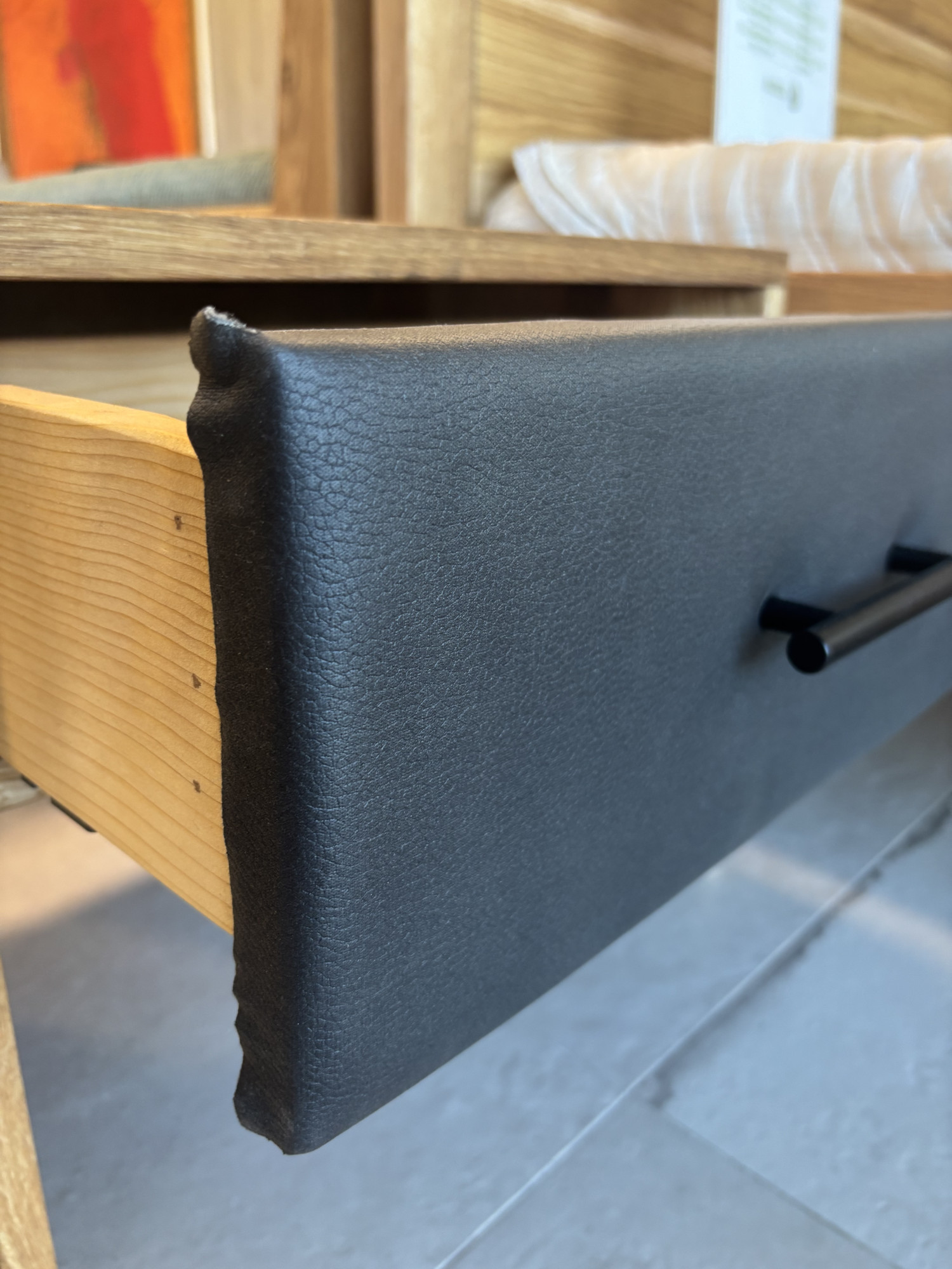Az éjjeliszekrény egy soft-close rendszerű fiókkal van felszerelve, így a zárás csendes, egyenletes és kényelmes a mindennapi használat során. A fiók előlapi része sötét, bőrhatású szövettel van bevonva, ami modernebbé és elegánsabbá teszi a bútort. A praktikus fekete fogantyú kiemeli az összhatást, és megkönnyíti a kényelmes nyitást.