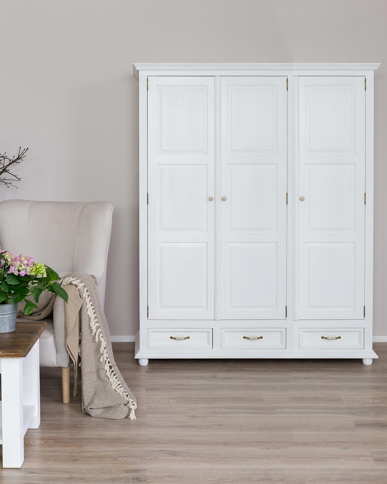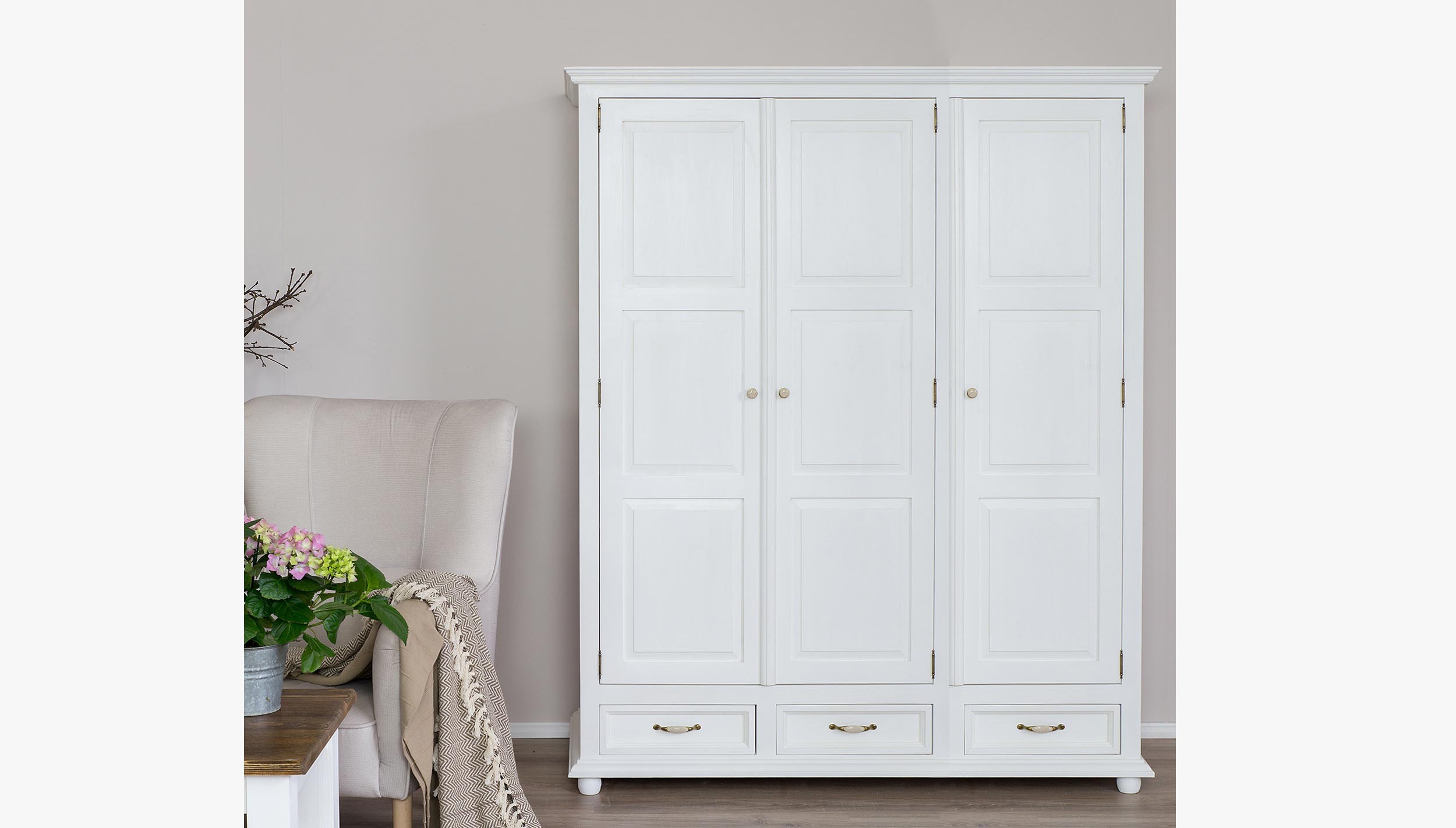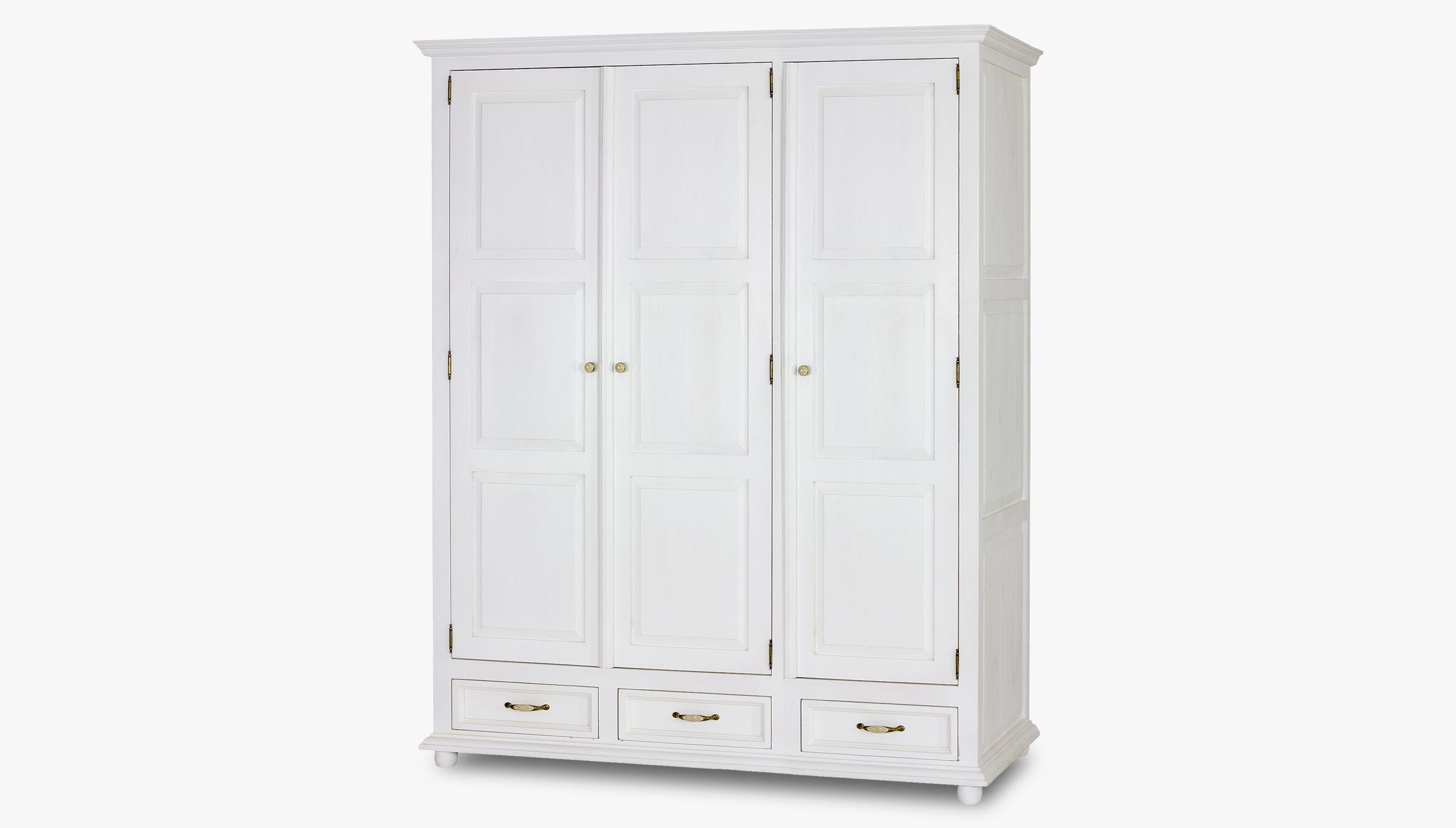 Fehér tömör fenyő gardróbszekrény réz fogantyúkkal, Provence stílus