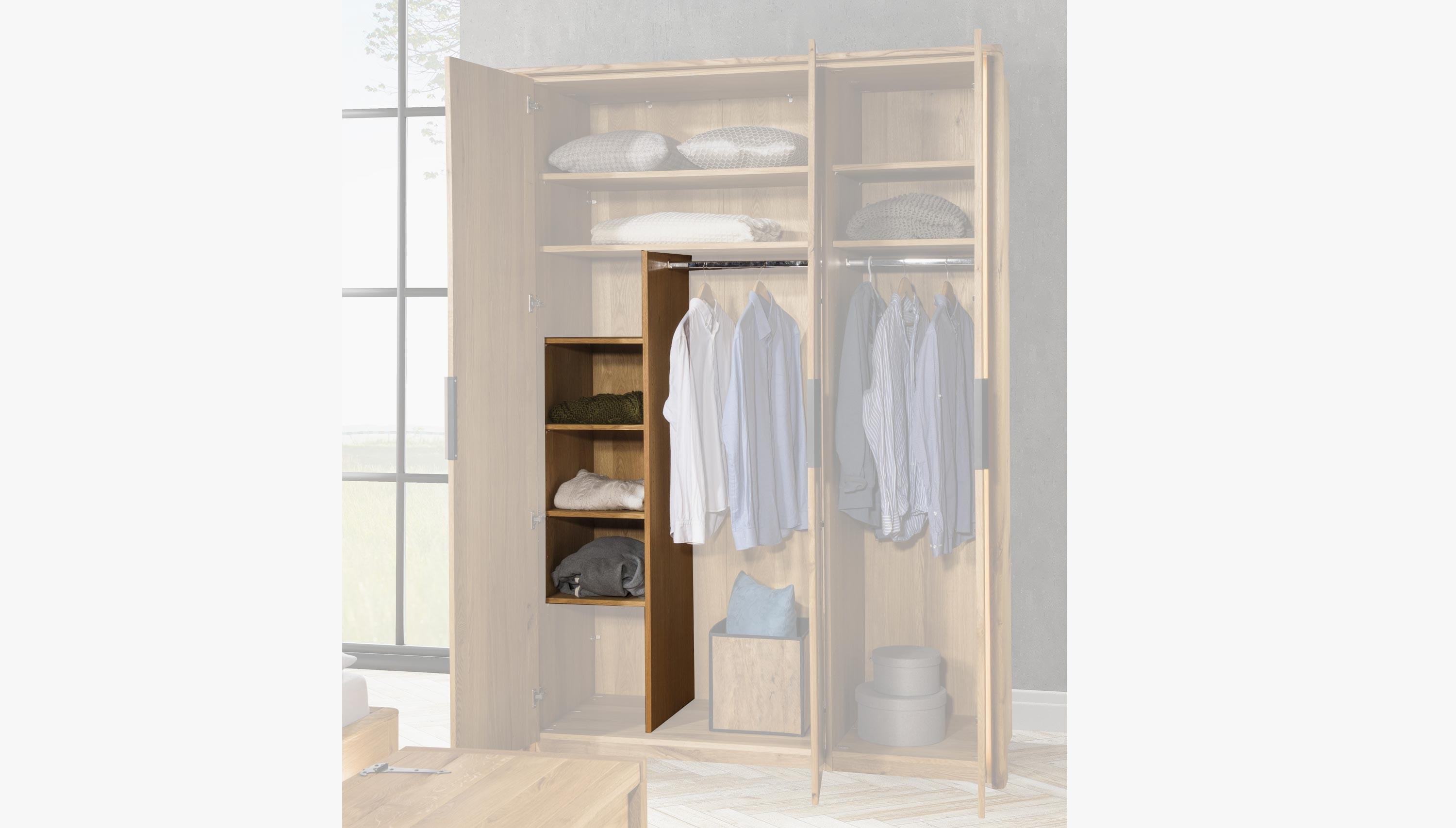 Eredeti kiegészítő a Texas gardróbszekrényhez. tartalmaz 4 x polcot, elválasztó falat és fogast, ideálisan a háromajtós denv szekrénybe