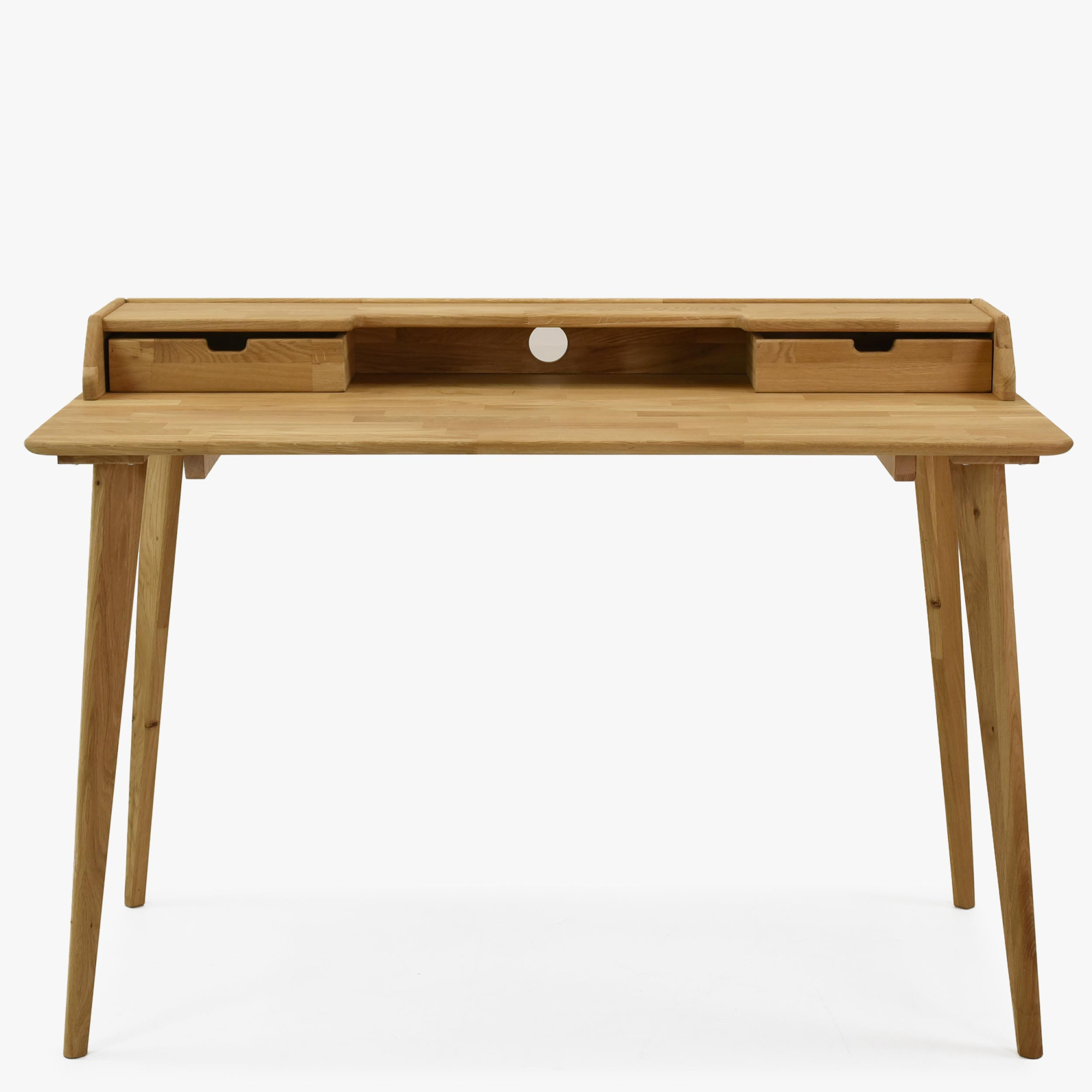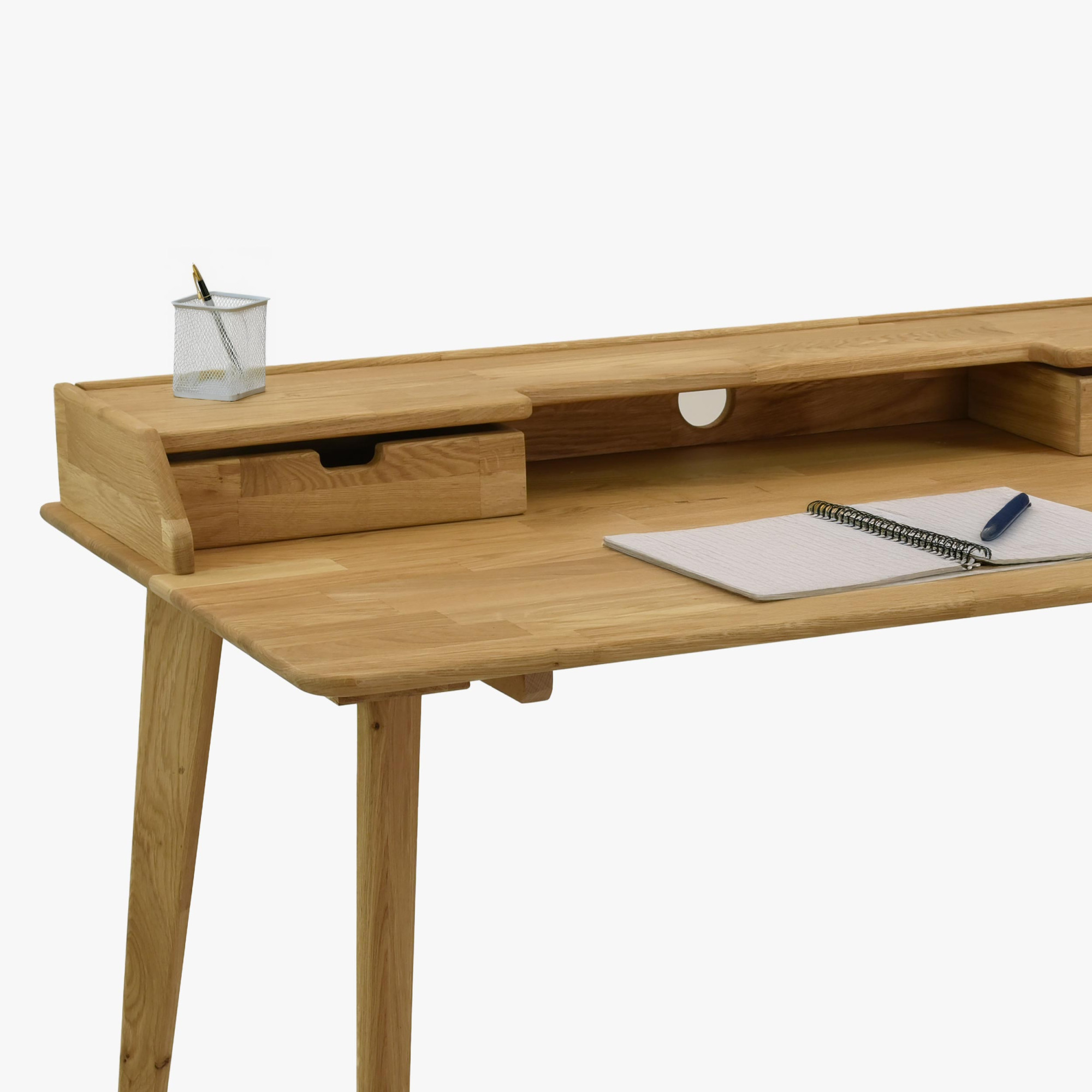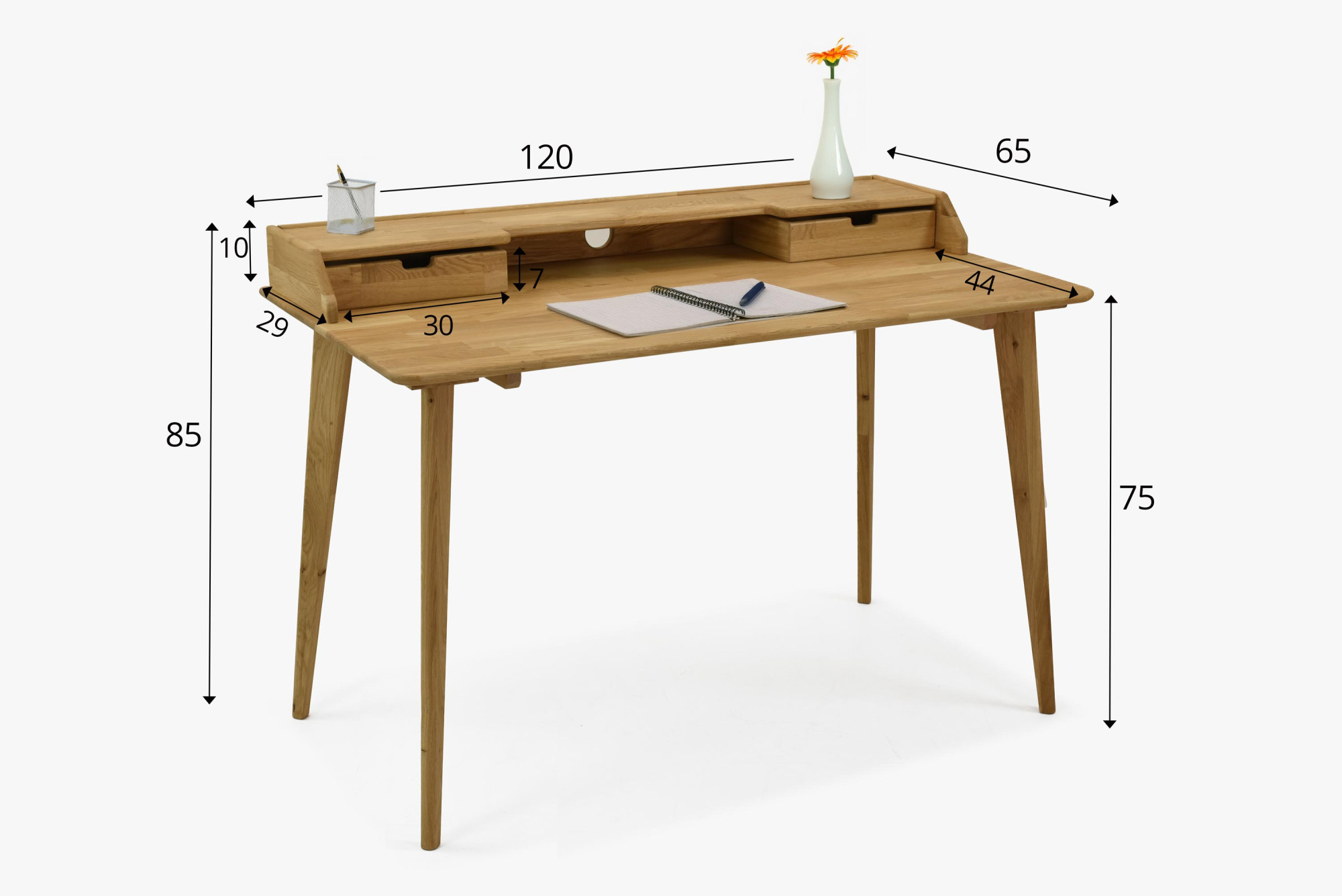 Az asztal praktikus kialakítása elég nagy munkafelületet kínál, amely alkalmas laptopos munkához, házi feladat íráshoz vagy mindennapi irodai tevékenységhez. A két kisebb fiók is részét képezi, amelyek apróságok tárolására szolgálnak, lazán elhelyezettek és könnyen hozzáférhetők. A számítógépasztal szétcsomagolva kerül kiszállításra, egyszerű és intuitív összeszereléssel. Időtálló designja könnyen kombinálható más tömör tölgyfa bútorokkal otthonában.