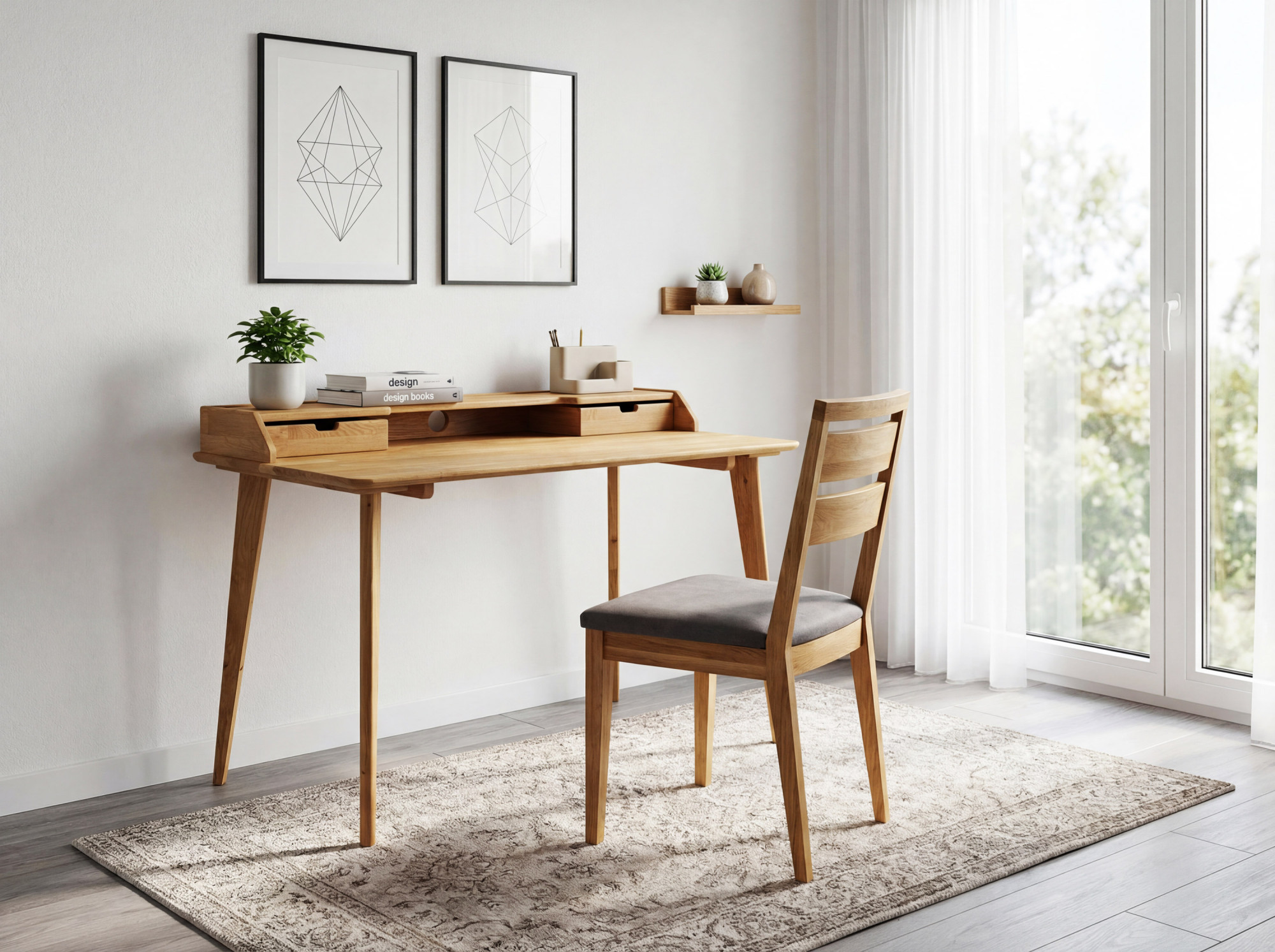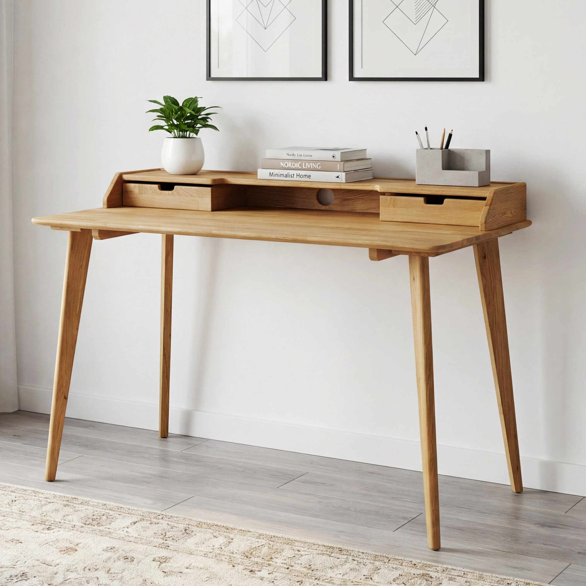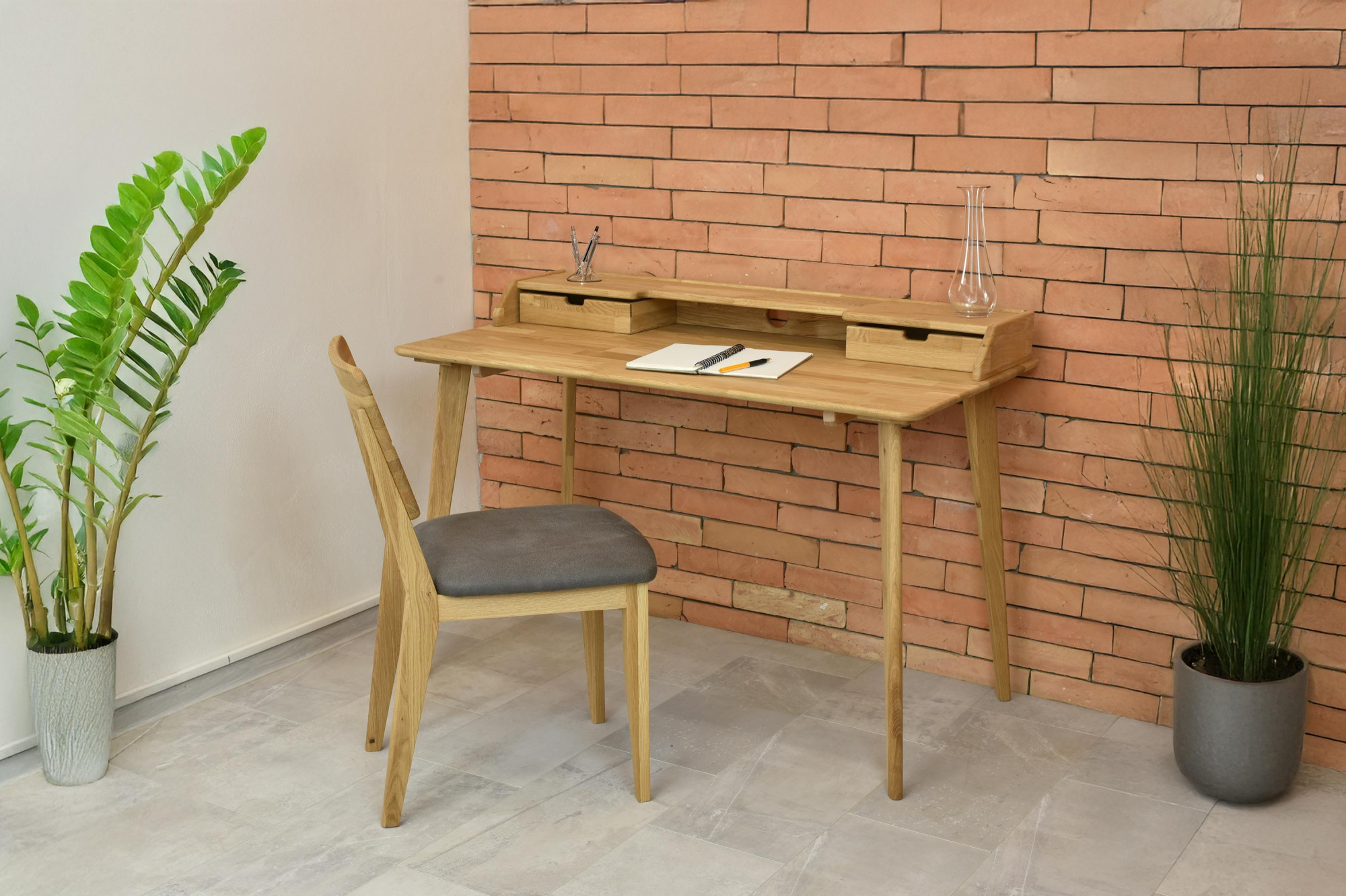 Az asztal praktikus kialakítása elég nagy munkafelületet kínál, amely alkalmas laptopos munkához, házi feladat íráshoz vagy mindennapi irodai tevékenységhez. A két kisebb fiók is részét képezi, amelyek apróságok tárolására szolgálnak, lazán elhelyezettek és könnyen hozzáférhetők. A számítógépasztal szétcsomagolva kerül kiszállításra, egyszerű és intuitív összeszereléssel. Időtálló designja könnyen kombinálható más tömör tölgyfa bútorokkal otthonában.