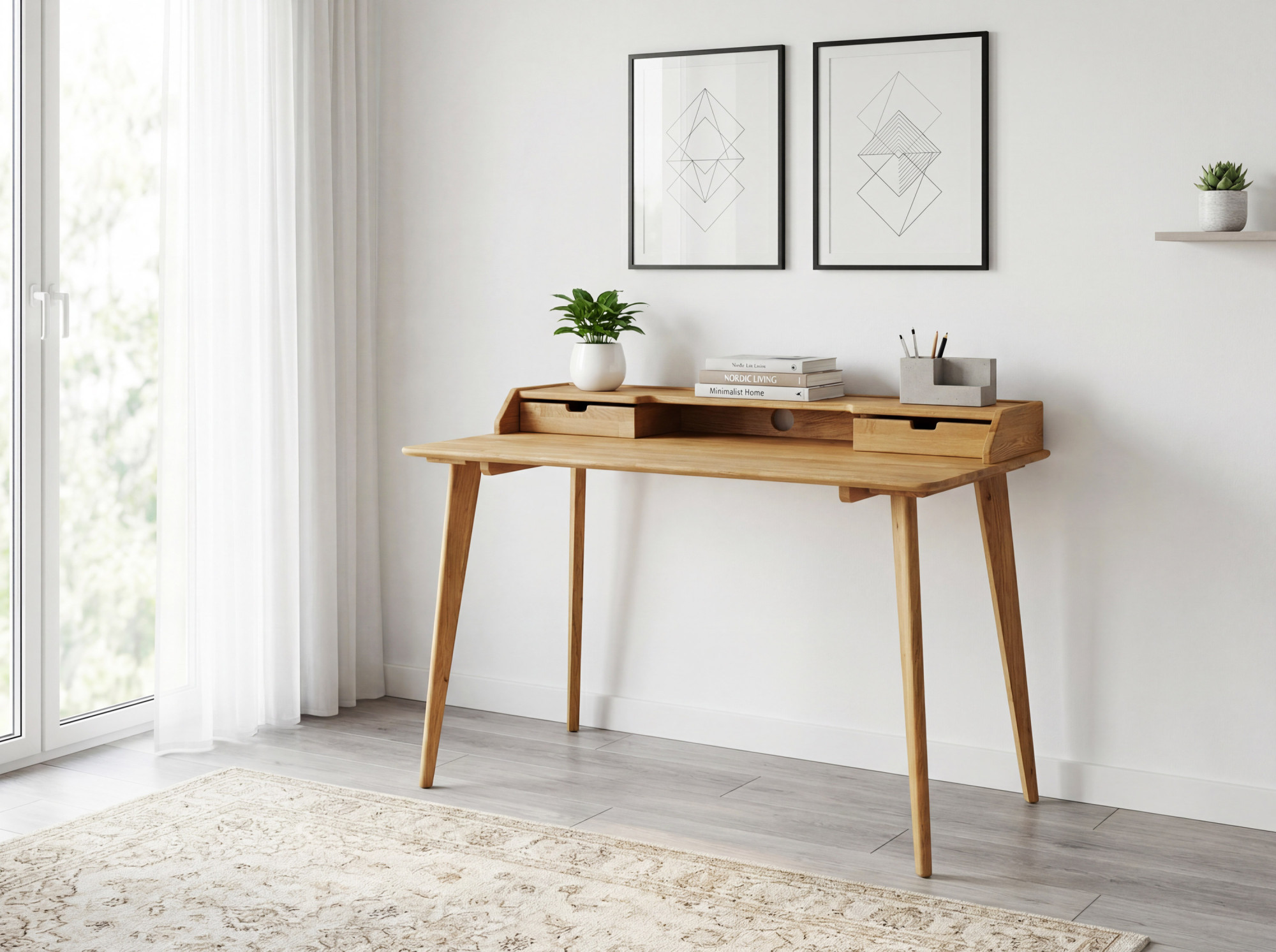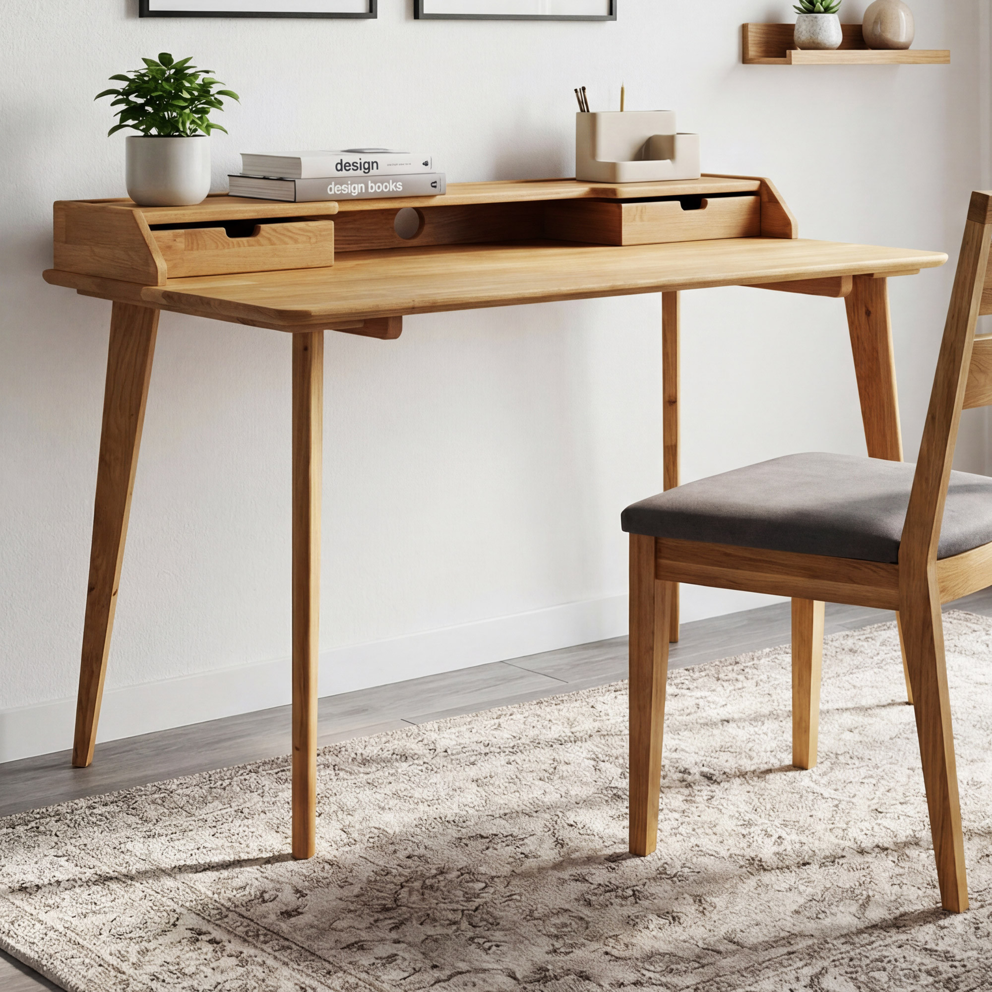 Tömör tölgyfa számítógépasztal két fiókkal, natural színű