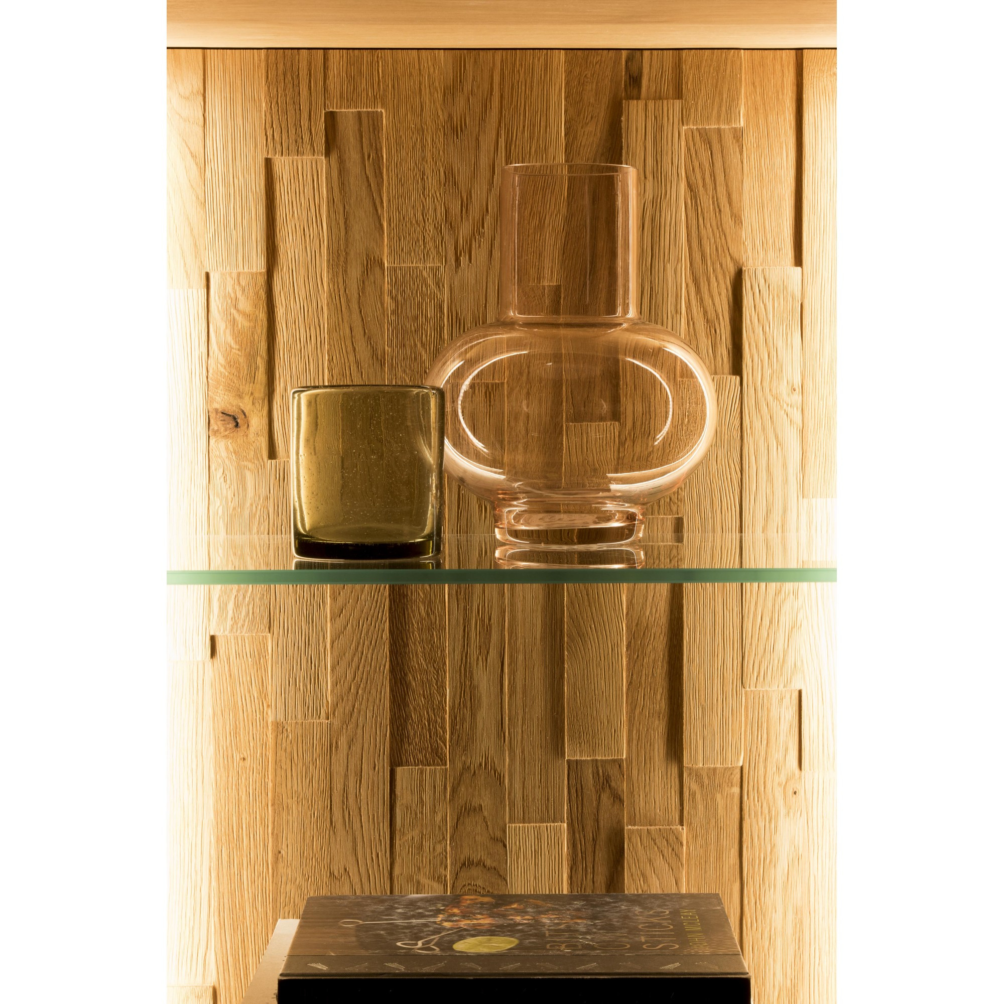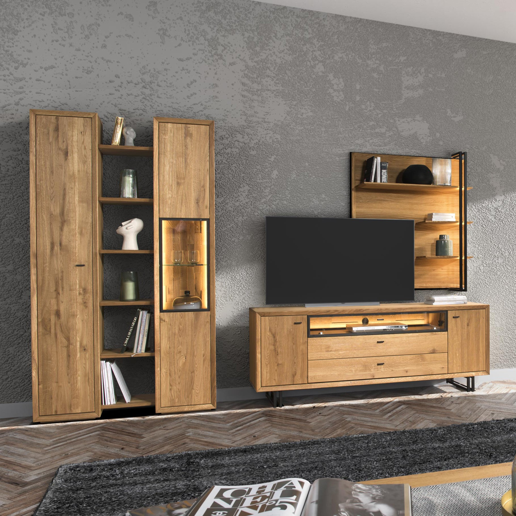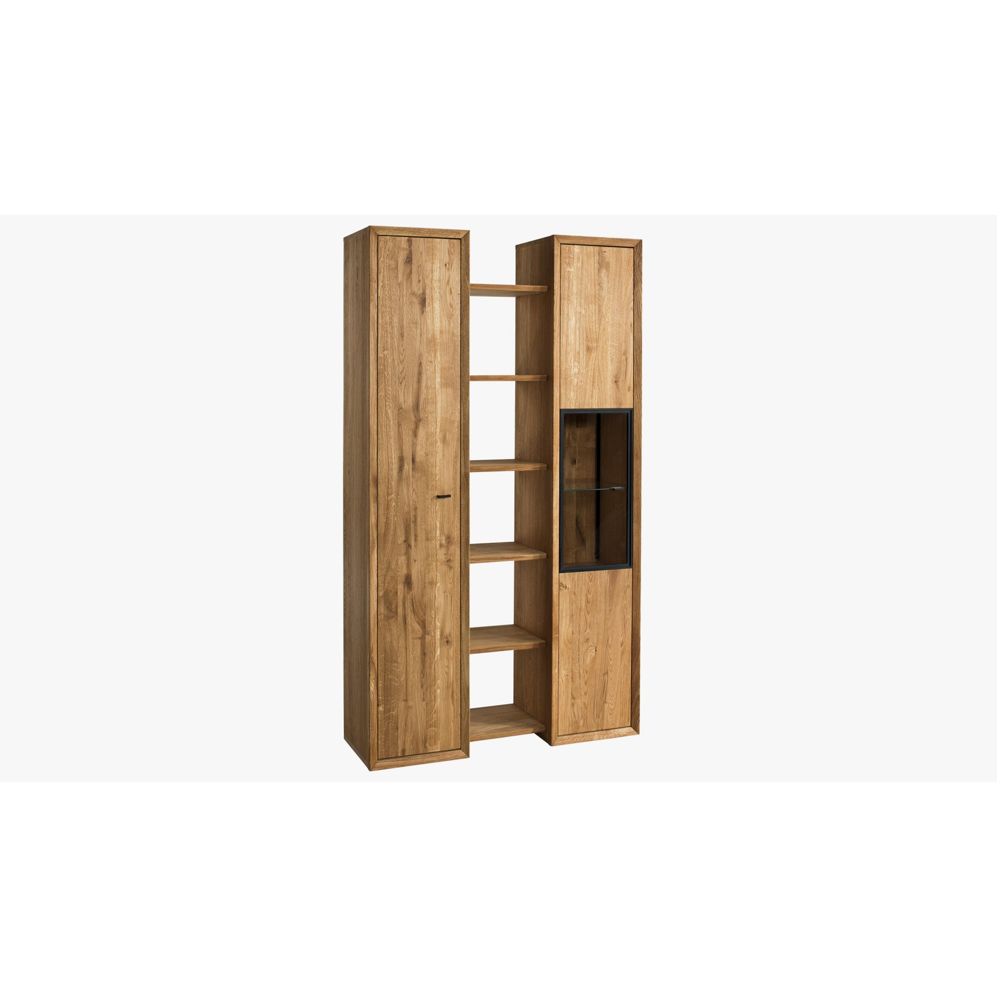 Tölgyfa nappali bútor szett, TV komód, vitrin és polc, természetes fa