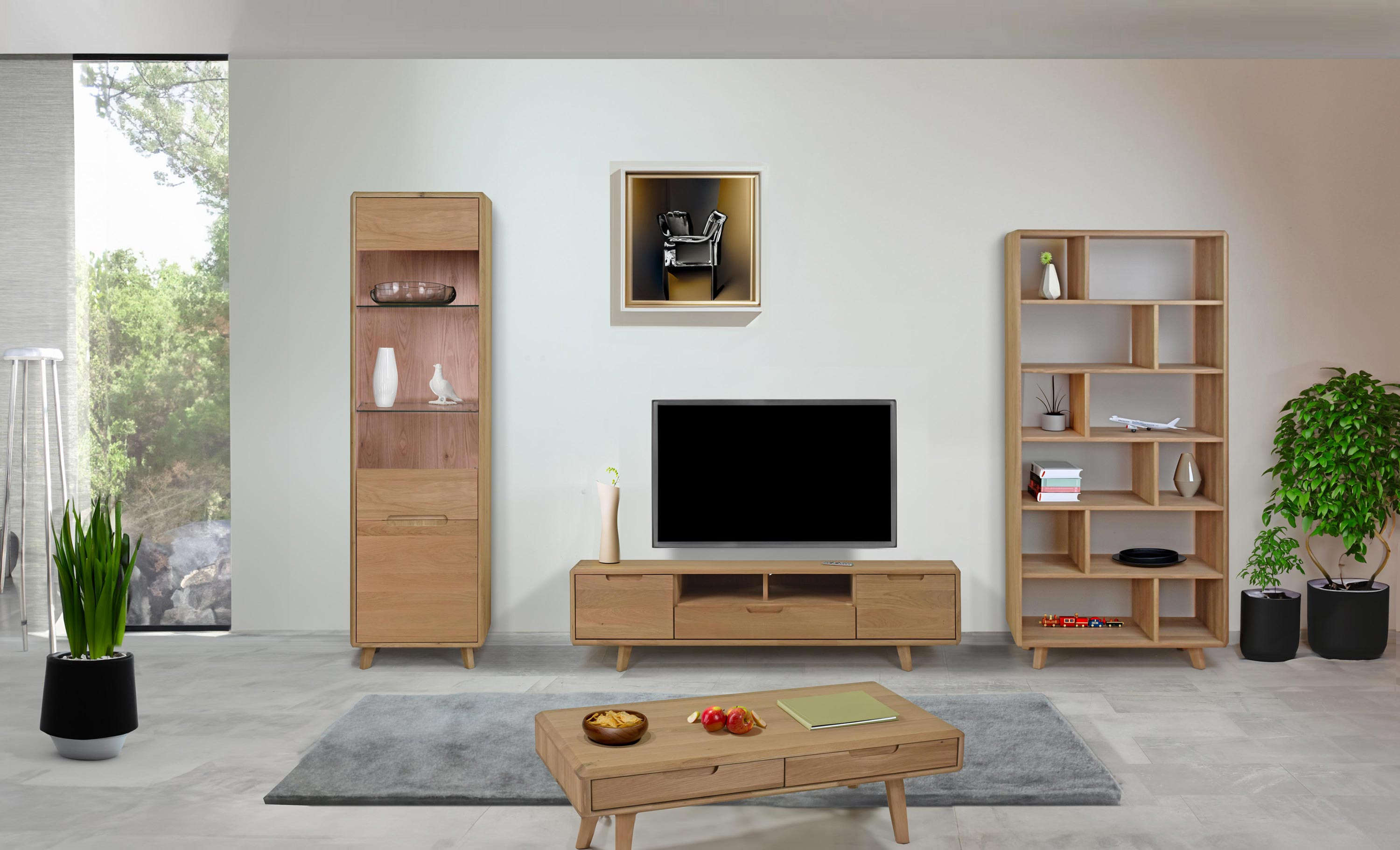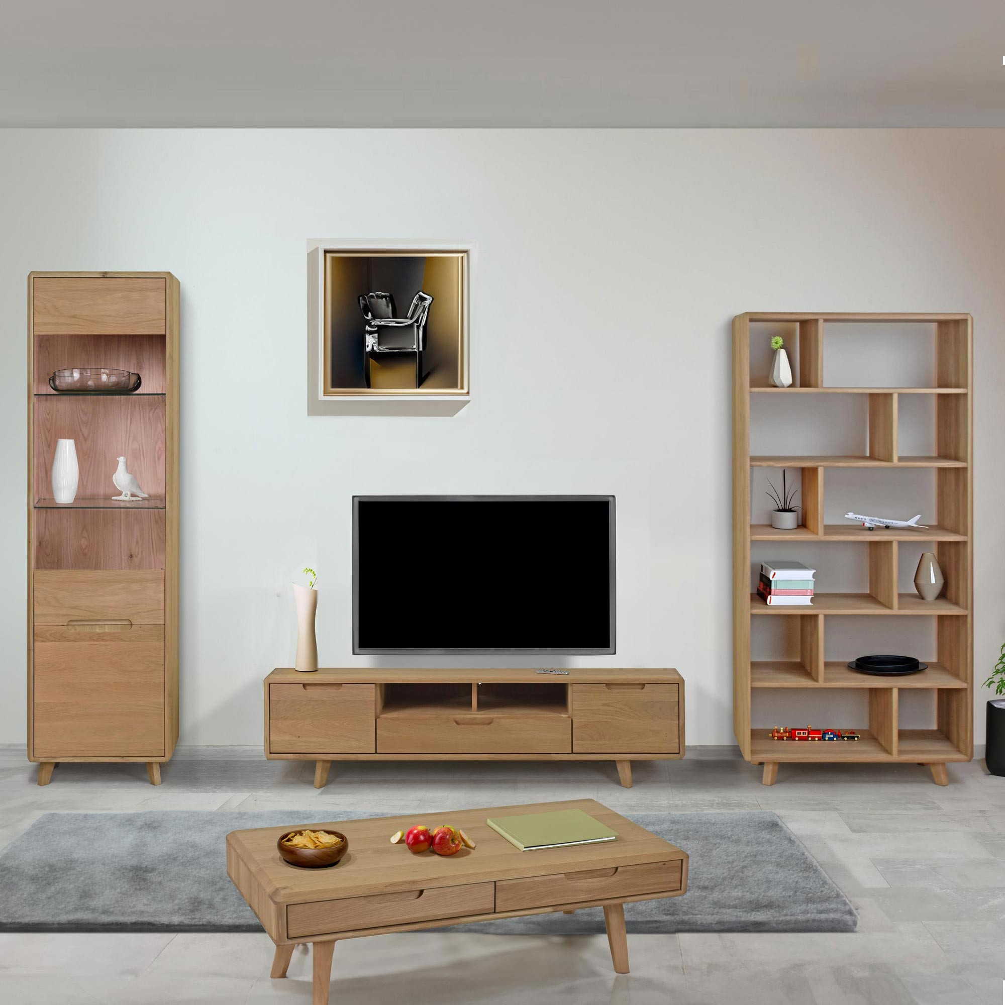 Masszív tömör tölgy nappali fal bianco fehér színben, skandináv dizájn