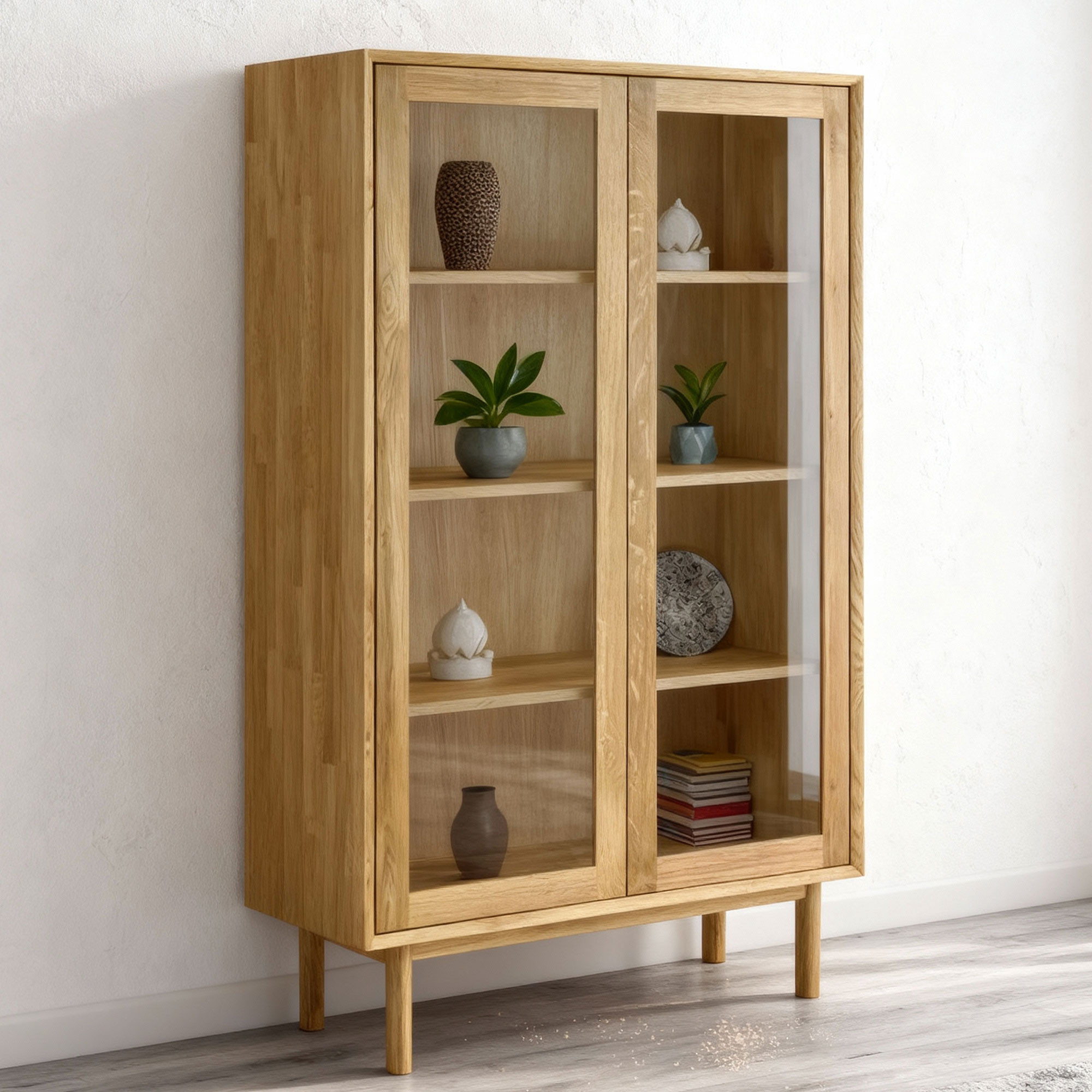 Tömör tölgyből készült nappali szekrénysor az Oslo II kollekcióból megoldás azoknak, akik a természetes anyag, a modern megjelenés és a hosszú élettartam kombinációját keresik. A szett tipikusan tartalmaz egy TV-komódot lábakon és két vitrint; az egyes elemek szabadon kombinálhatók és elrendezhetők, így pontosan a helyiséghez igazítható kompozíció alakítható ki. Minden elem tömör tölgyből készül (korpuszok, frontok és belső részek), a felületet természetes olajjal, Dub Natural árnyalatban kezeltük, amely kiemeli a fa erezetét és lehetővé teszi az egyszerű helyi felújítást. A FSC tanúsítványnak köszönhetően biztos lehetsz a felelős fa eredetében.