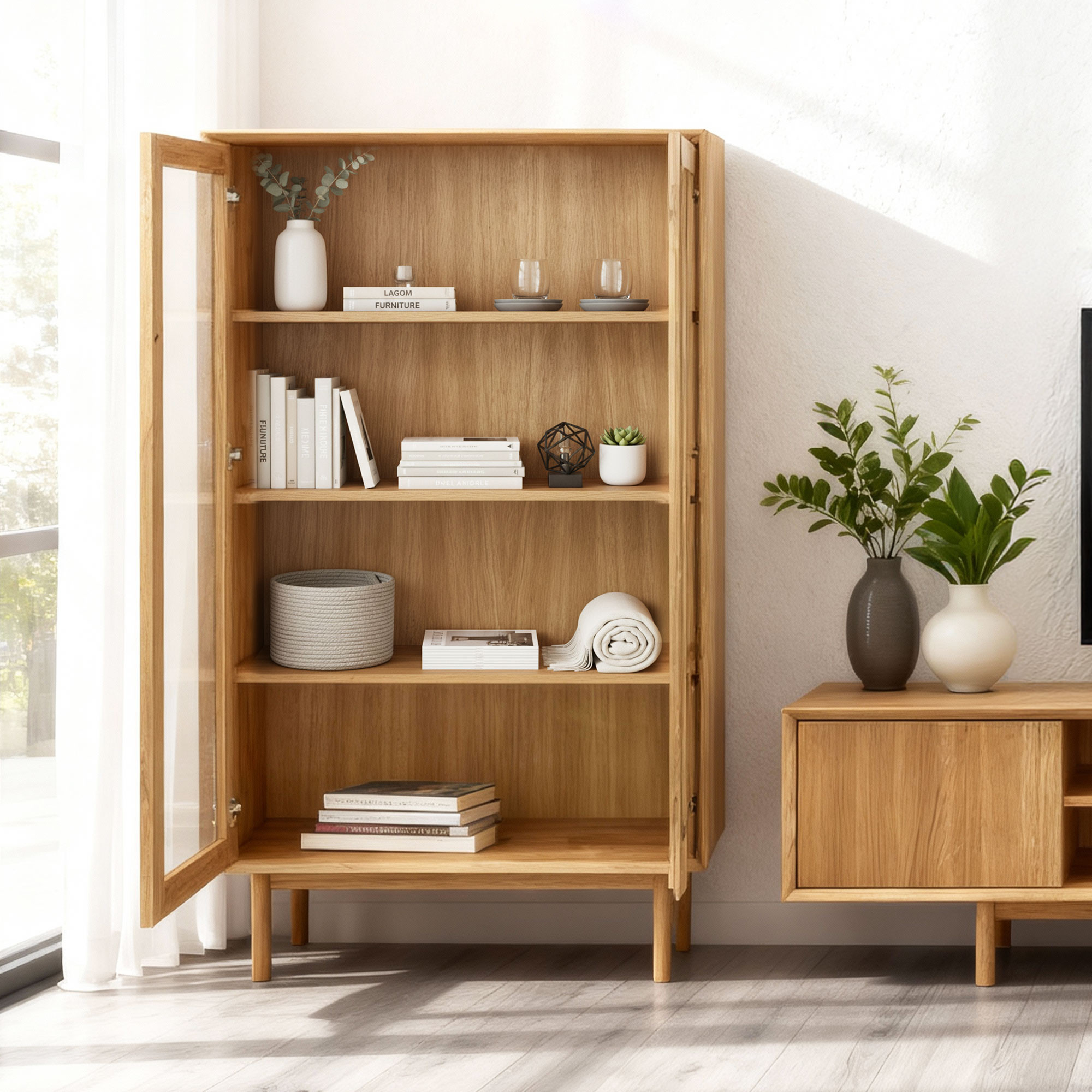 A dizájn a tiszta skandináv vonalakat és a könnyedséget követi – a lábak megkönnyítik a takarítást és légies megjelenést adnak a szettnek. Az ajtók és a fiókok tip-on nyitórendszert használnak a fogantyúk nélküli maximális kényelemért. Minden darab praktikus, jól tagolt tárolóhelyet kínál elektronikának, könyveknek, dísztárgyaknak és iratoknak. Az egységes anyagoknak és felületeknek köszönhetően a szekrénysort könnyen összehangolhatod további tölgybútorokkal a belső térben. A szett teljesen összeszerelve kerül kiszállításra, így csak el kell helyezned és használatba veheted – hosszadalmas szerelés nélkül.