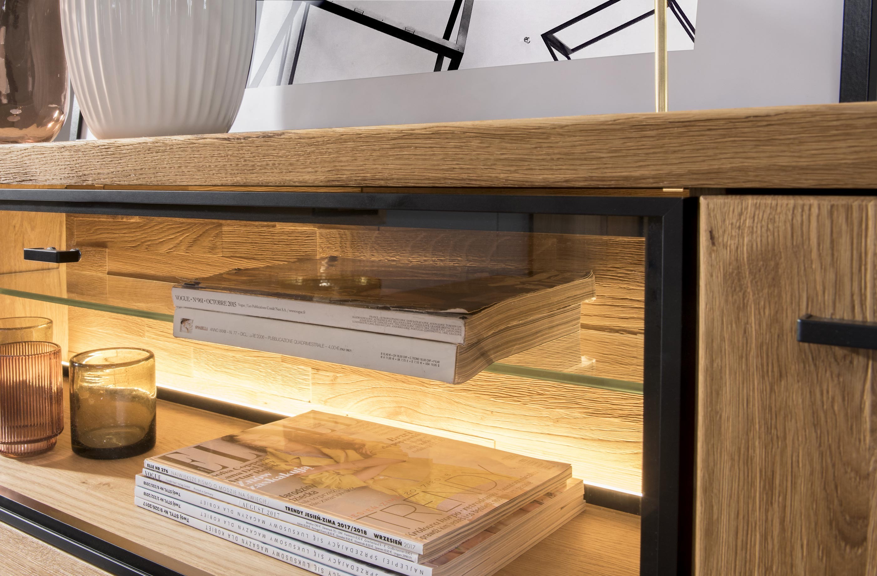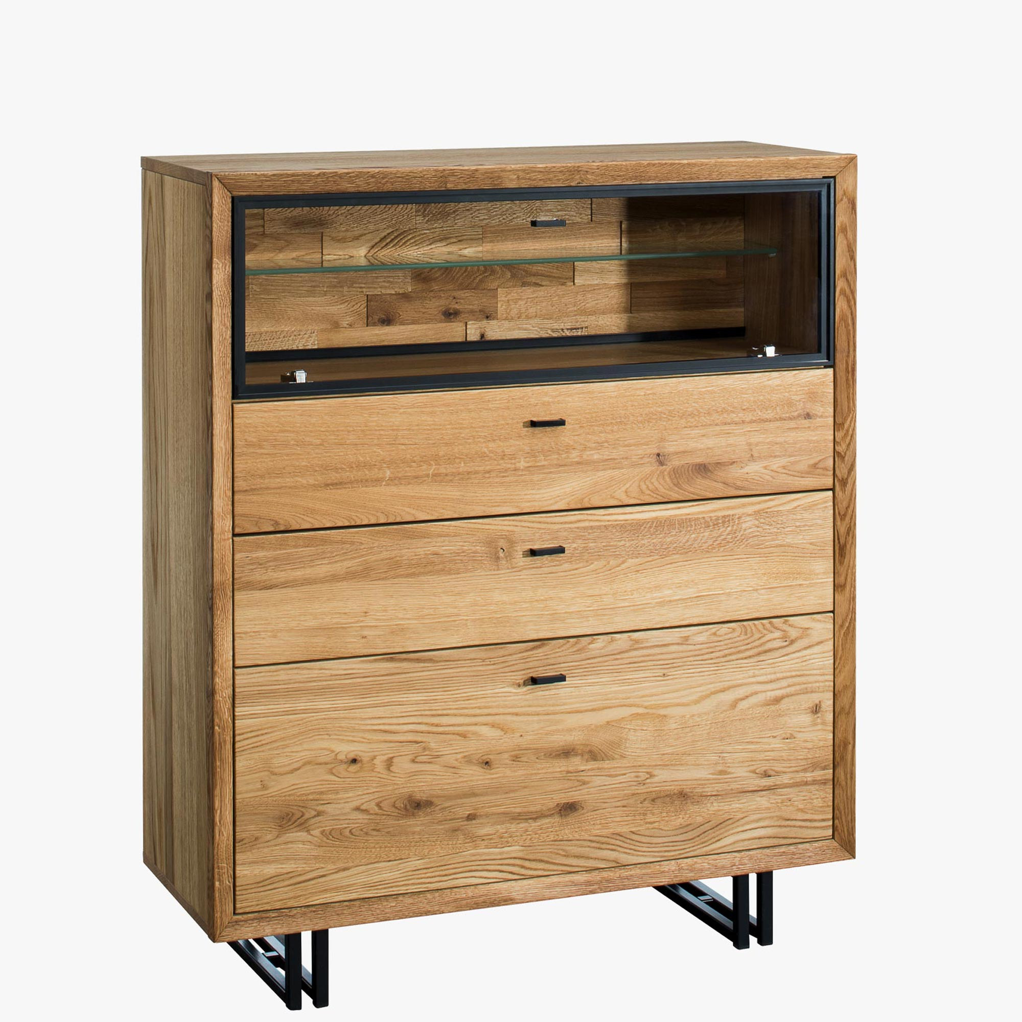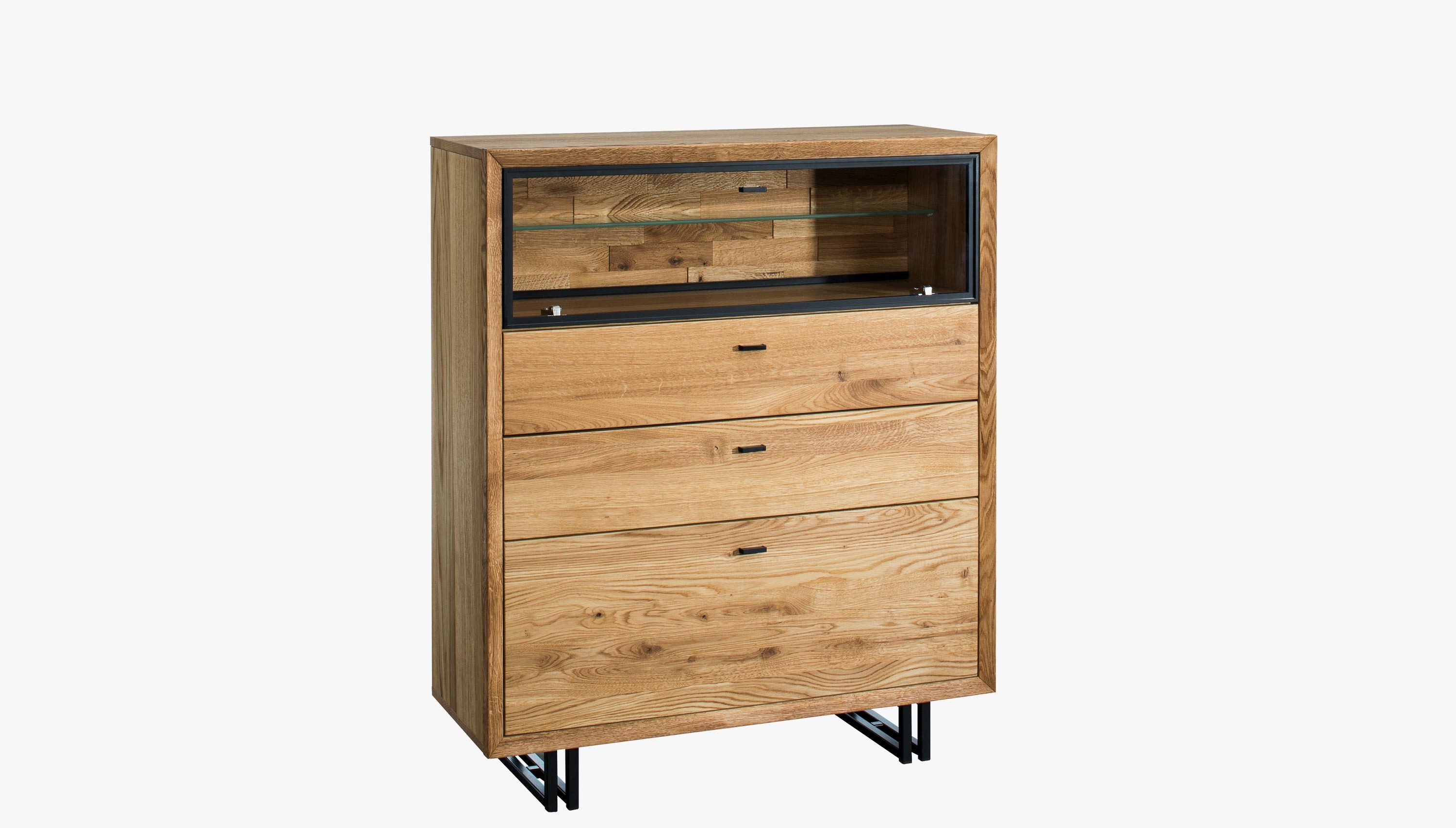 Fém lábú tölgy tálalószekrény 2 fiókkal és világítással, 100 cm