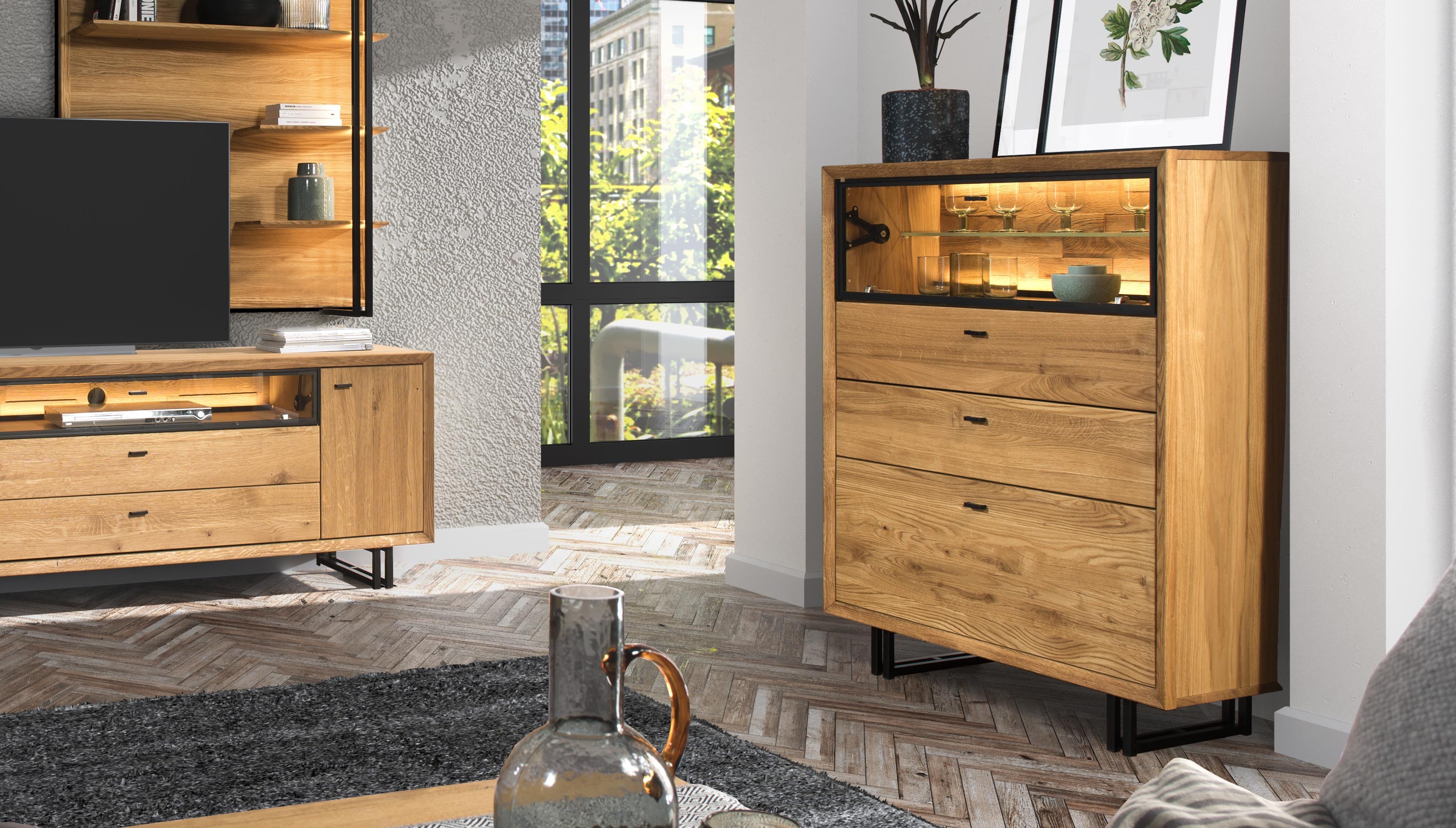 A Vilo bútorcsalád tölgyfa és természetes tölgyfurnér kombinációjából készül. A bútor összetétele: az előlapi részek – fiókok/ajtók – tölgylapból készülnek, a felső lap természetes tölgyfurnér, a belső váz és az oldalak pedig természetes tölgyfurnérból. A bútor különleges német Livos olajjal van kezelve. A bútor cégünk és egy lengyel cég együttműködésében készül, ahol a végső termék minden darabja valódi, egyedi darab, a legmagasabb minőségben. A világítás már benne van az árban azon darabok esetében, amelyeknél ez megtalálható.