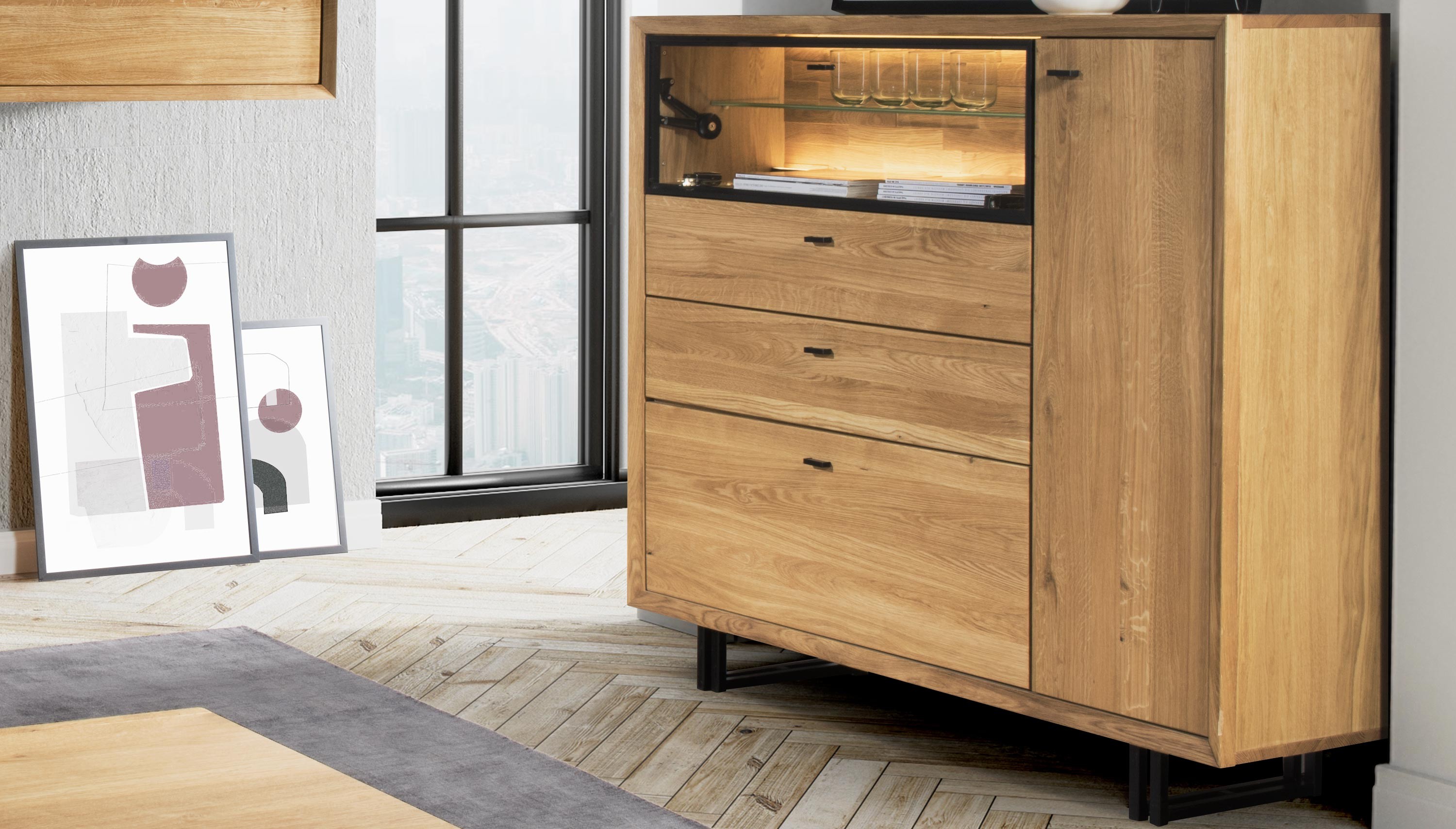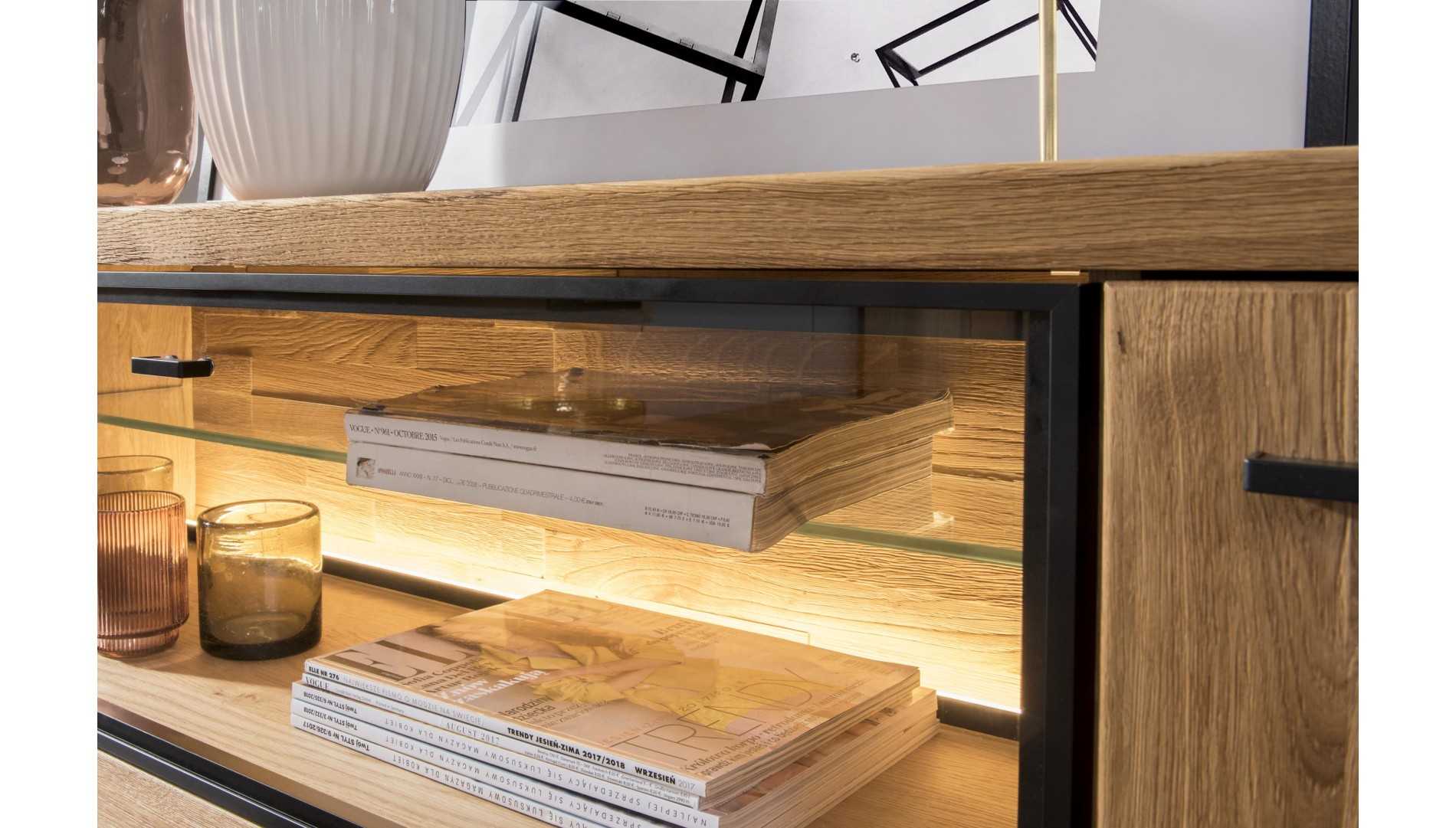 Tölgyfa tálalószekrény fém lábakkal, világítással, 134 cm széles