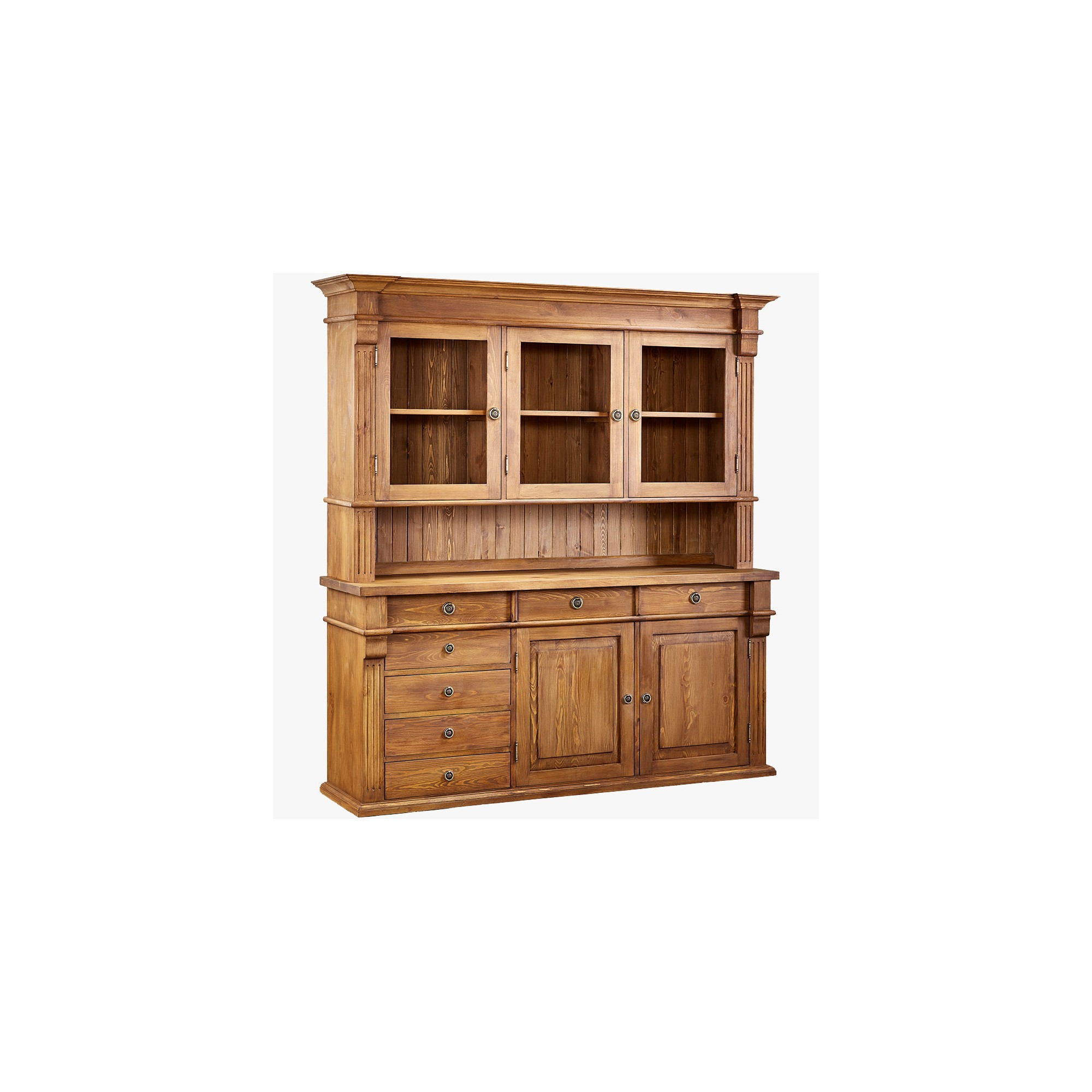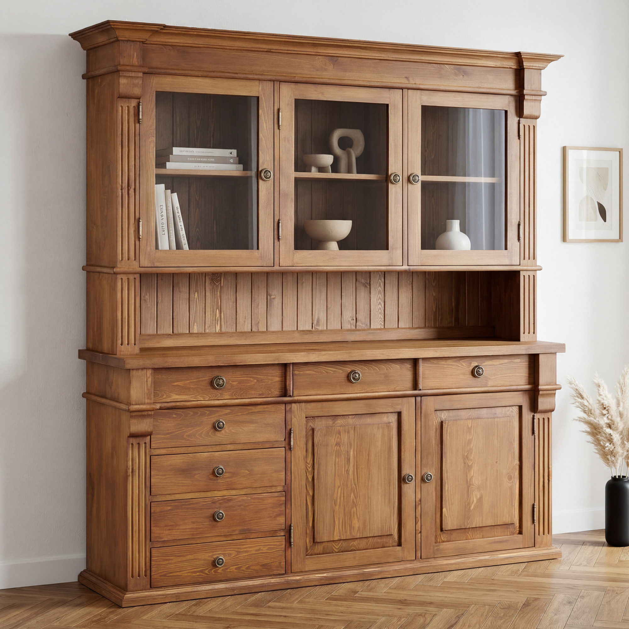 Prestige tálalószekrény (D-KRI-69) tömör fenyőből – barna lakk patinával, 182 × 192 × 45 cm