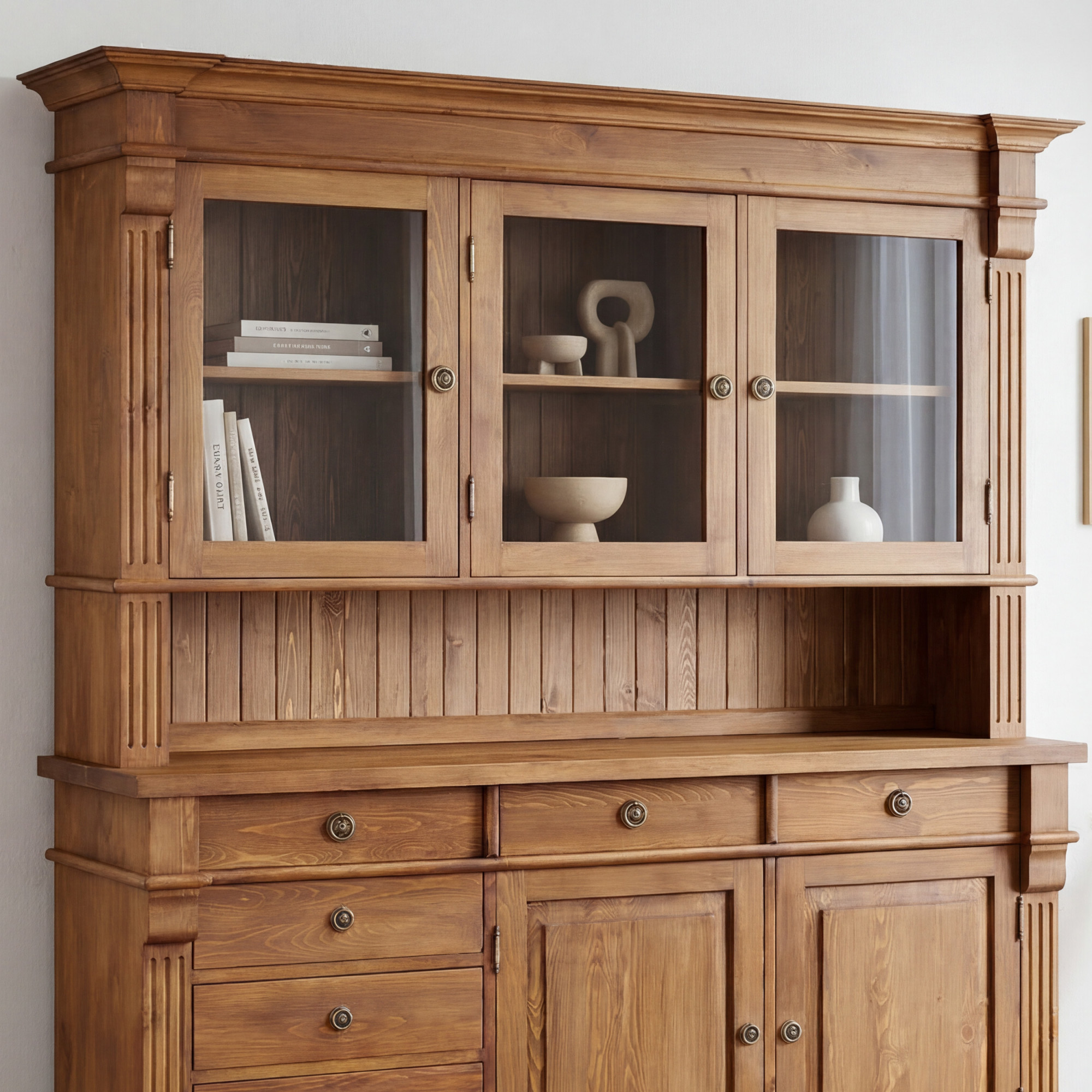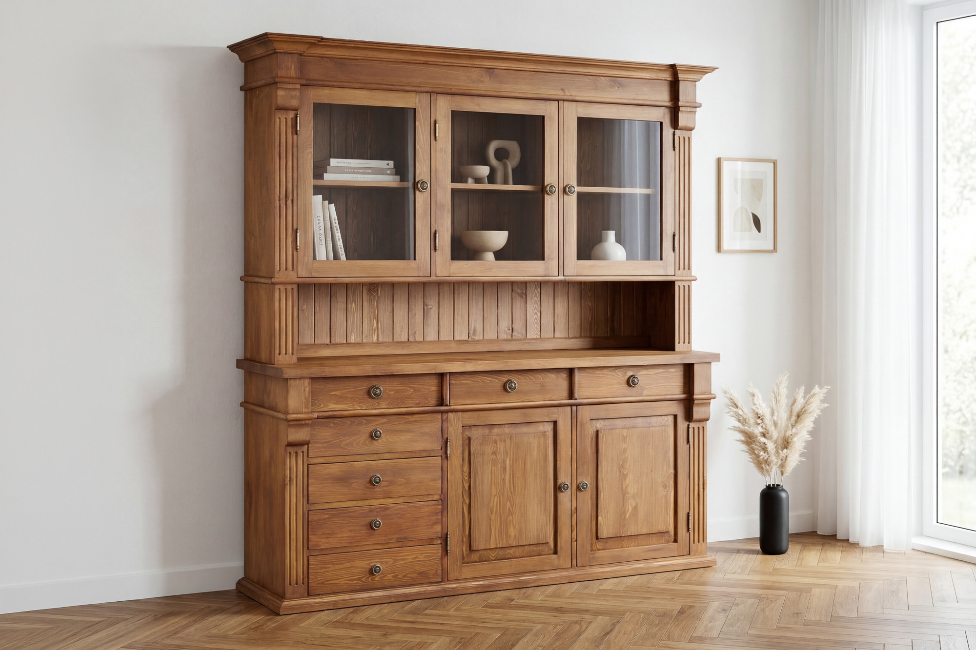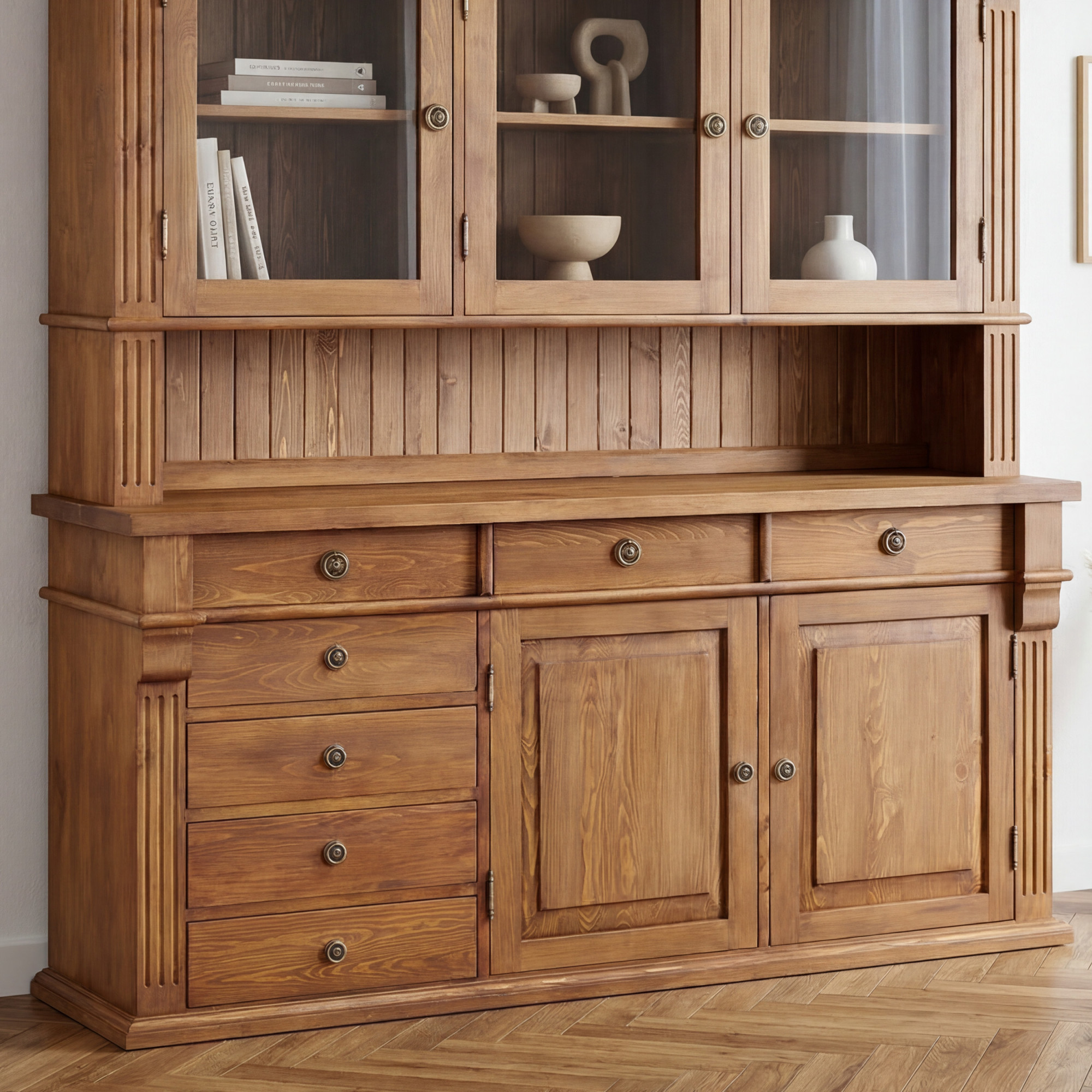 A tömör fenyő népszerű anyag szilárdsága, stabilitása és természetes szépsége miatt. A kézzel kialakított patina és a díszmarások kombinációjában olyan bútor jön létre, amely elegáns, otthonos és rendkívül reprezentatív hatást kelt. A tálalószekrény teljes megjelenését aláhúzza a olasz Bosetti Marella vasalat – minőségi pántok és fogantyúk antik rézszínben, amelyek tökéletesen illeszkednek a Prestige kollekció hagyományos stílusához.
