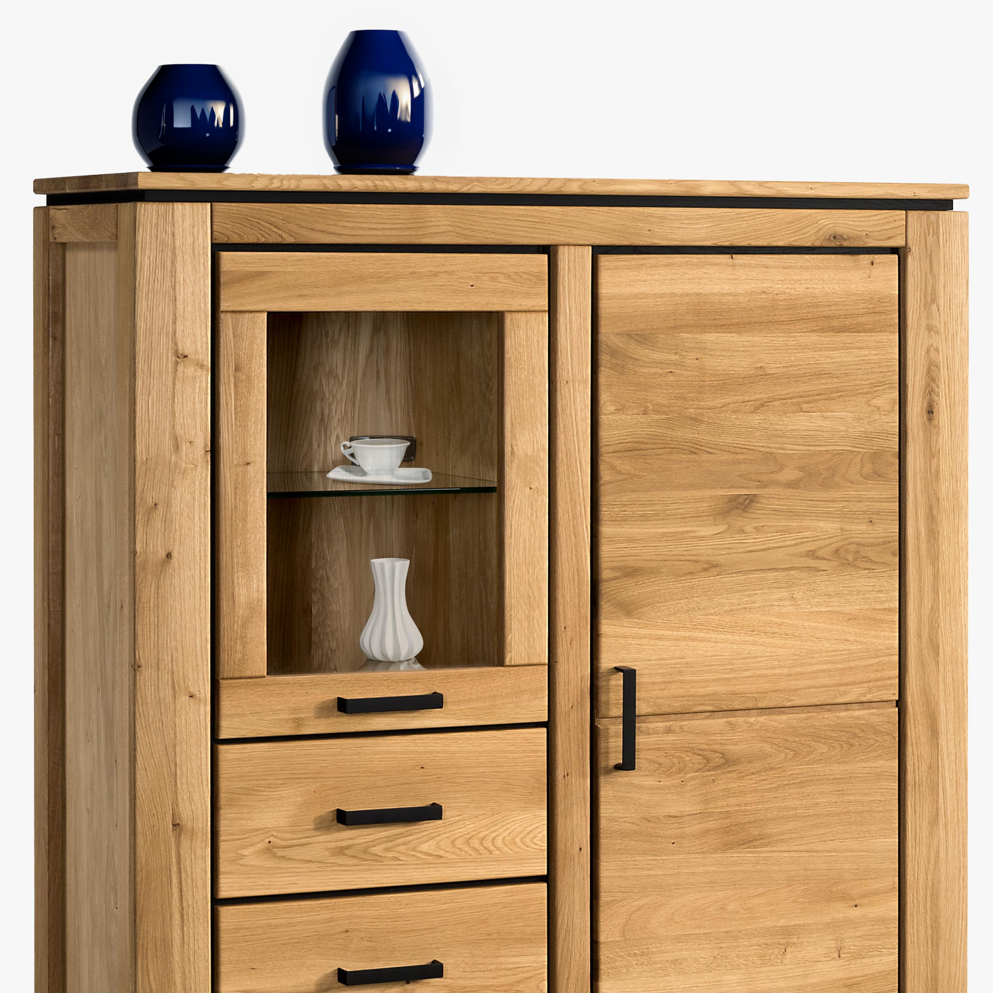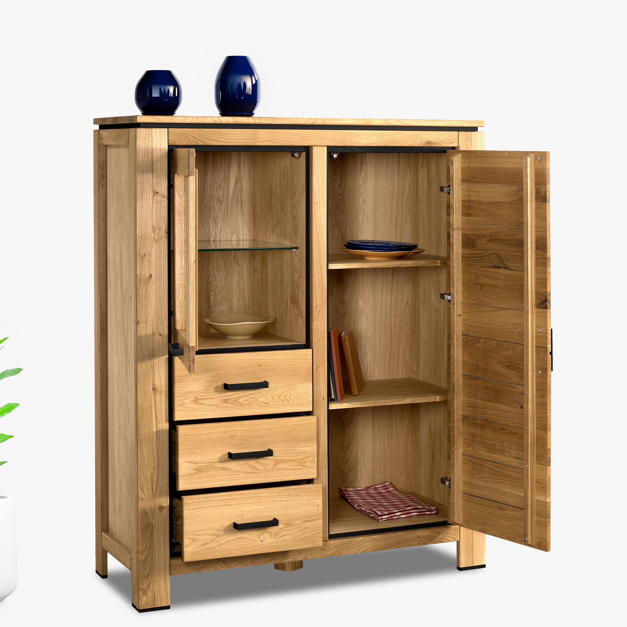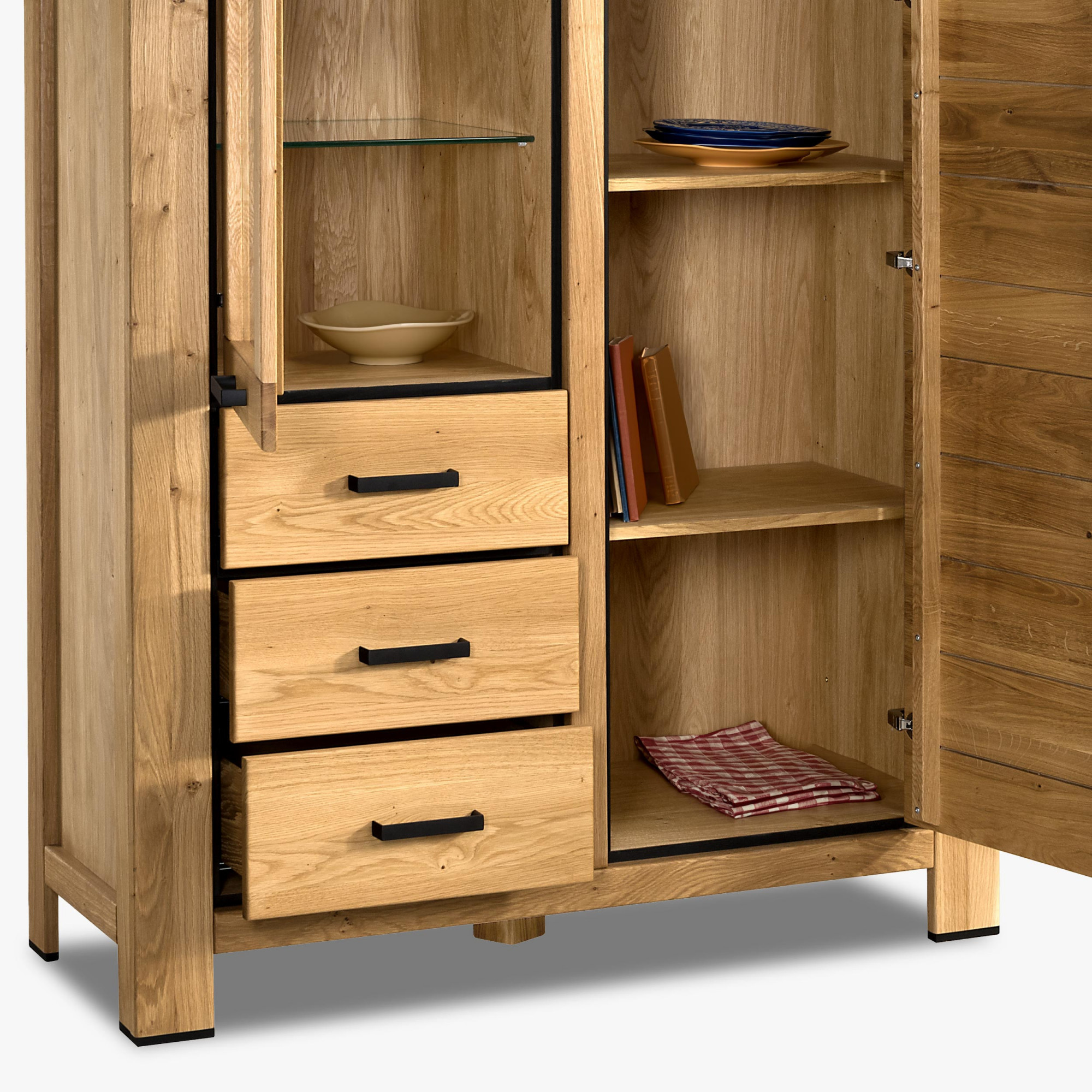 Tömör tölgyfa tálalószekrény New Line II, üvegajtós, 3 fiókos, natúr