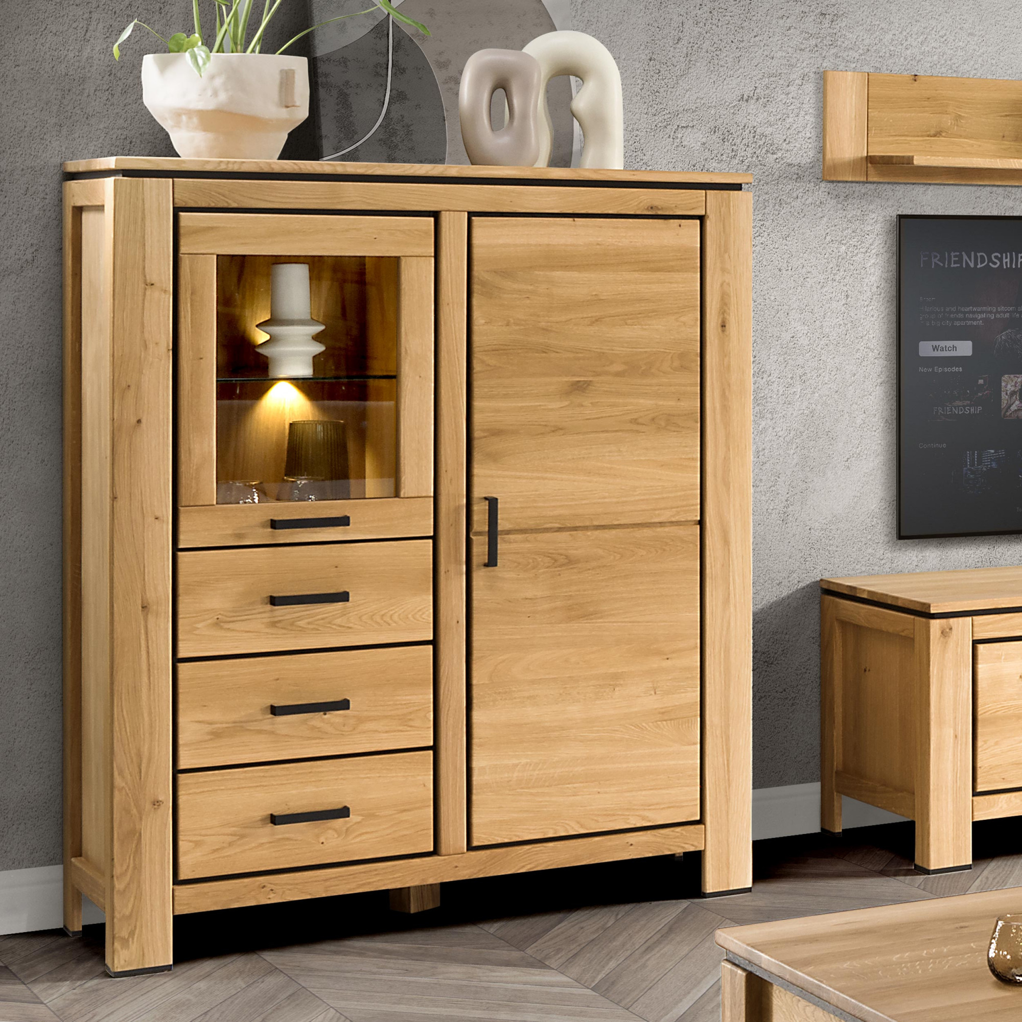 Ez a tölgyfából készült fa tálalószekrény legújabb New Line II kollekciónkból a funkcionalitás és az elegáns dizájn tökéletes ötvözete. Kiválóan illik bármely nappaliba vagy étkezőbe, ahol növeli az esztétikát és a praktikusságot. Magas minőségű tölgyfából készült, ez a vitrin bőséges tárolóhelyet kínál, amely üveg- és faajtókra valamint fiókokra van osztva. A vitrin jobb része ajtókkal rendelkezik, míg a bal oldalon három fiók és egy üvegajtó található, amely elegáns módon tárja fel gyűjteményeit vagy dekorációit. Minden ajtó és fiók ráadásul soft-close rendszerrel van felszerelve a csendes és biztonságos használat érdekében.