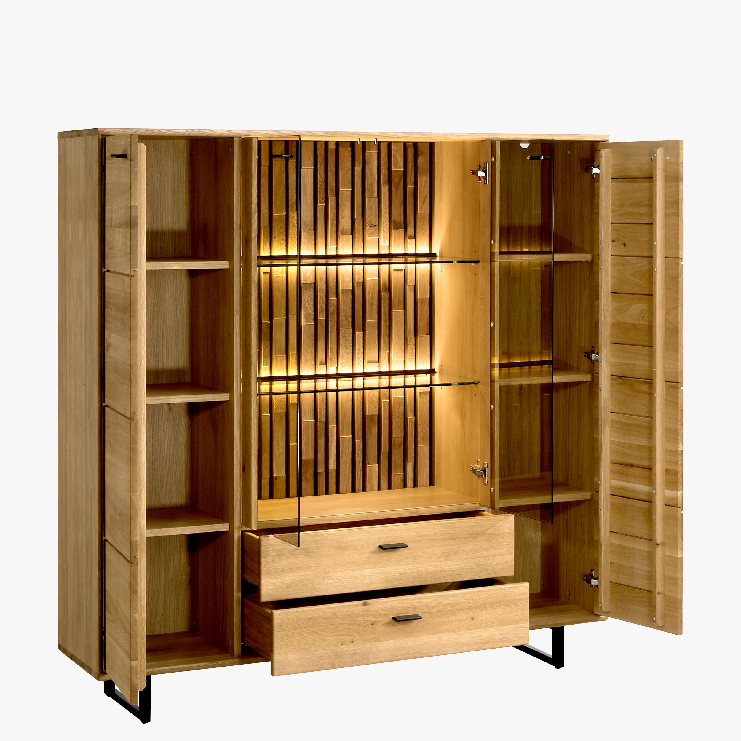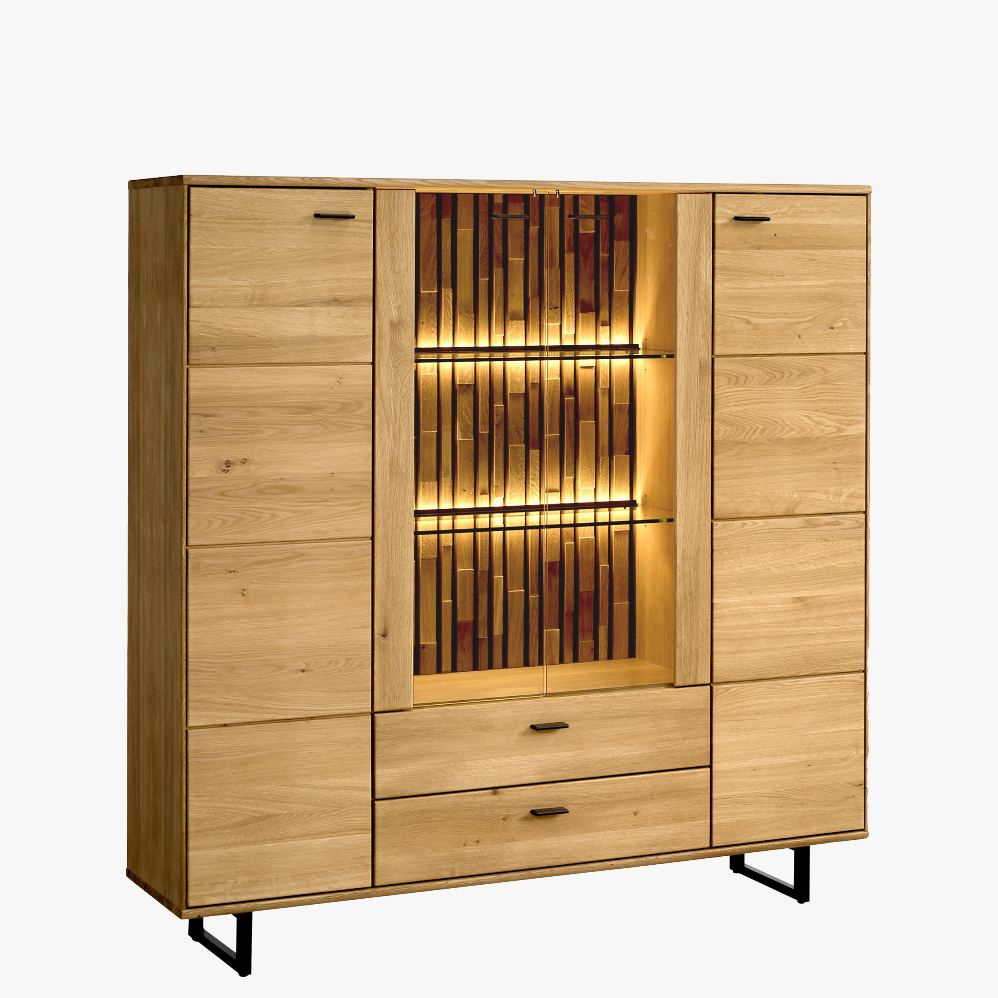 Fektessen be ebbe a magas komódba, tölgyfából és tölgy furnérból, és gazdagítsa belső terét egy gyönyörű, funkcionális és tartós bútordarabbal. Rendelje meg még ma, és vigyen otthonába egy darabot, amely a minőséget, eleganciát és gyakorlati hasznosságot ötvözi! A különféle tárolómegoldások biztosítják, hogy minden tárgya rendezett és könnyen hozzáférhető legyen. Az üveges ajtók és a teljes tölgyfa ajtók kombinációja vizuális kontrasztot és gyakorlati tárolási megoldásokat nyújt.
