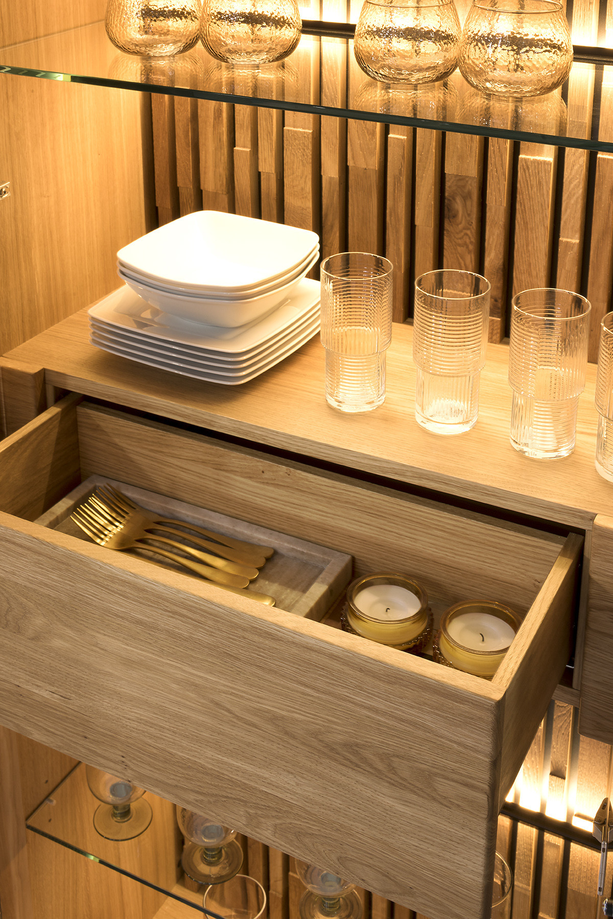 Esztétikus és funkcionális kialakítás: A komódot az esztétika és a funkcionalitás figyelembevételével tervezték. A komód középső része üvegtáblás ajtókat tartalmaz, amelyek elegáns helyet biztosítanak dísztárgyak, edények vagy könyvek bemutatására. A két oldalsó rész teljes tölgyfa ajtókkal rendelkezik, amelyek tágas polcokat rejtenek a tárgyak diszkrét tárolására.