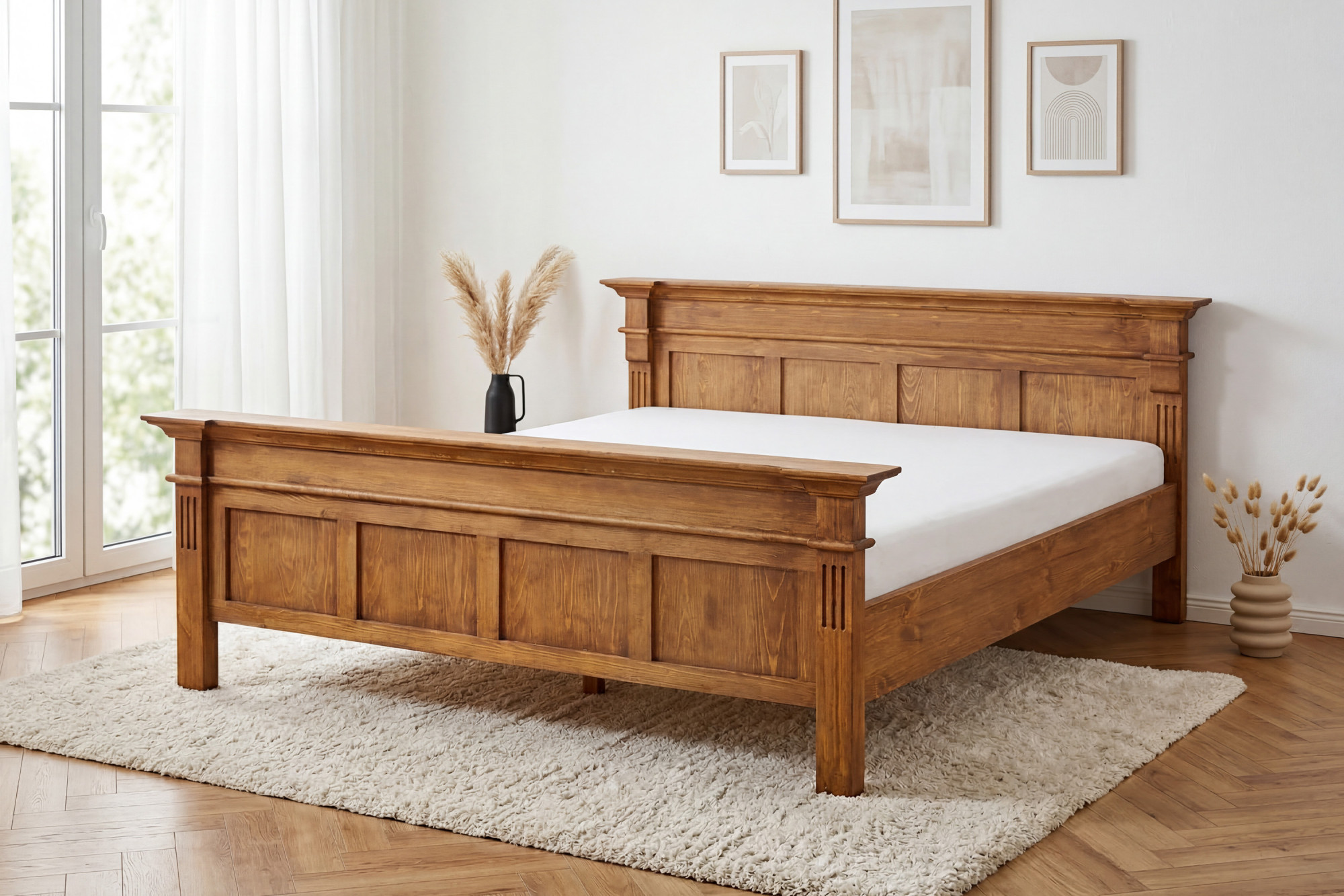 Prestige tömörfa ágy 180 x 200 cm ideális választás mindazok számára, akik minőségi, fenyő tömörfából készült franciaágyat keresnek masszív szerkezettel, hosszú élettartammal és időtálló rusztikus megjelenéssel. A tömör fenyőfa kidolgozás nagy stabilitást és tartósságot biztosít a mindennapi használat során. Az elegáns barna lakk rusztikus patinával kiemeli a fa természetes erezetét és kellemes, otthonos hangulatot kölcsönöz a hálószobának.