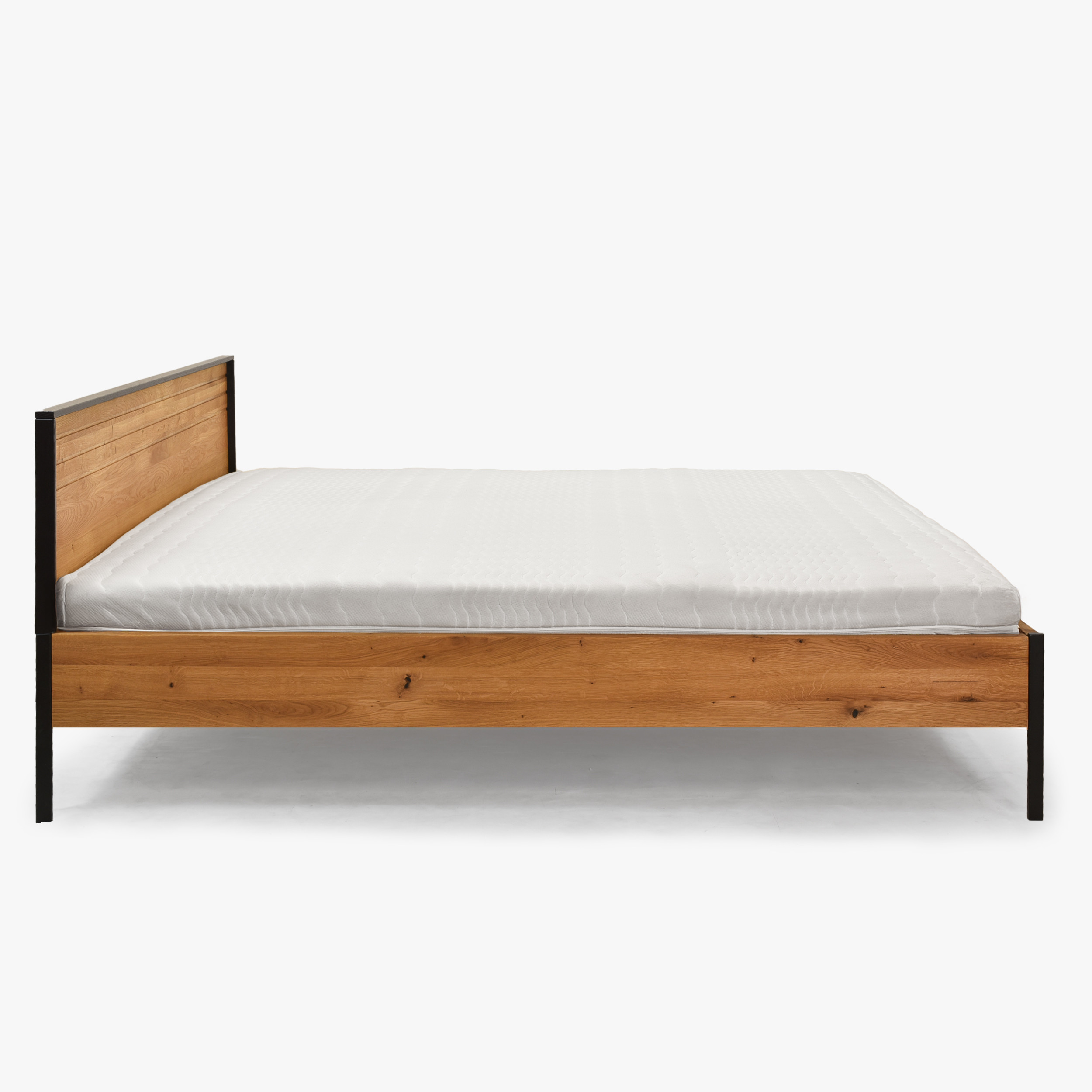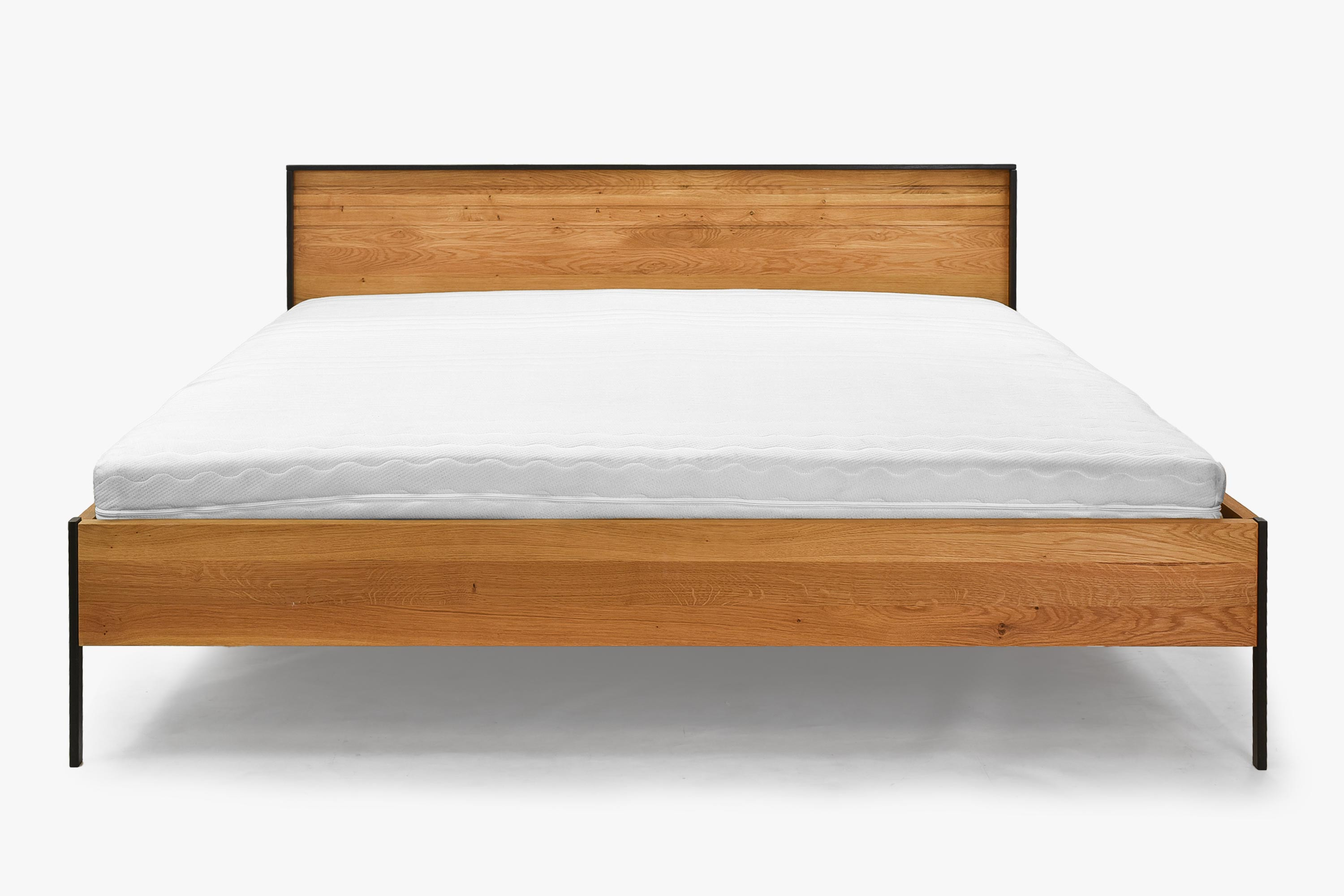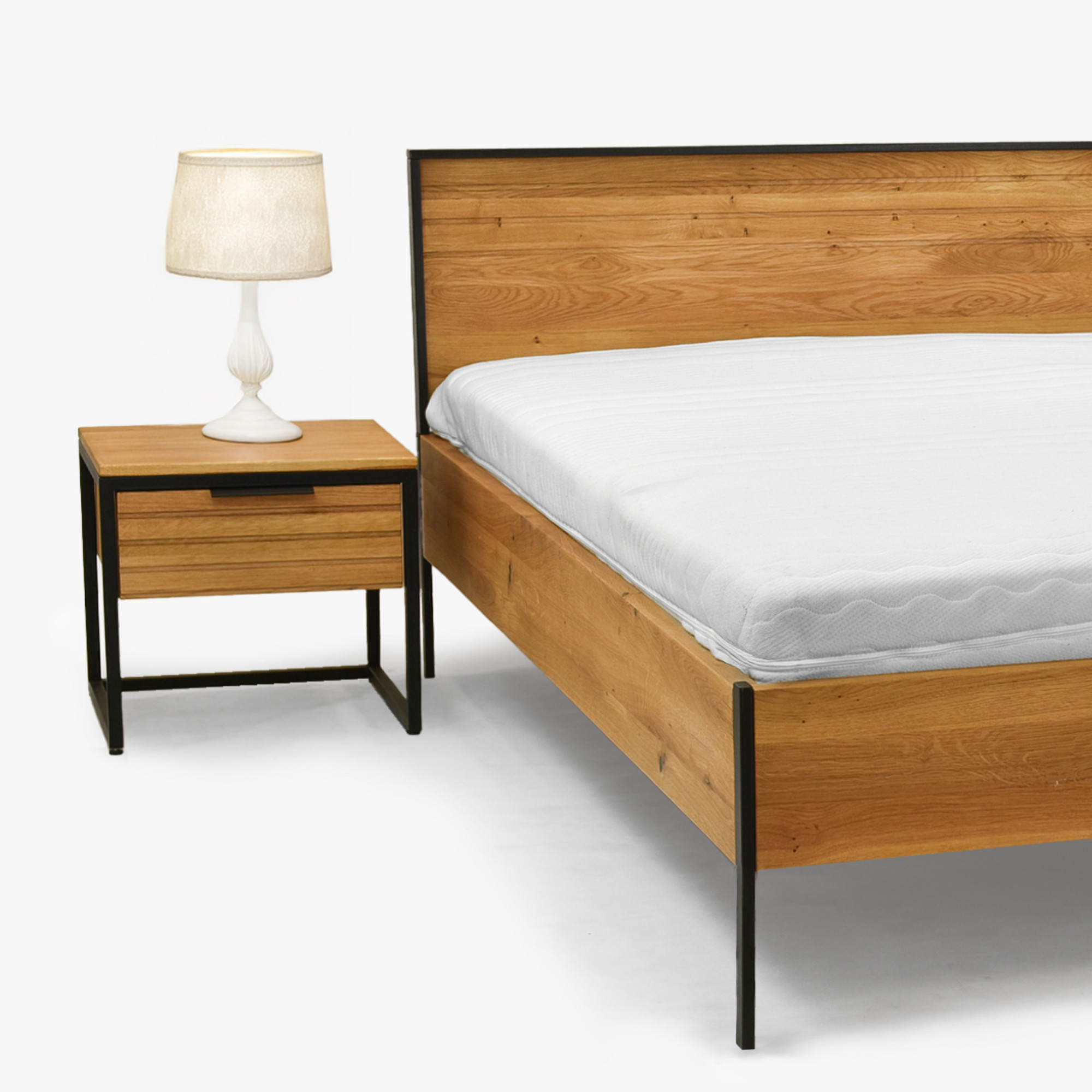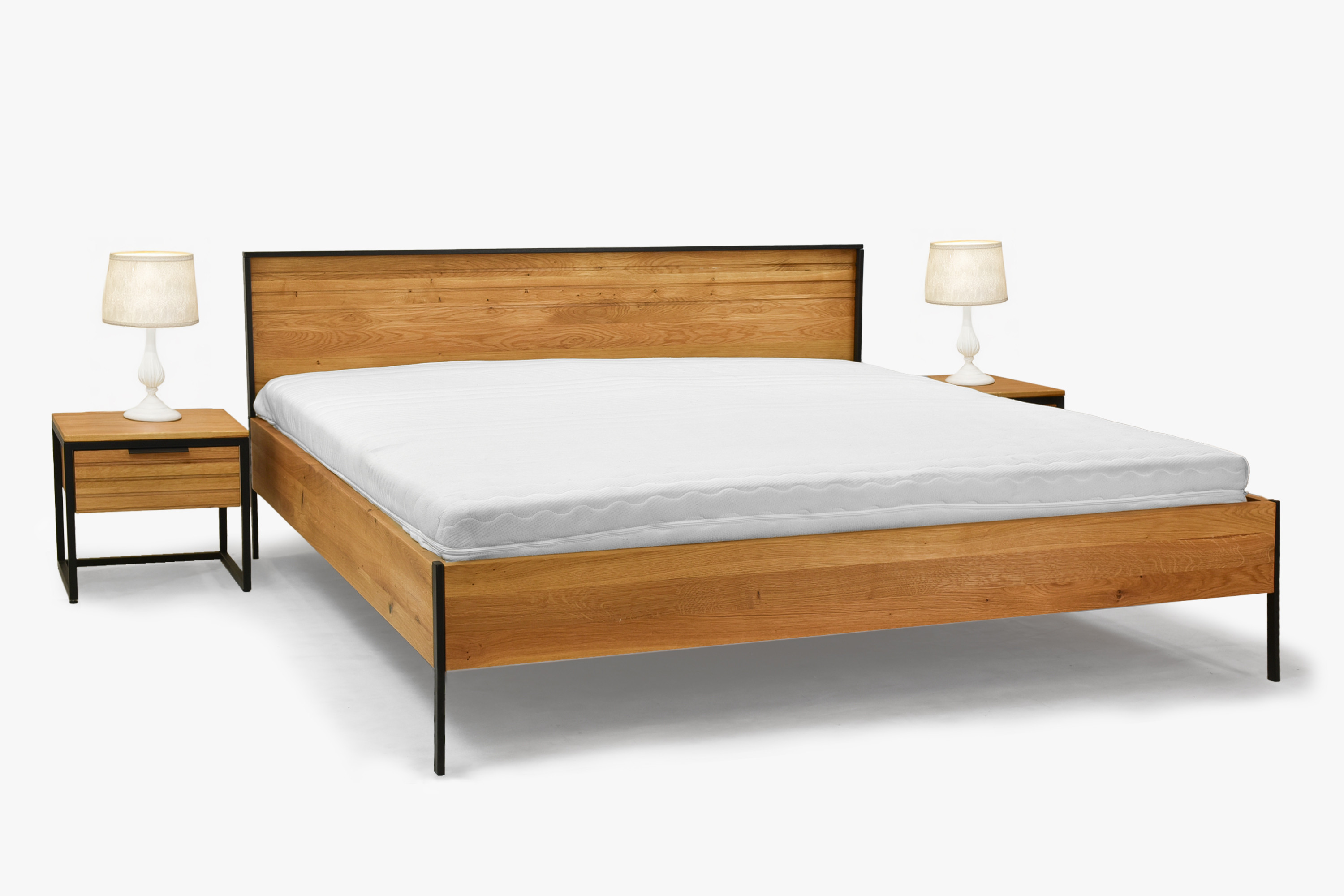 A Verona tölgy franciaágy azoknak készült, akik a hálószobában letisztult vonalakat, valódi természetes anyagokat és hosszú élettartamot szeretnének. A keret 25 mm vastag tömör tölgyfából készült, amely FSC tanúsítvánnyal rendelkező erdőkből származik, és FSC certifikací van kezelve természetes olajjal — kiemeli a fa erezetét és egyben védi azt a napi kopástól. A 180 × 200 cm méretnek köszönhetően befogad bármilyen, saját kerettel rendelkező ágyrácsot vagy két 90 × 200 cm-es ágyrácsot. Az elegáns kontrasztot a fém lábak és a fekete keret a fejvég körül biztosítják, amelyek modern ipari hangsúlyt adnak az ágyhoz anélkül, hogy csorbítanák a tömörfa otthonosságát.