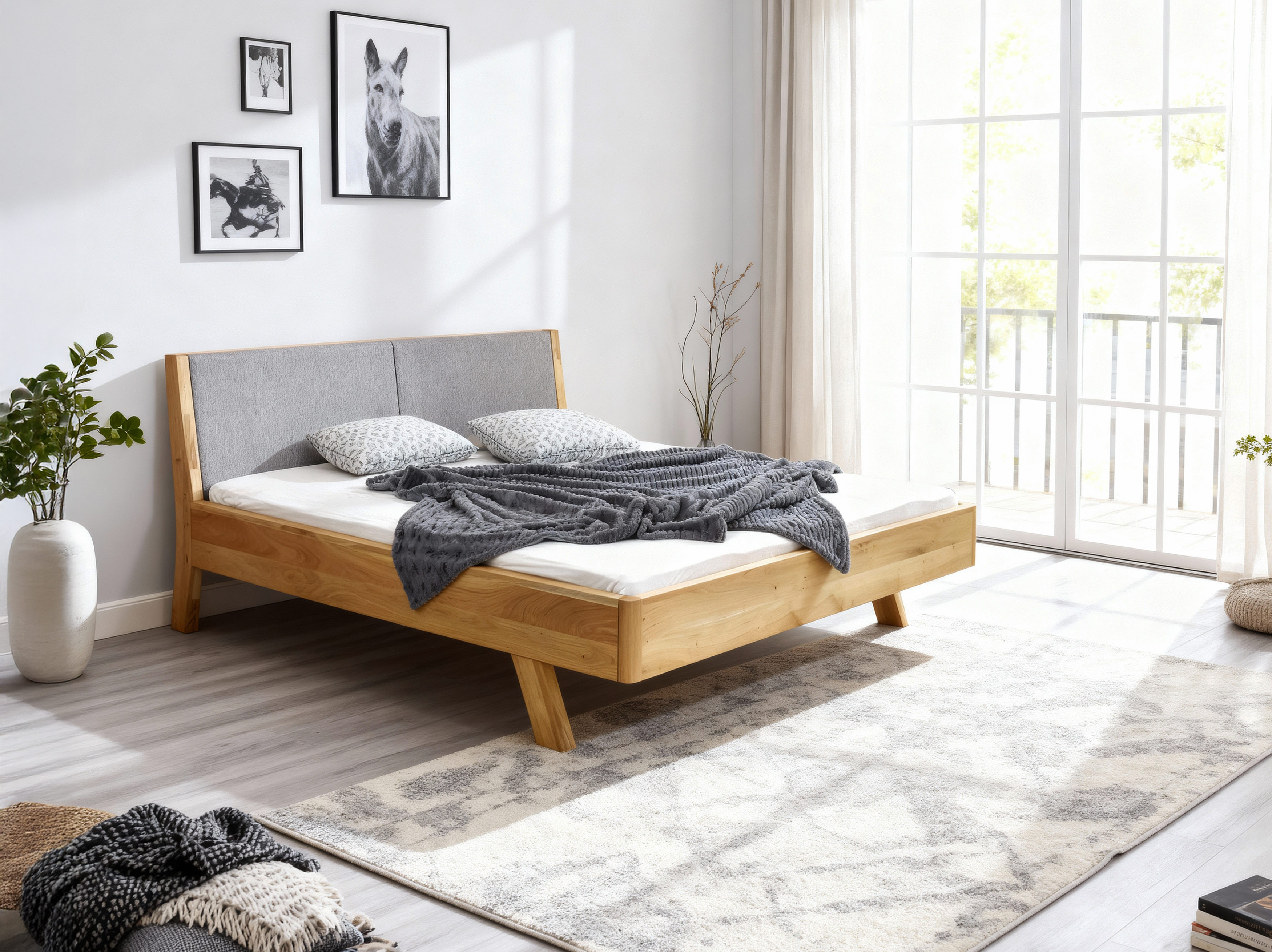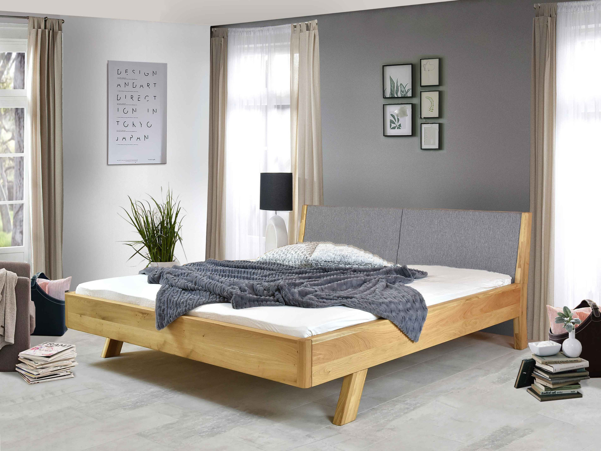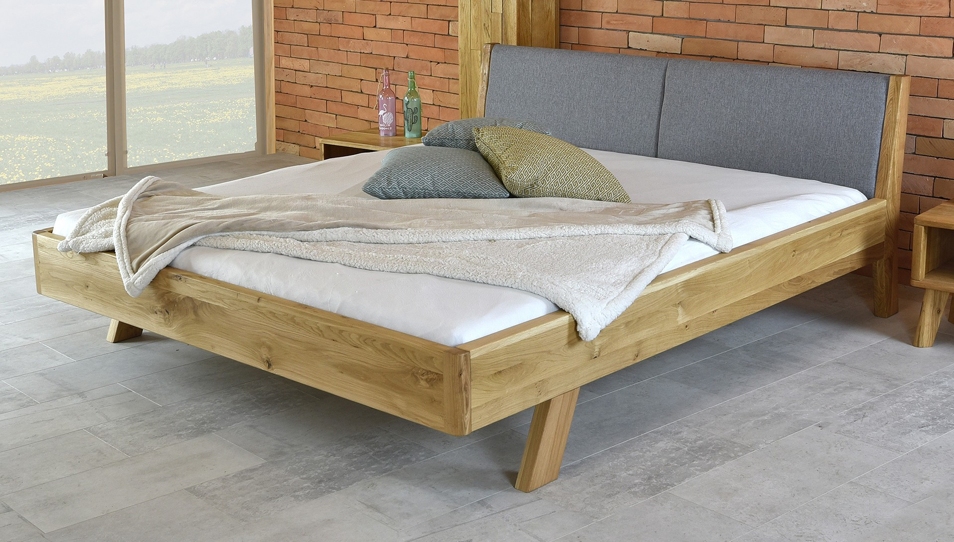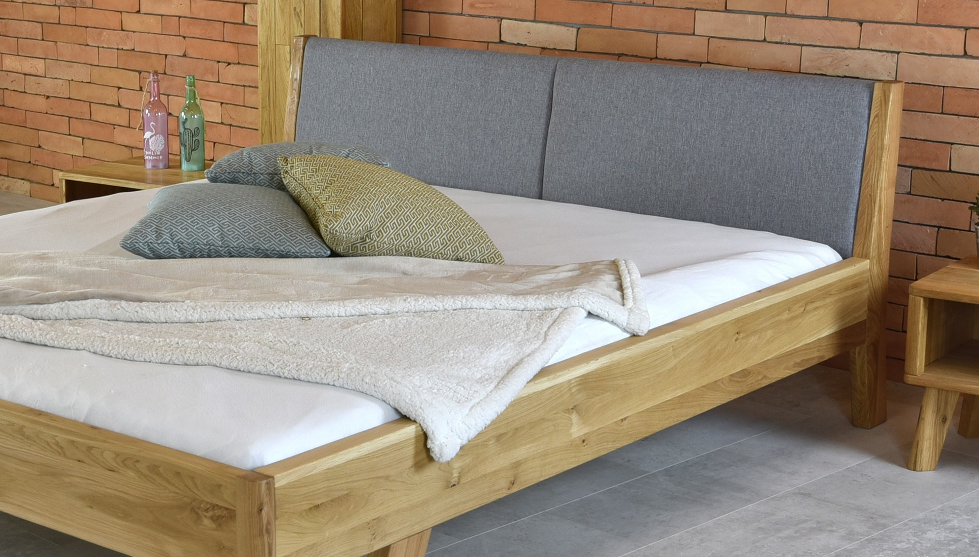 Tömör tölgy kétszemélyes ágy szürke kárpitozott fejtámlával 160x200 cm