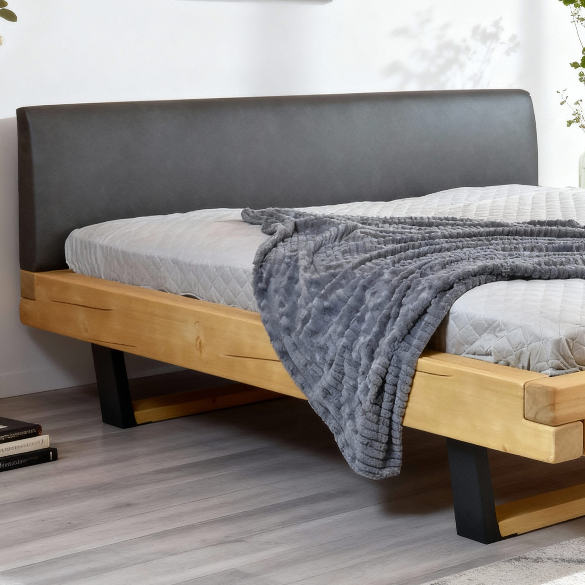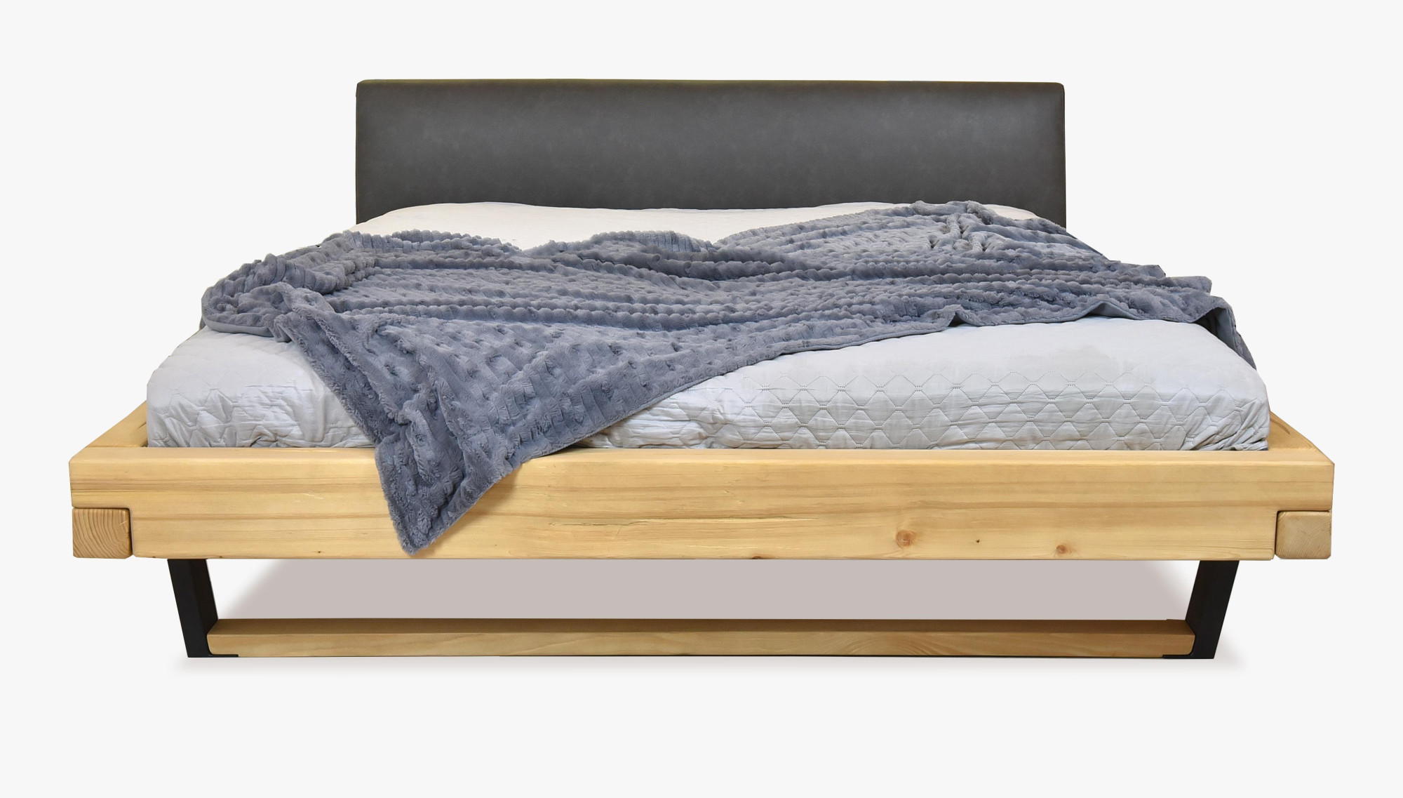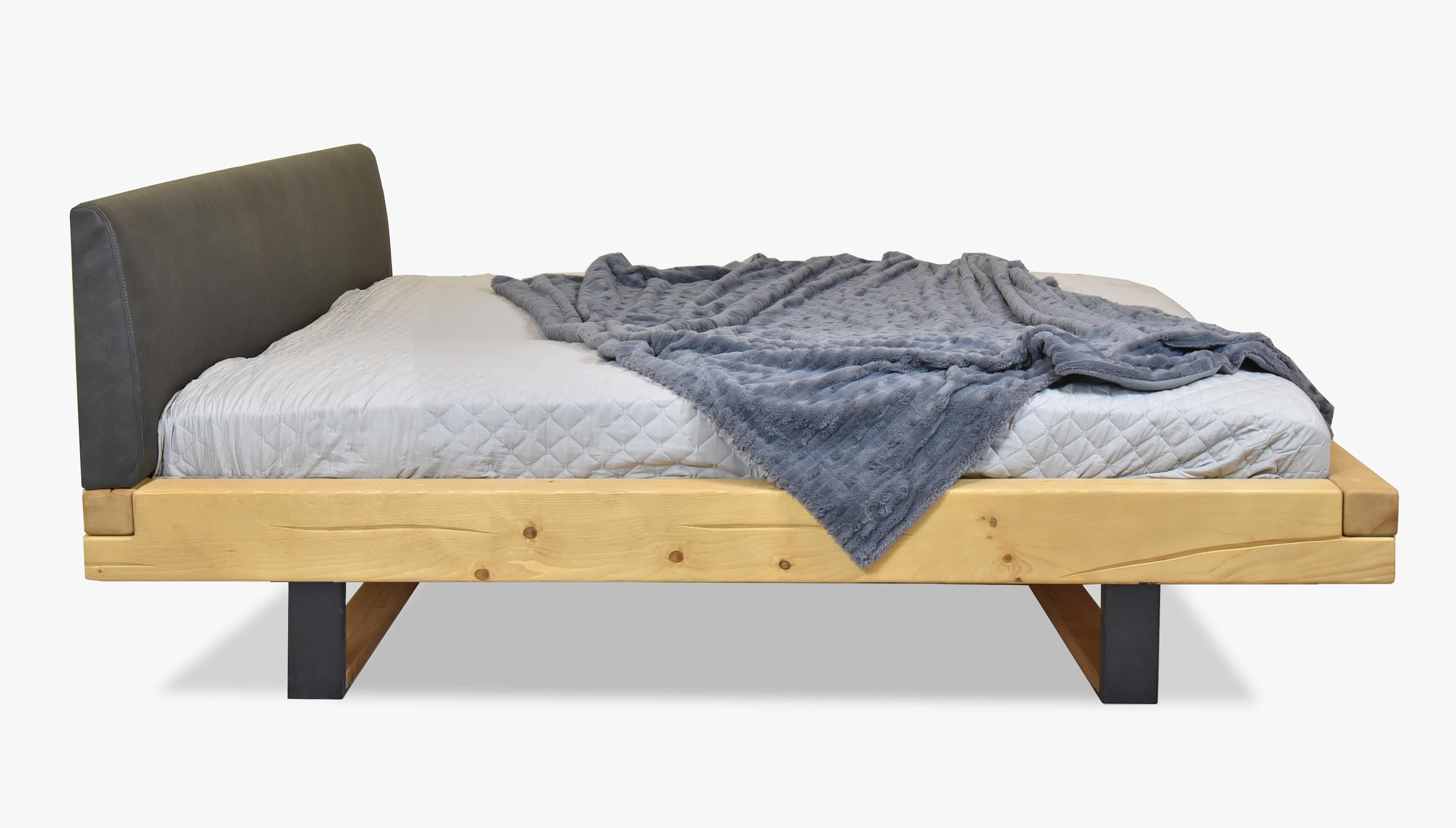 Fenyő tömörfa franciaágy kárpitozott fejtámlával, fekete fém lábakkal