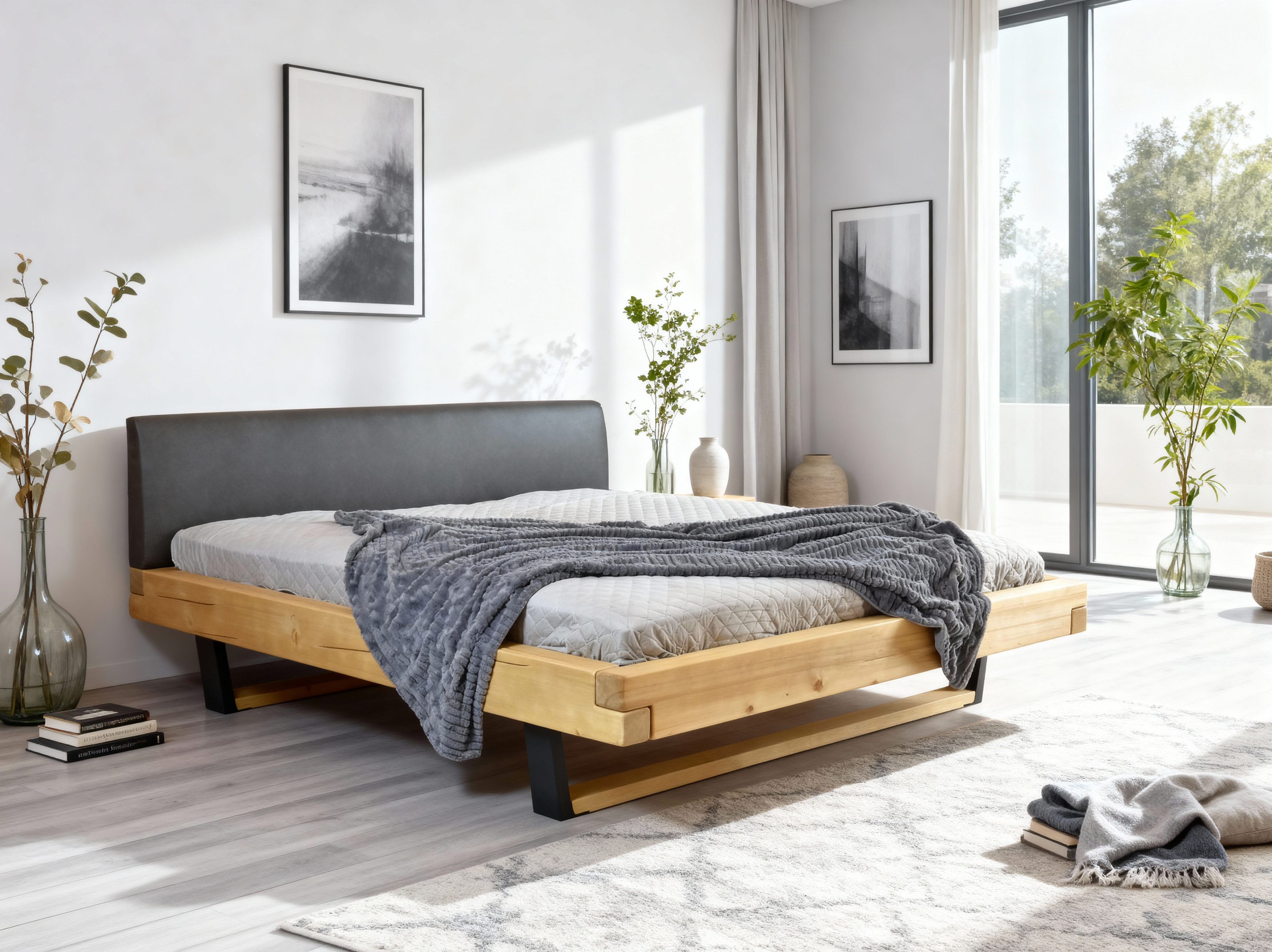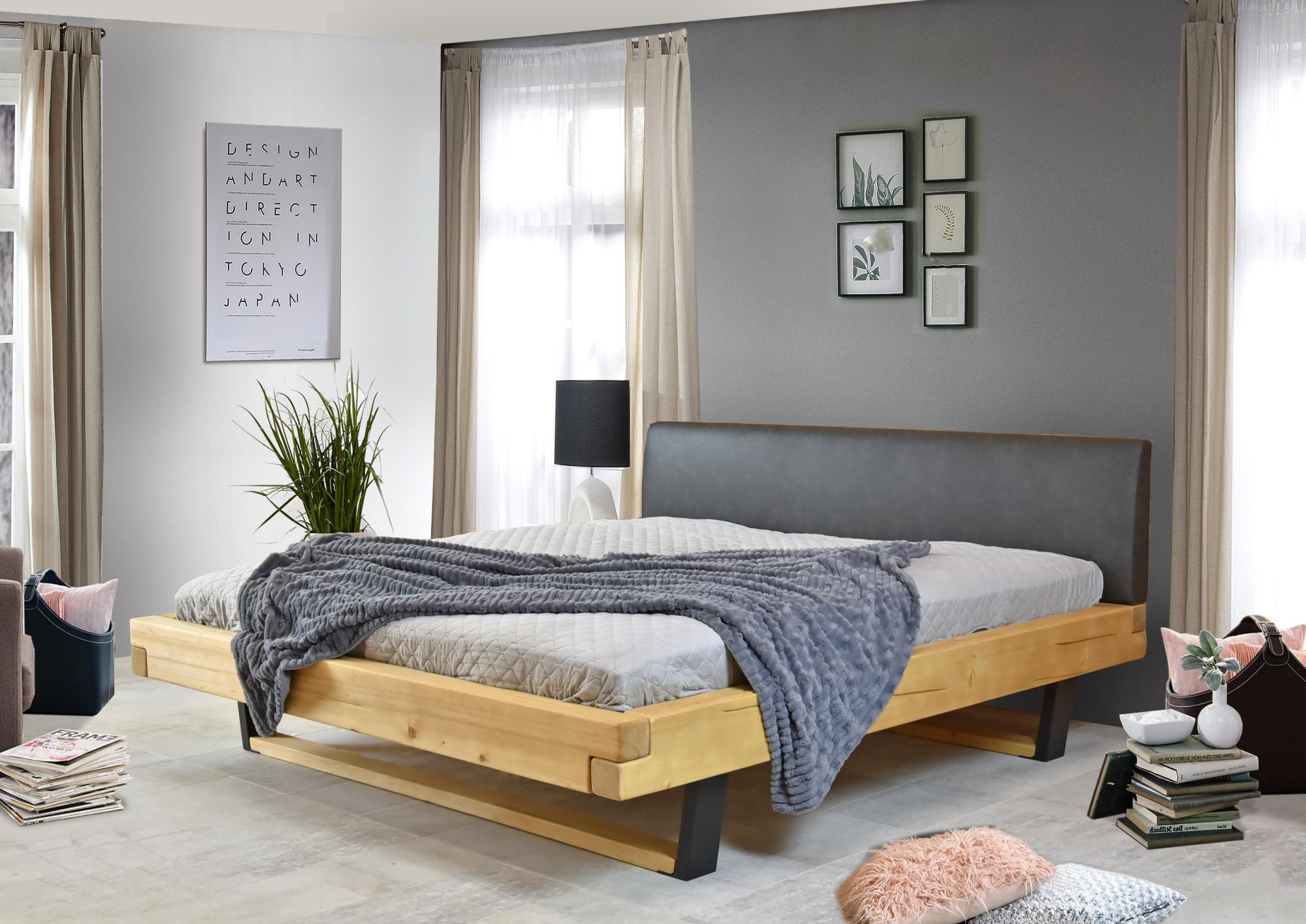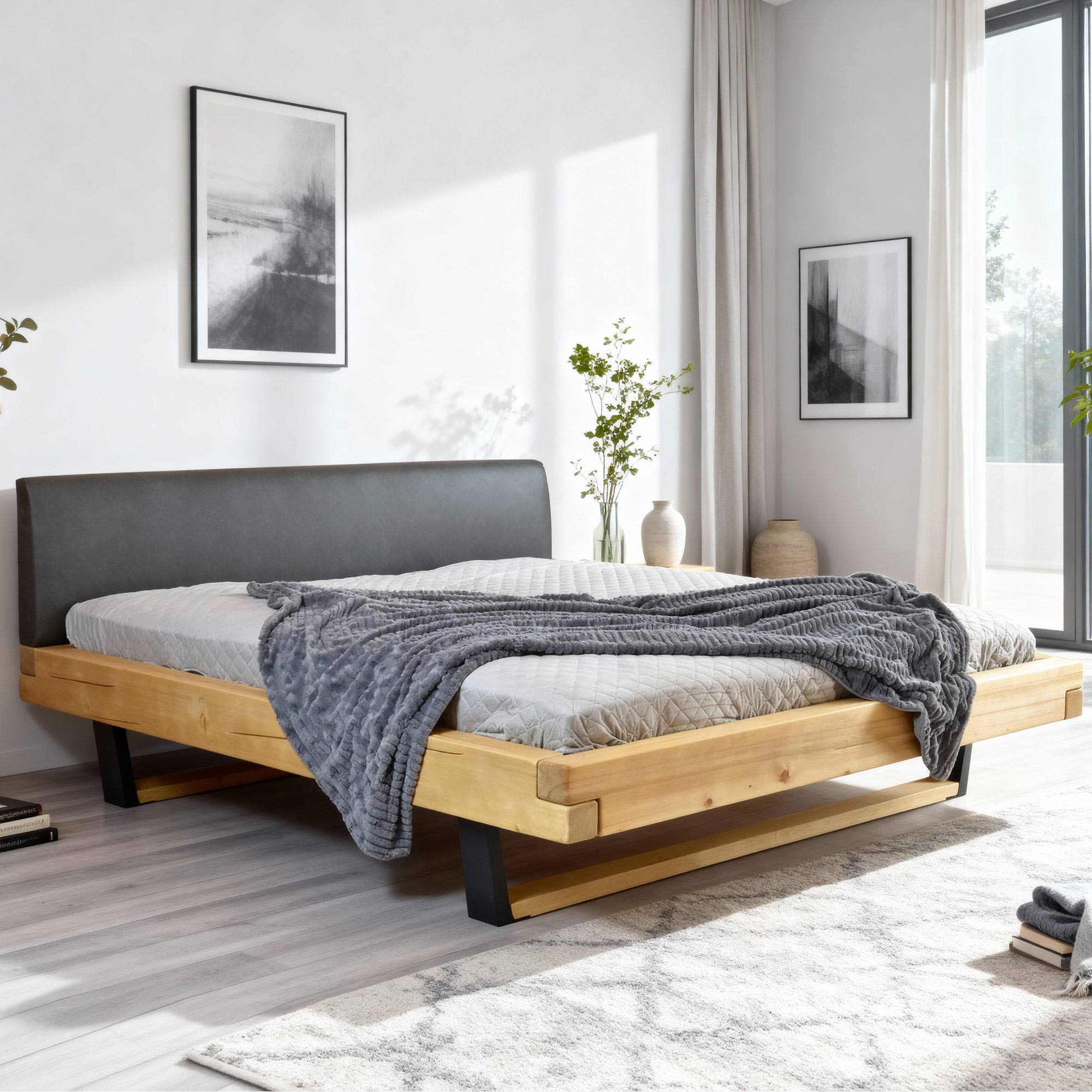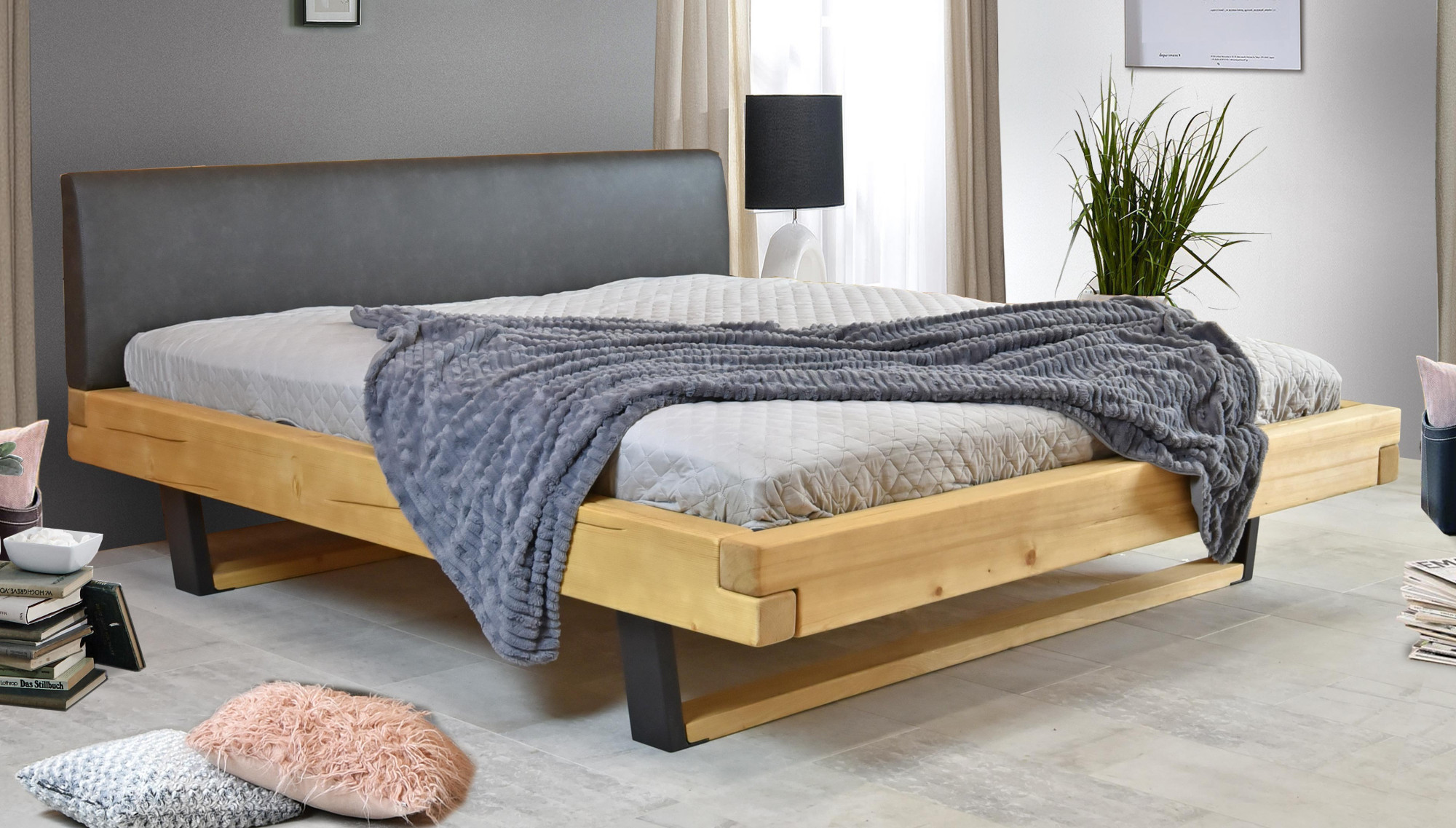Fenyő tömörfa franciaágy kárpitozott fejtámlával, fekete fém lábakkal