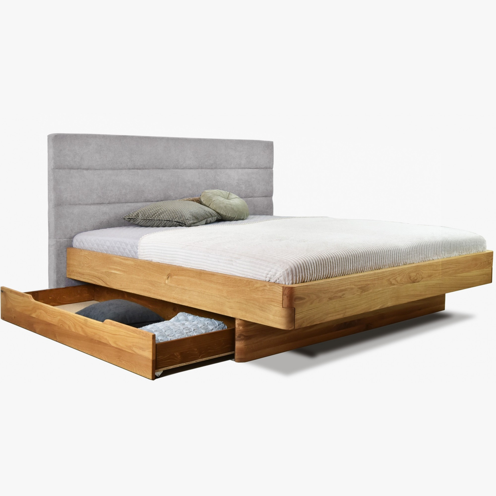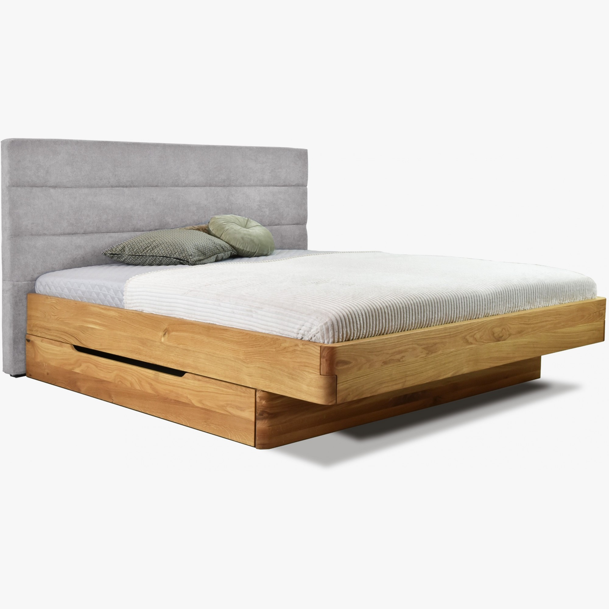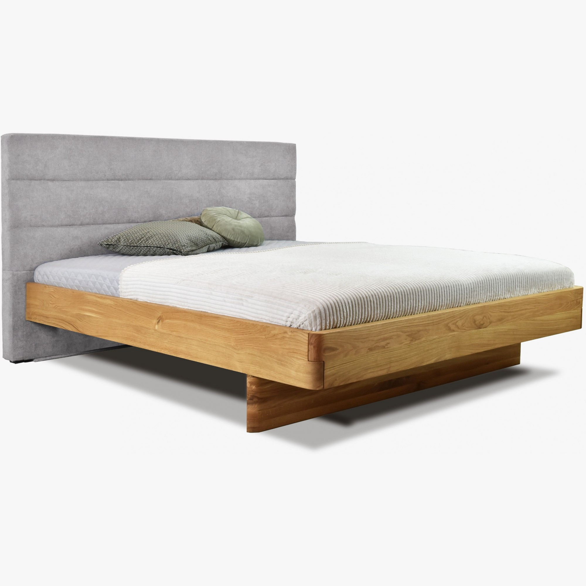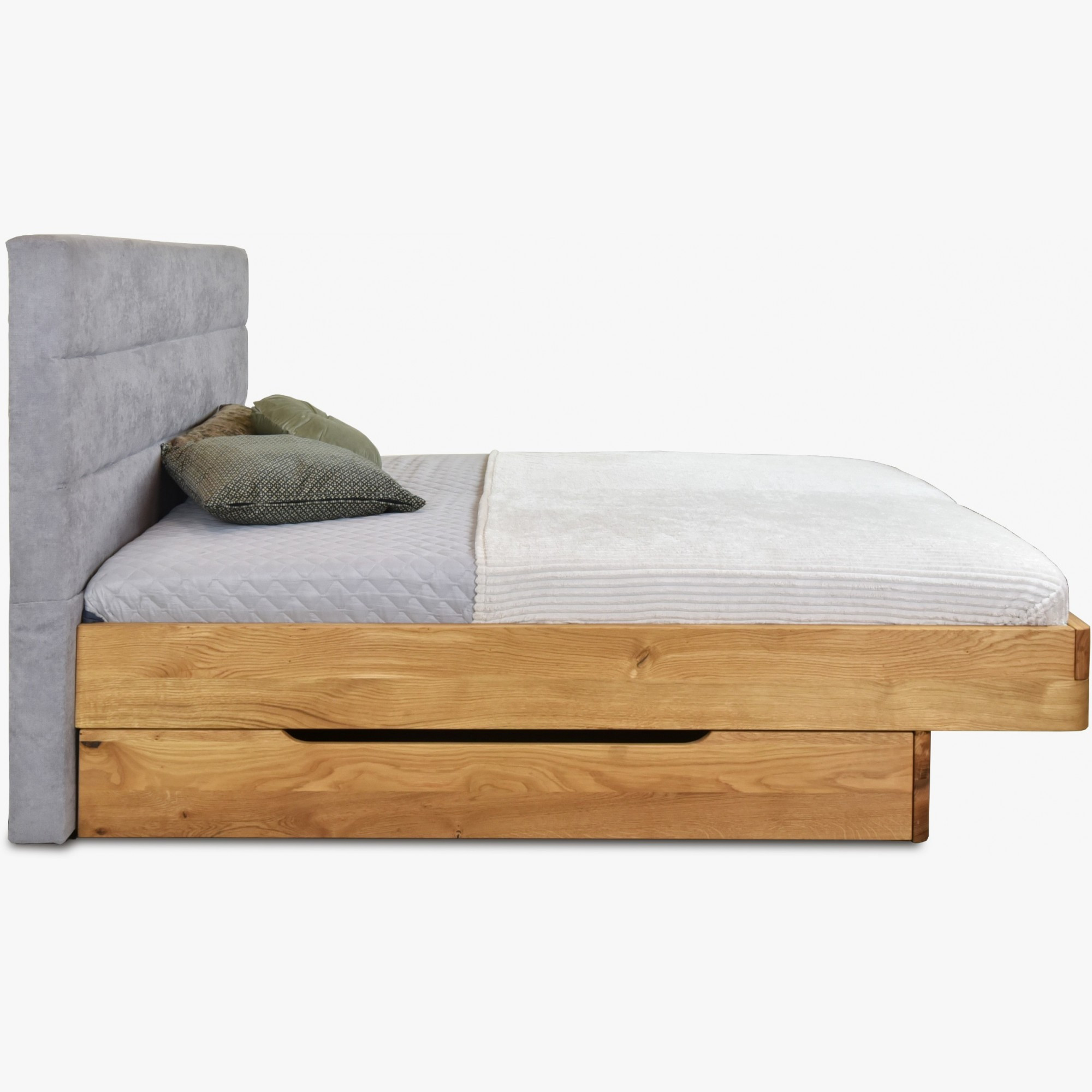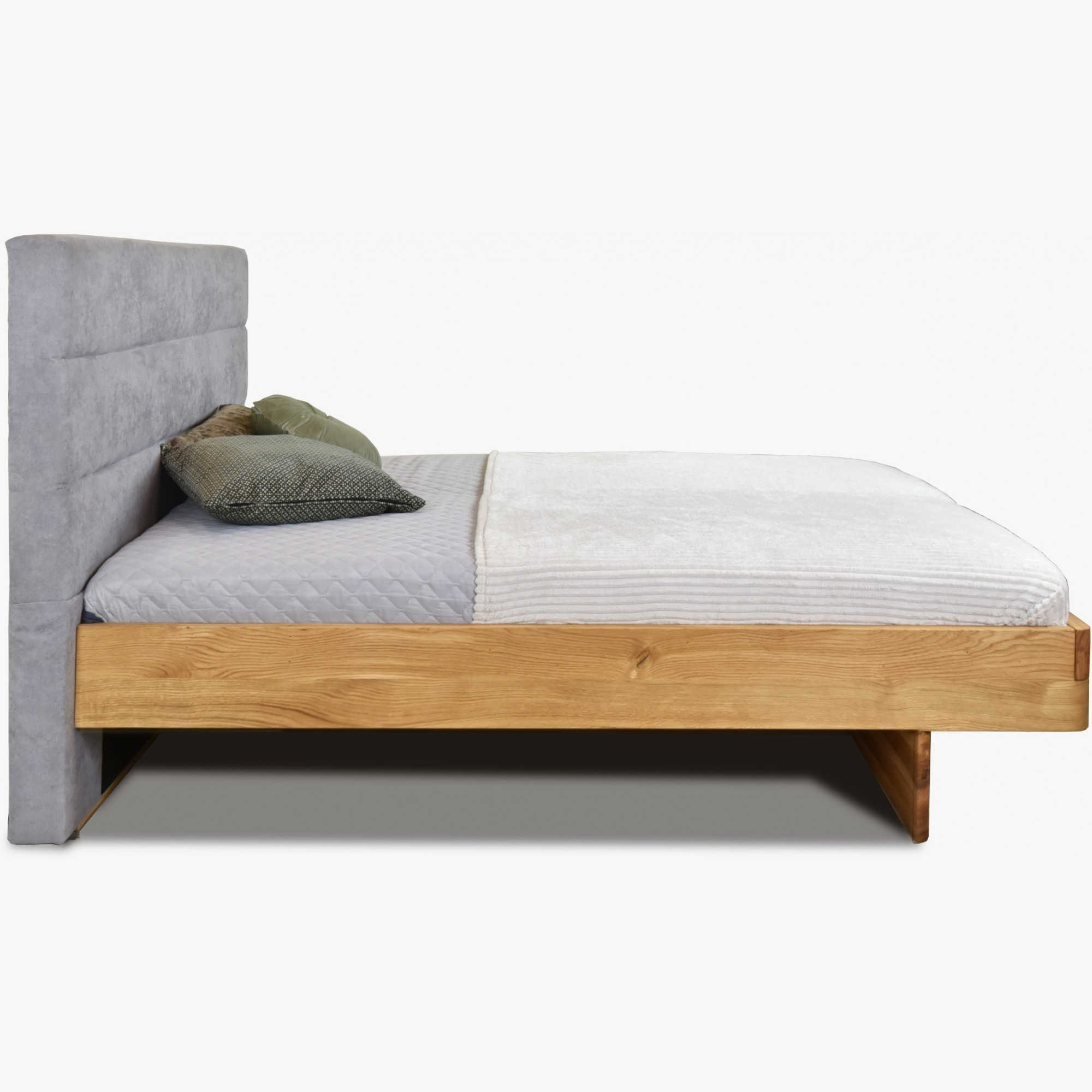 Tömör tölgyfa franciaágy kárpitozott szürke fejtámlával 160x200 cm