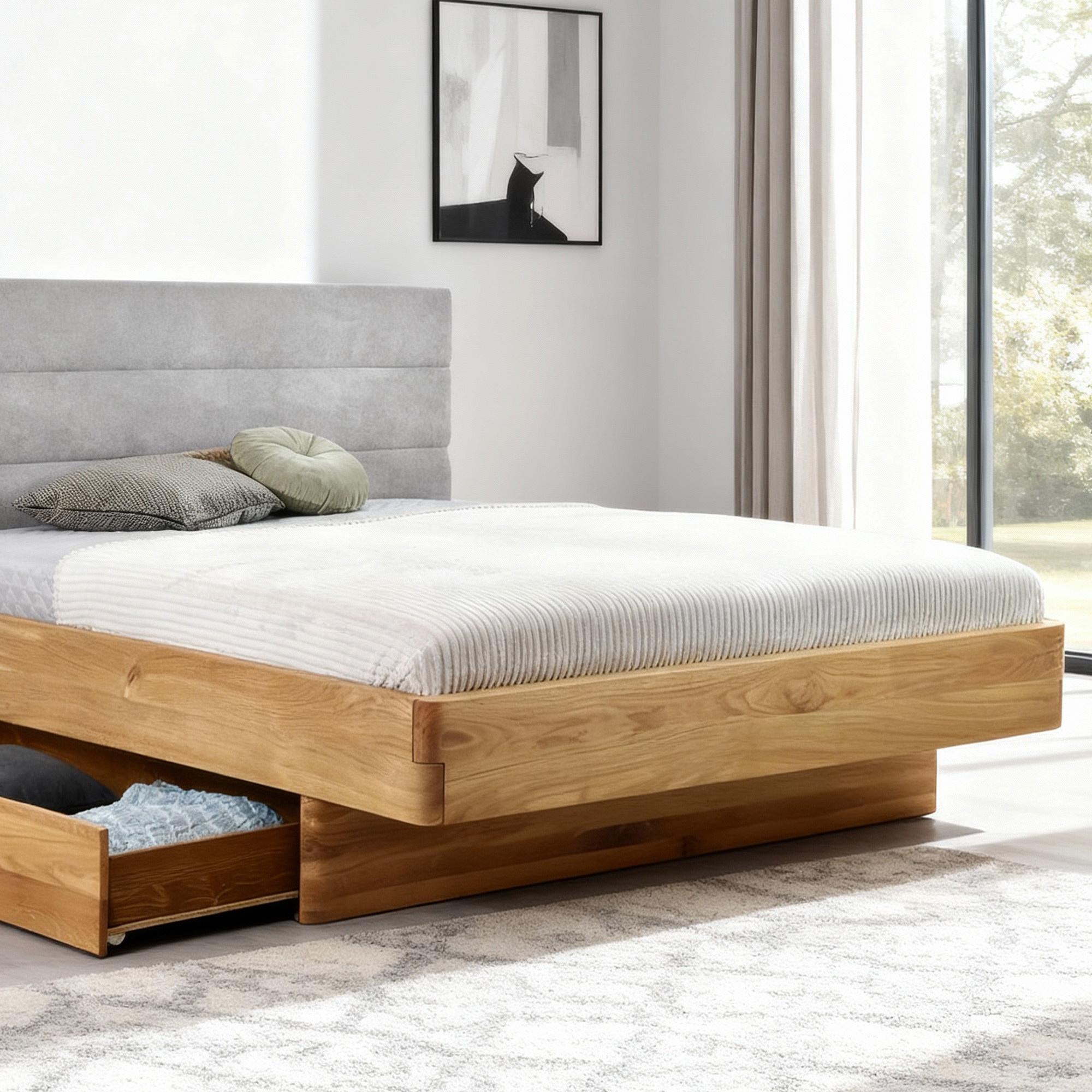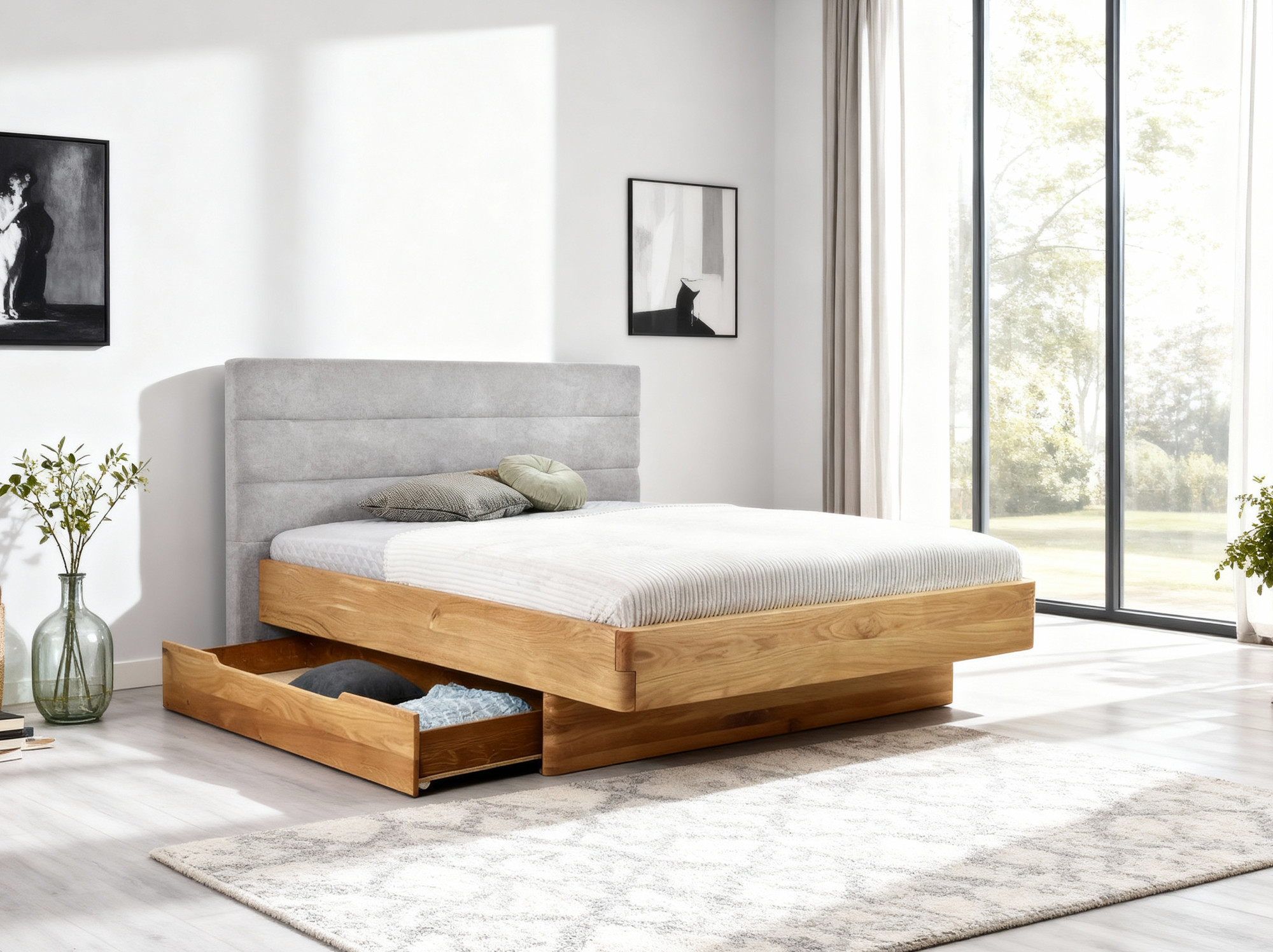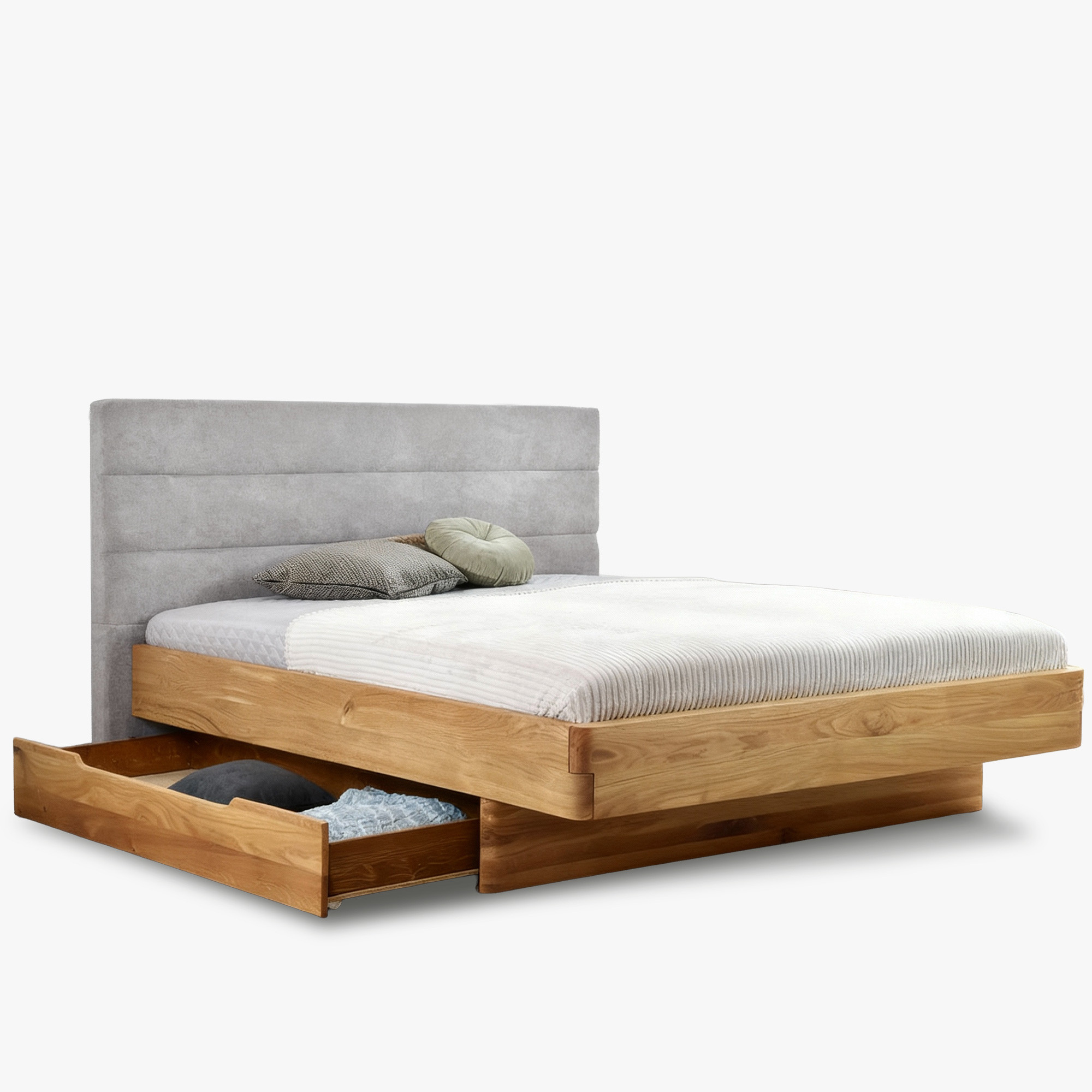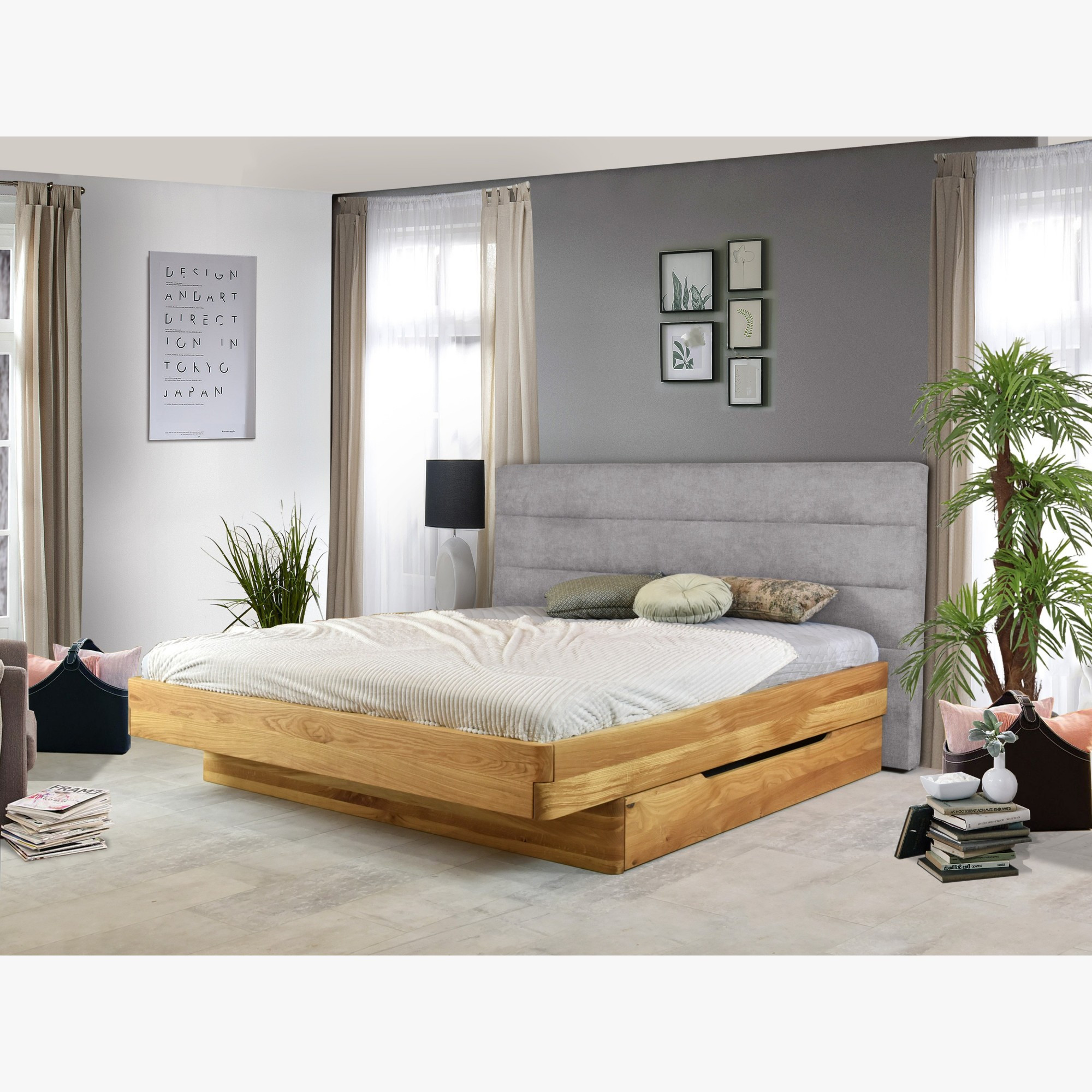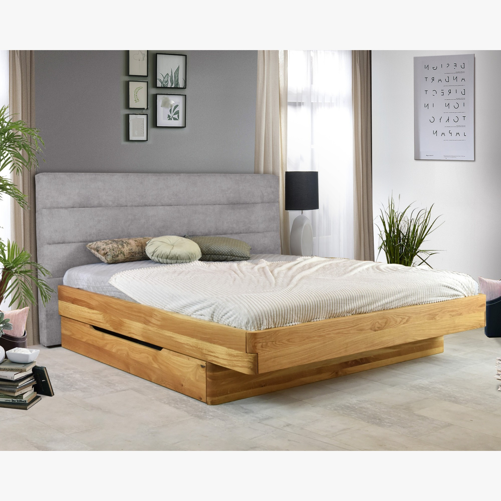 Tömör tölgyfa franciaágy kárpitozott szürke fejtámlával 160x200 cm