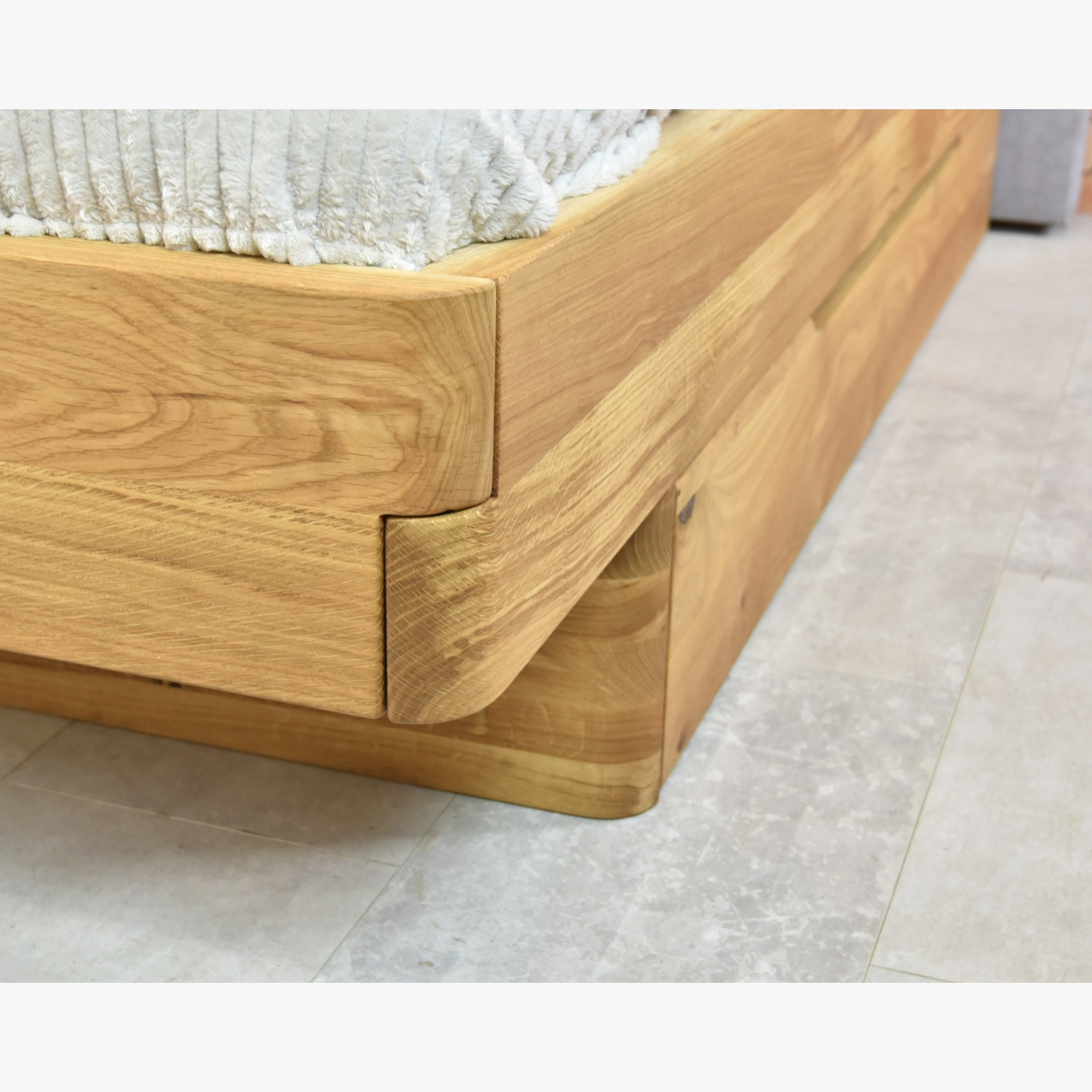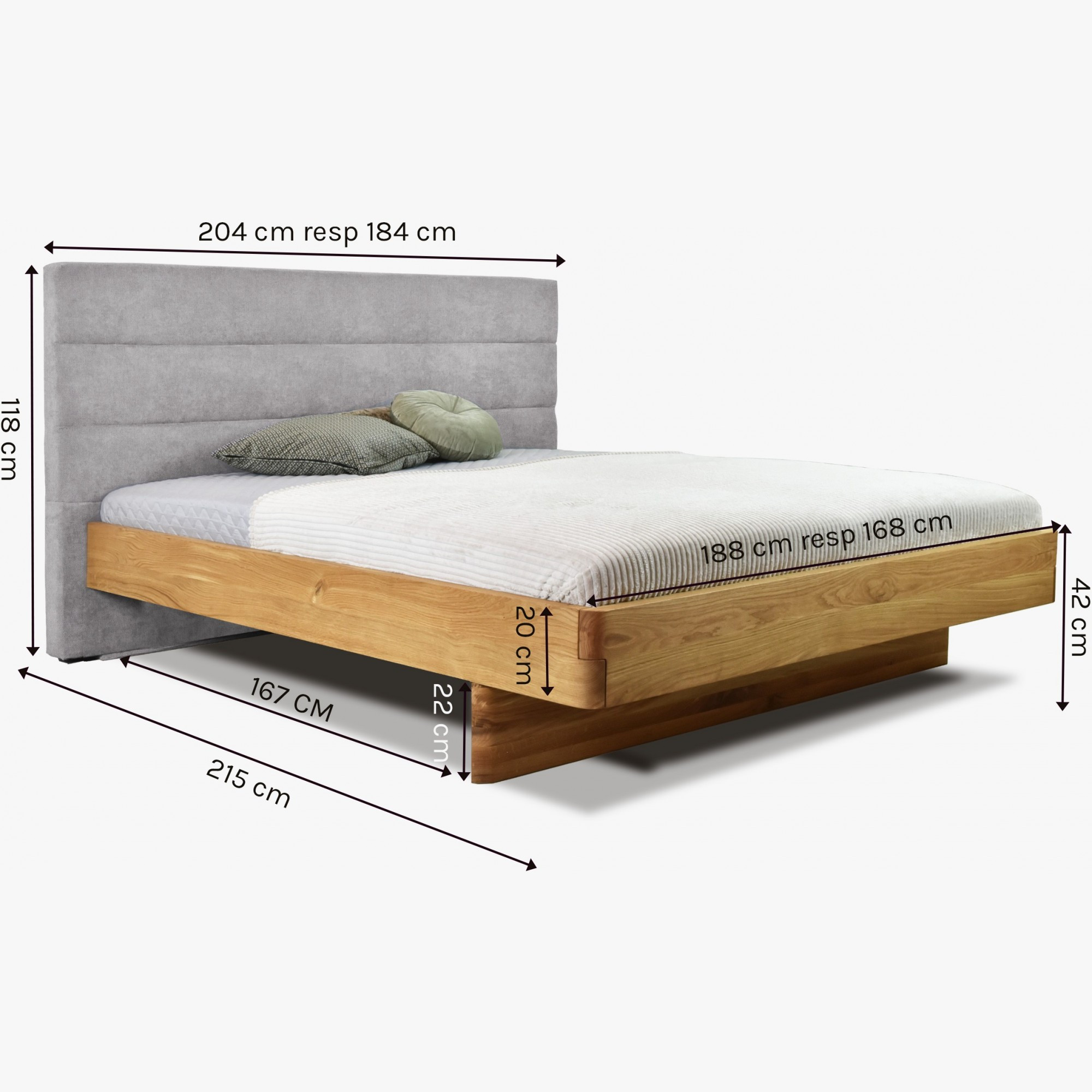 A masszív tölgyfa szerkezet természetes olajjal kezelt, amely környezetbarát és egészségre ártalmatlan. Az ágy 4 cm vastag anyagból készült, stabil és tartós, a lekerekített sarkok pedig exkluzív megjelenést biztosítanak. Méretei ideálisak: a teljes ágy szélessége 184 cm, hossza 215 cm, a fejvég magassága 42 cm a lábnál és 118 cm a fej résznél.