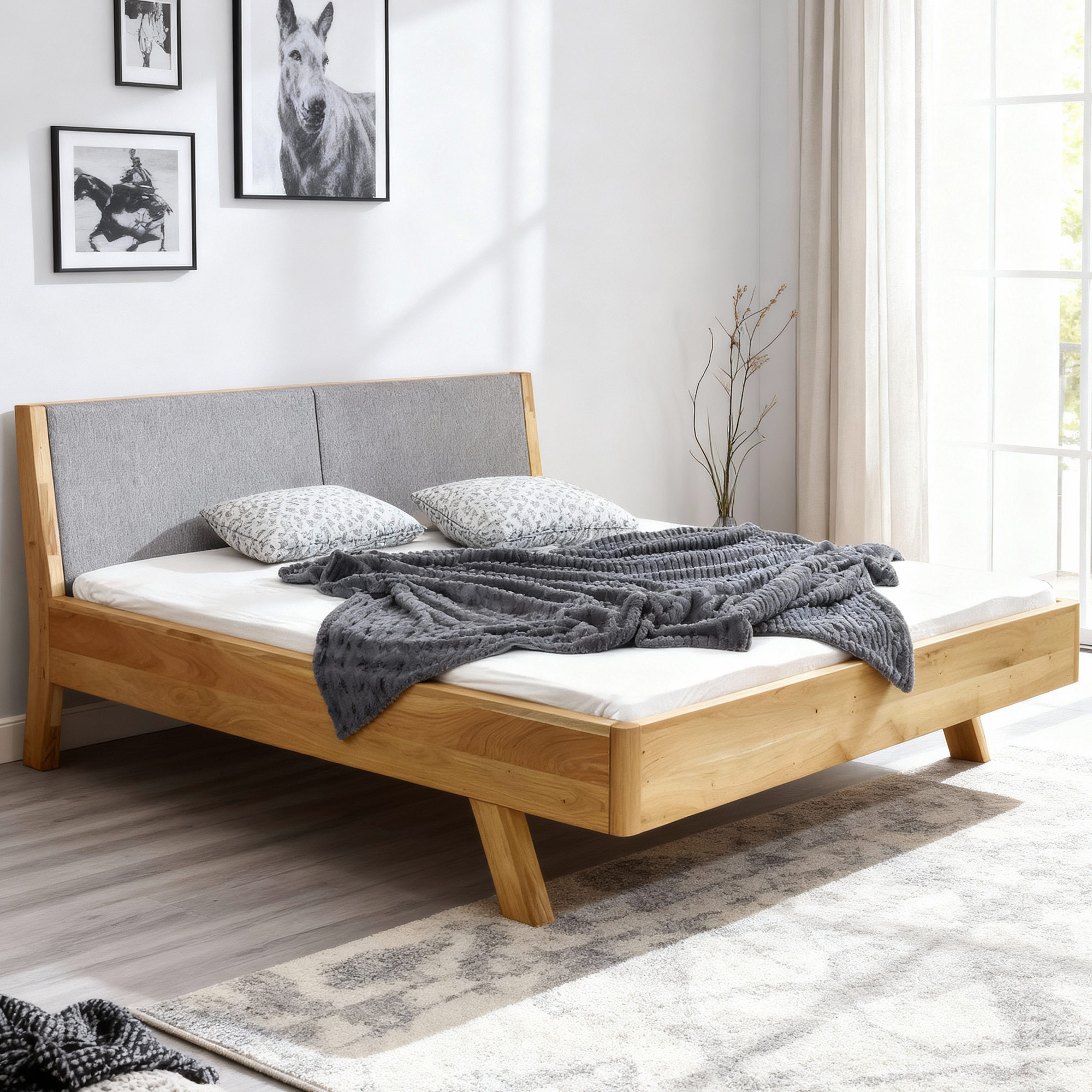 Tömör tölgy ágy szürke szövet fejvéggel 180x200 cm