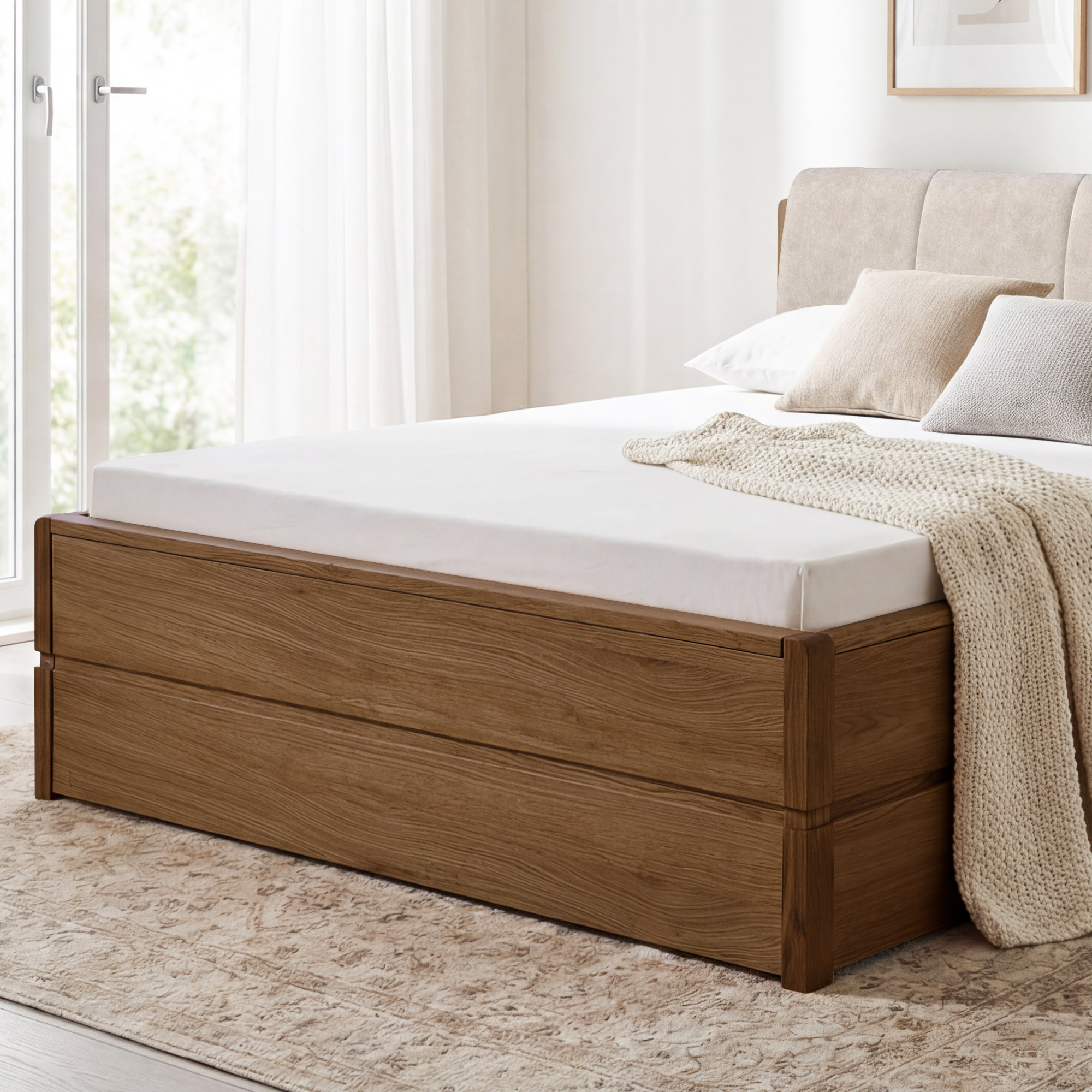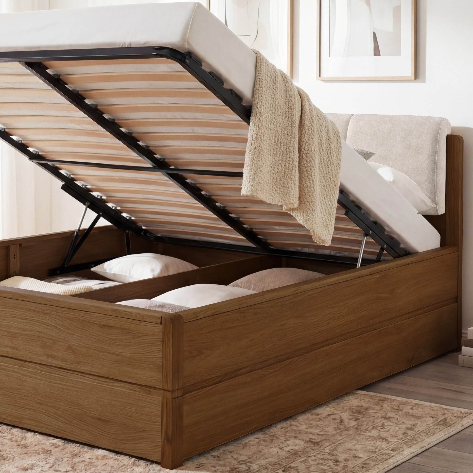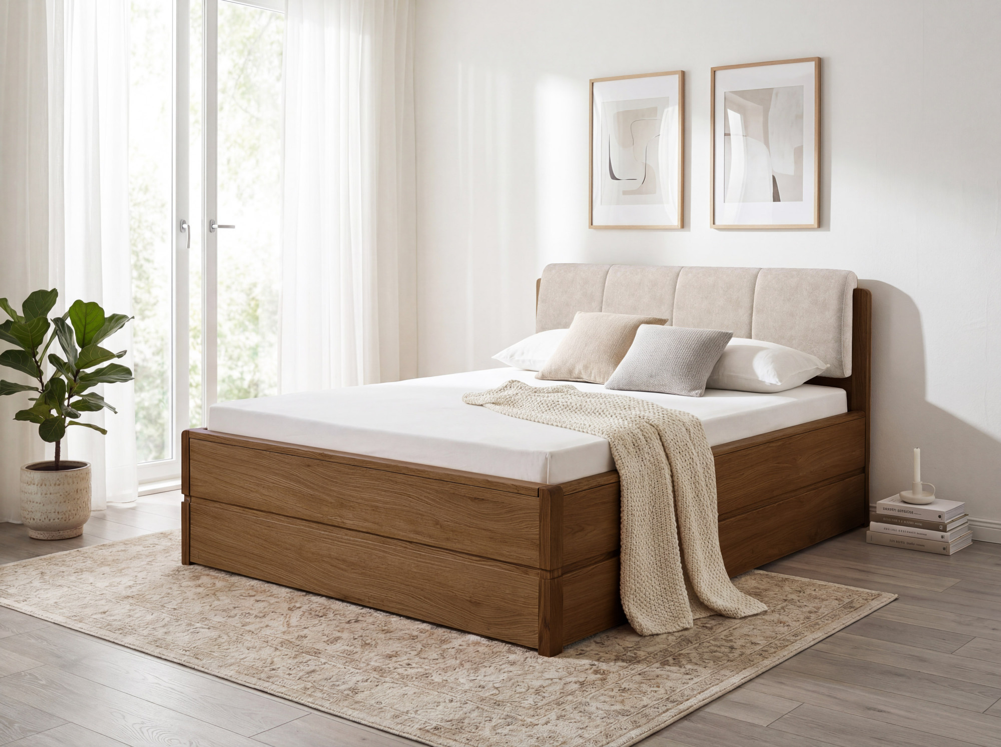 Tölgyfa ágy tárolóval 200x200 cm, pácolt tölgy, világos szövet fejvég