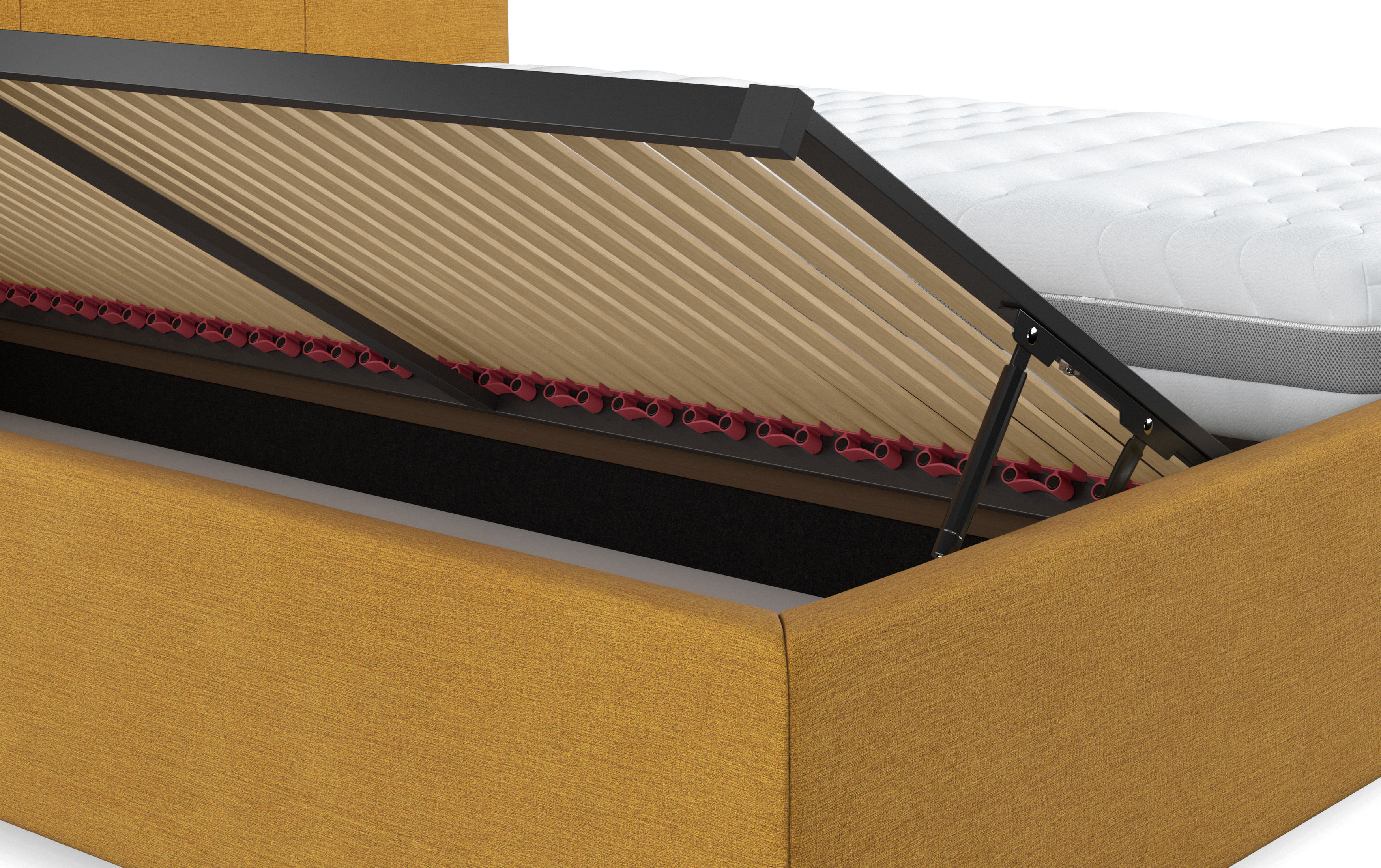 Minden teherhordó rész a belső szerkezetben tömör fából készült. A tárolófenék MDF-ből készült fehér színben. Az ágy része a minőségi sárga FINE FLATWEAVE típusú anyag lenhatású megjelenéssel és vízlepergető kezeléssel, amely kellemes tapintású és nagyon strapabíró – martindale értéke akár 100 000 ciklus. Az anyagot tisztítsa baba szappannal.