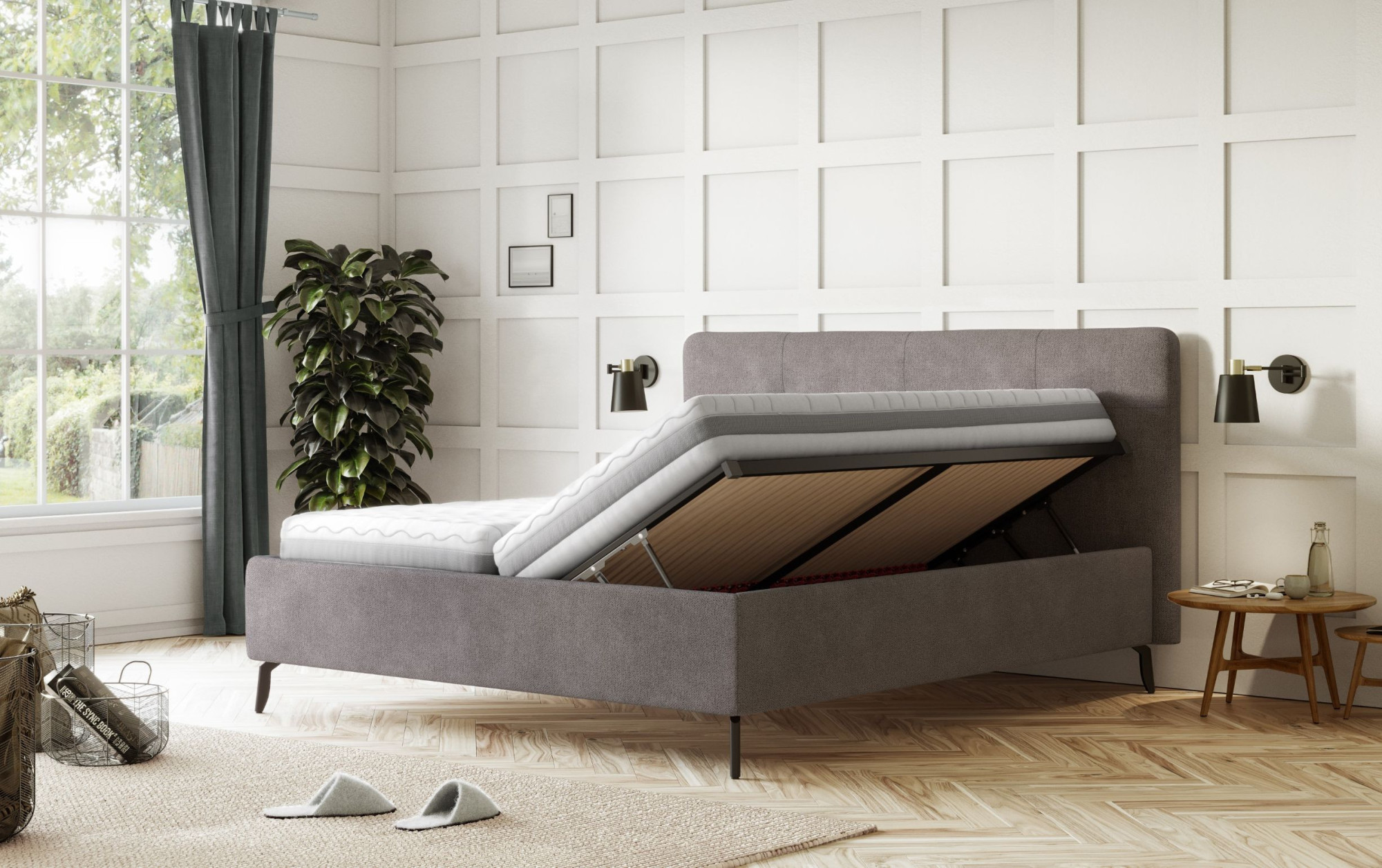 Praktikus tárolóhely: Mindig rendet szeretne a hálószobában? Ez a kárpitozott ágy tárolóhellyel megoldja azt. A nagy tároló doboz, amely könnyen hozzáférhető a felnyíló lamellás rácson keresztül, elegendő helyet kínál ágyneműk, szezonális ruhák vagy egyéb elrejteni kívánt tárgyak számára. Ráadásul a tárolóhely két rekeszre van osztva, így könnyedén fenntarthatja a rendet.