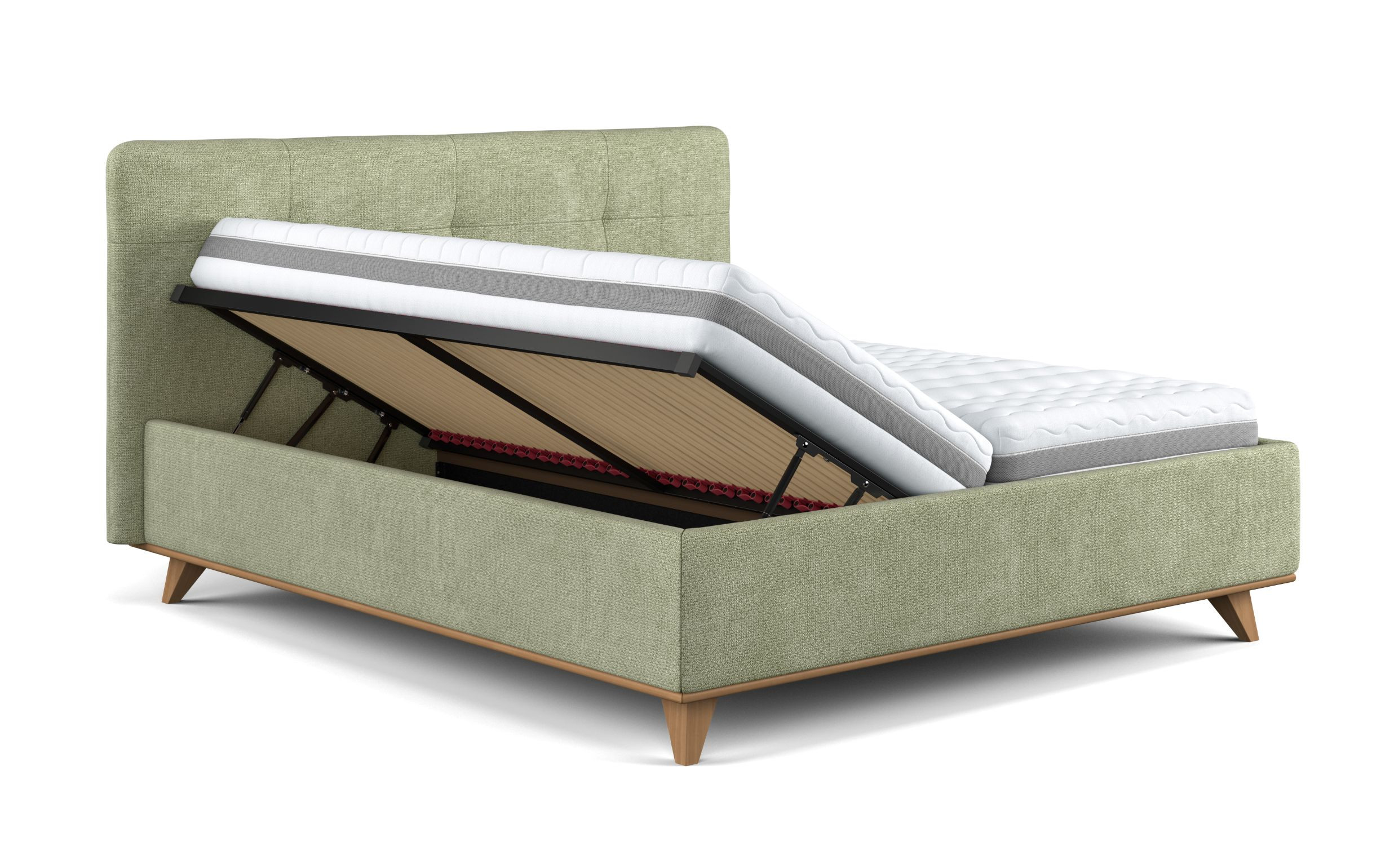 A szerkezet része egy praktikus tároló is, amely oldalt gázrugók segítségével nyílik. Elég helyet kínál ágyneműnek, takaróknak vagy szezonális ruházatnak, így segít rendezetten és átláthatóan tartani a hálószobát.